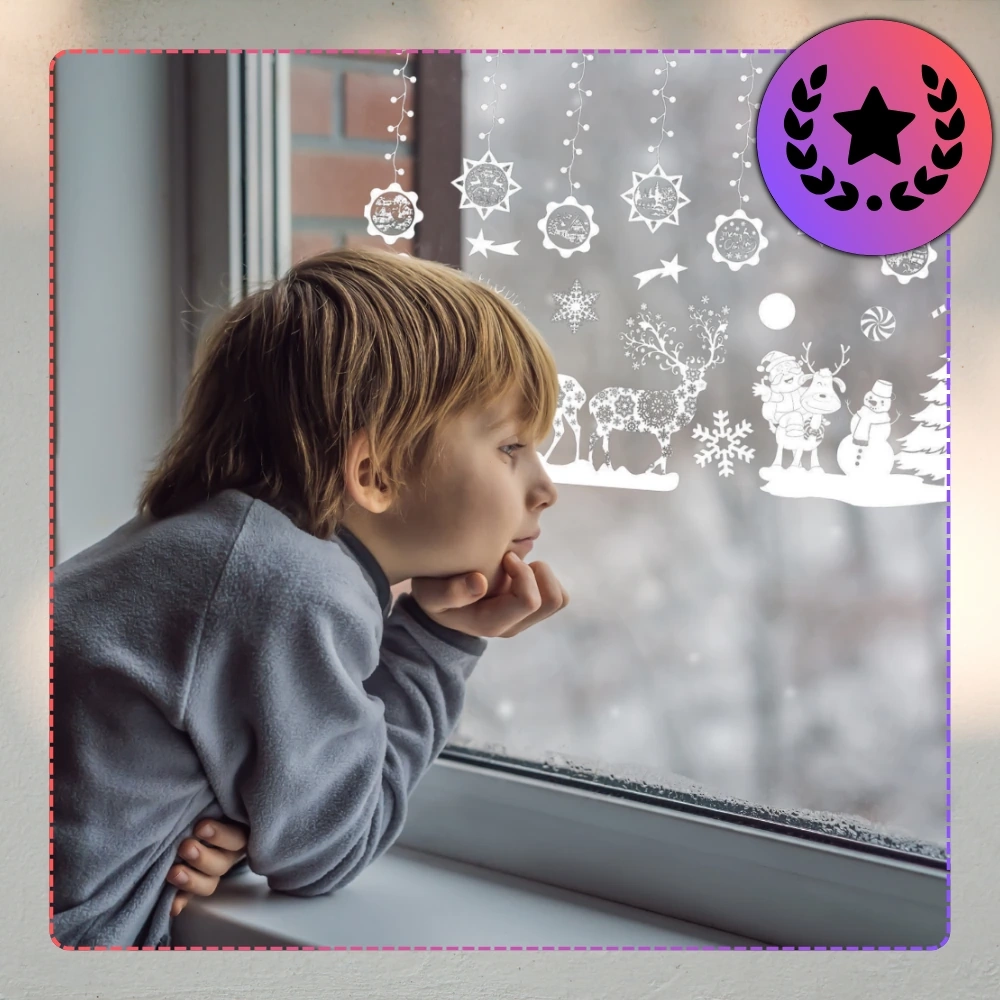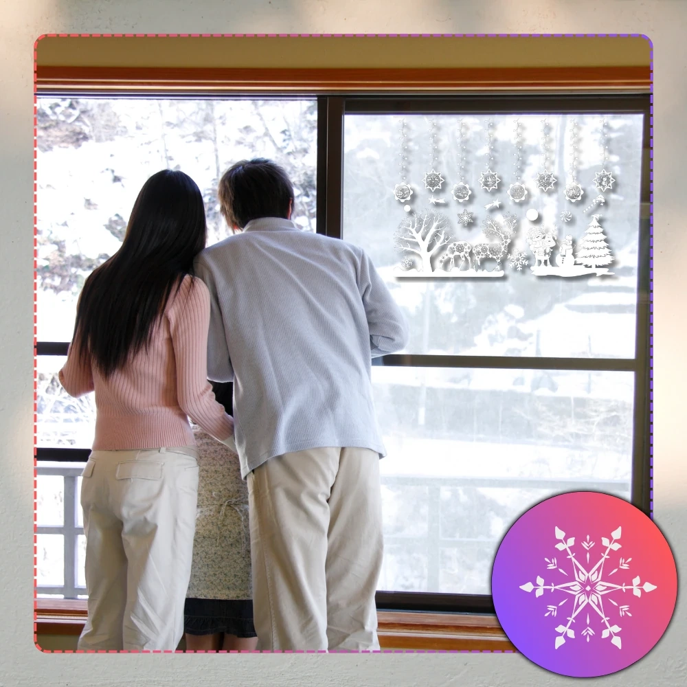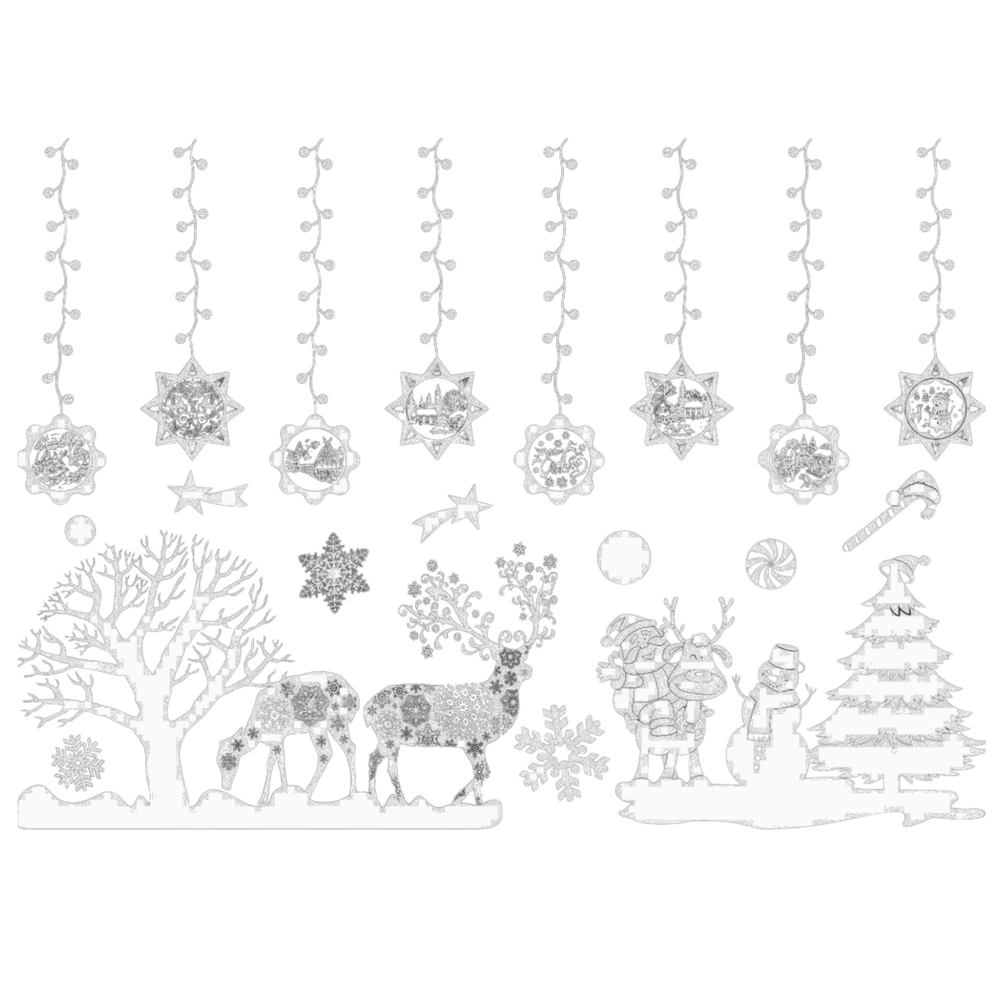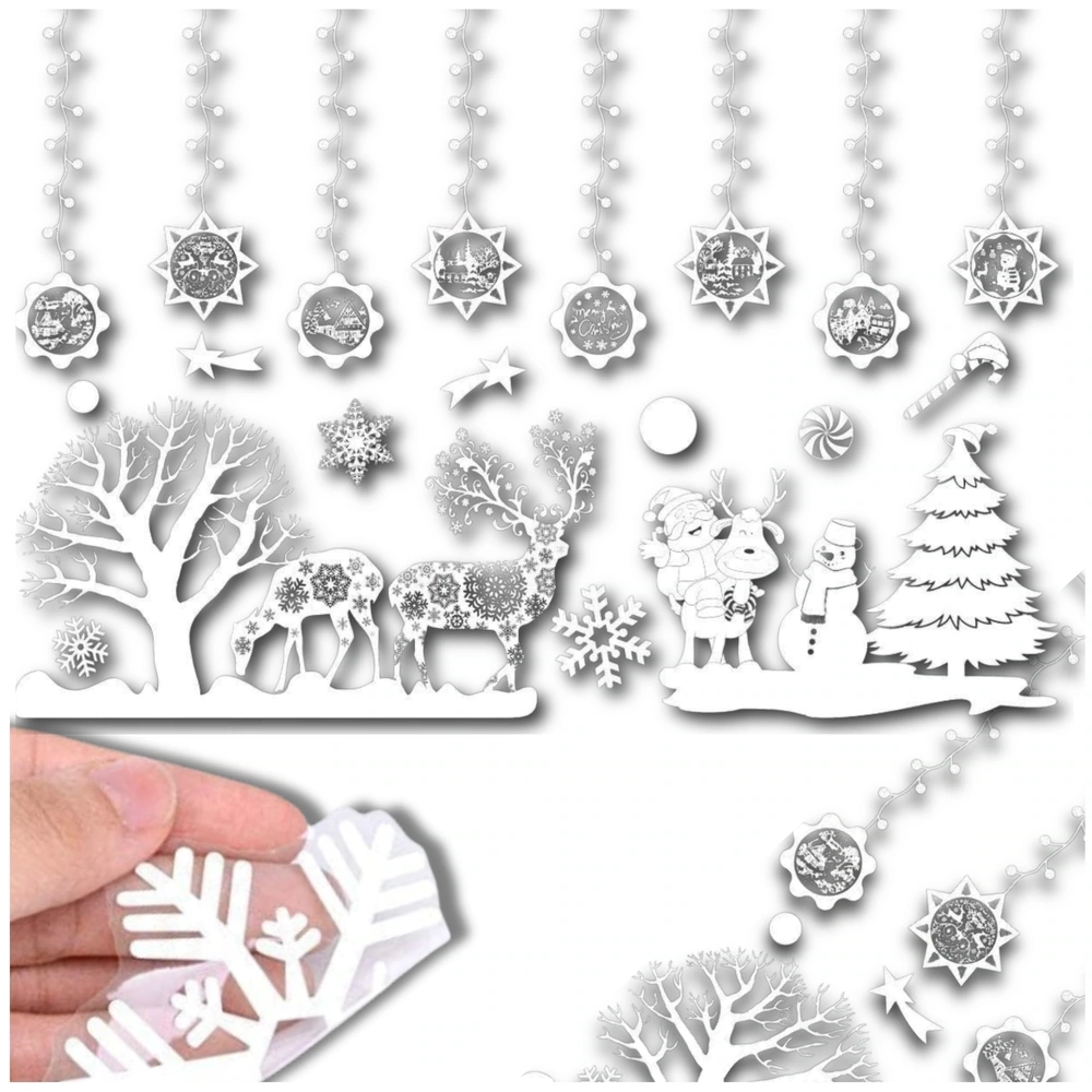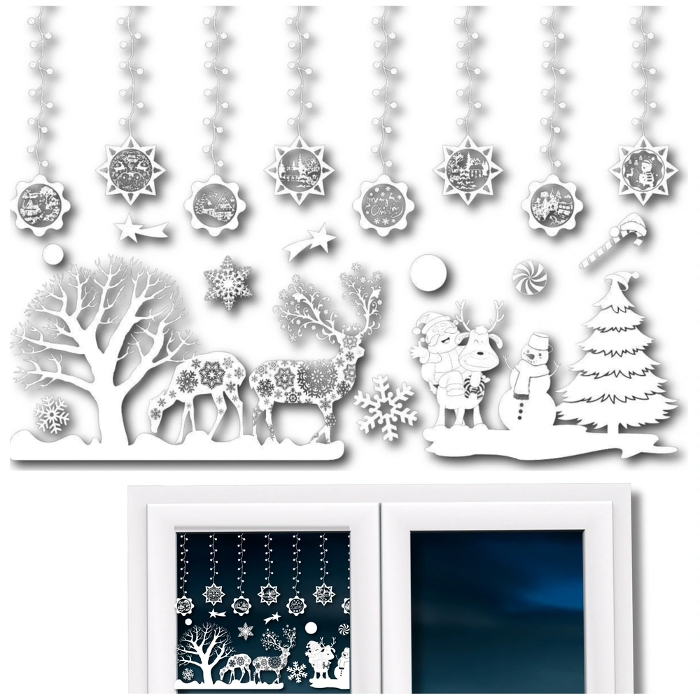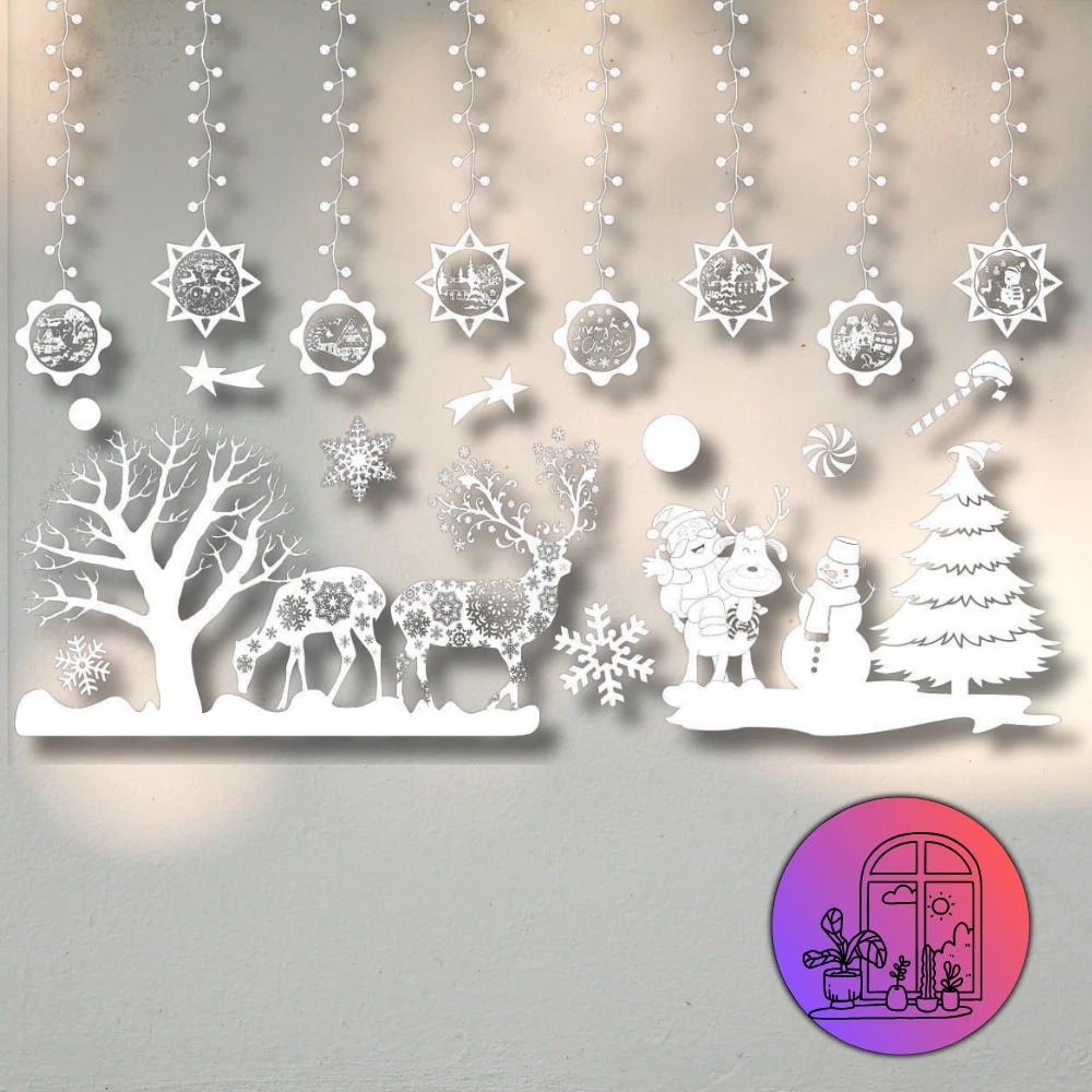 Autocolant pentru fereastră de Crăciun - ren, agățat de Crăciun, brad și fulgi de zăpadă