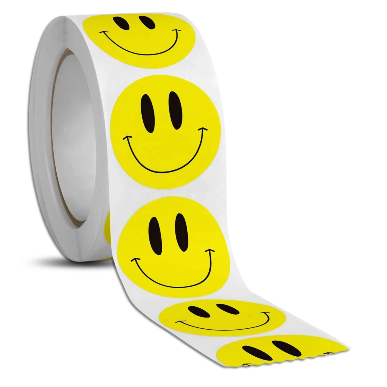 Culori și design: autocolante clasice galbene cu o față zâmbitoare; suprafață lucioasă cu culori vii, de lungă durată