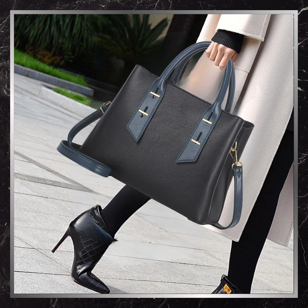 Geanta de mână de înaltă calitate. piele ecologică (PU), care imită perfect pielea naturală și este rezistentă la deteriorare și ușor de întreținut. Negrul profund este rupt de detalii elegante într-o nuanță de albastru - cusături subtile, bretele decorative și ornamente aurii, care subliniază caracterul luxos al genții.
