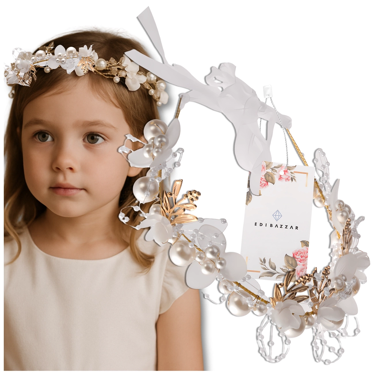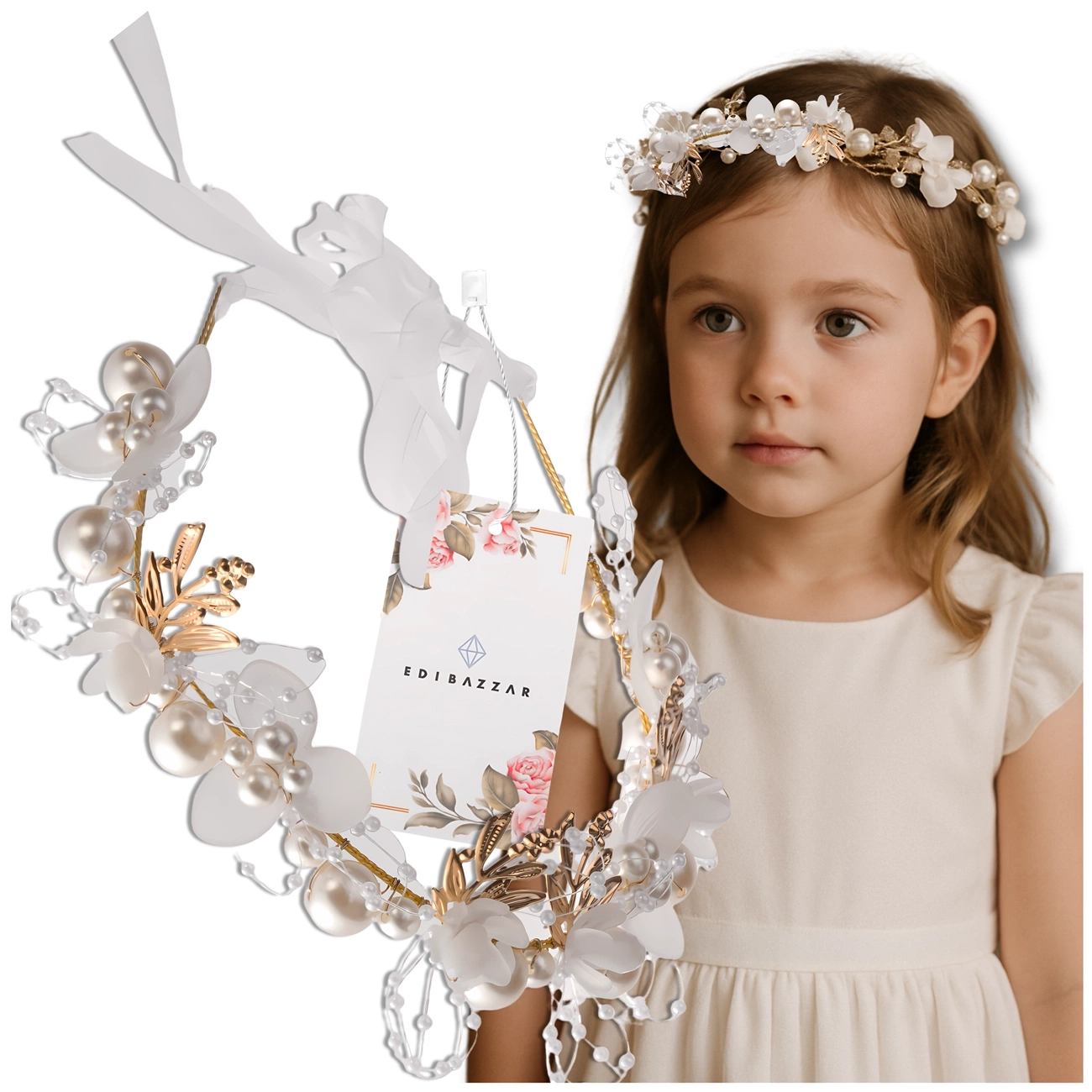 Bandita alba pentru copii tiara auriu coronita zirconi perle