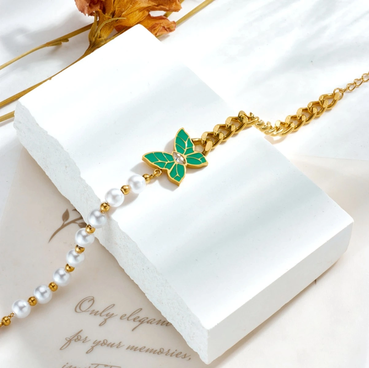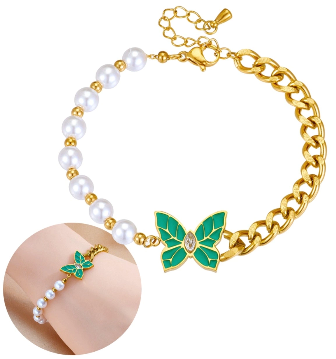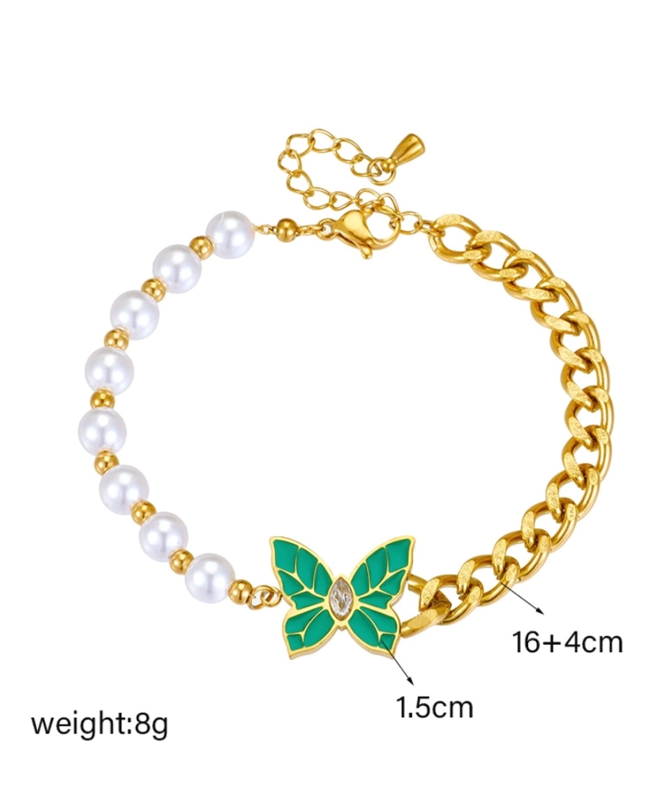 Brățara cu perle din oțel chirurgical auriu pe care o oferim constă din două părți diferite, conectate de un fluture auriu frumos, cu un element din zirconiu și email verde pe aripi.