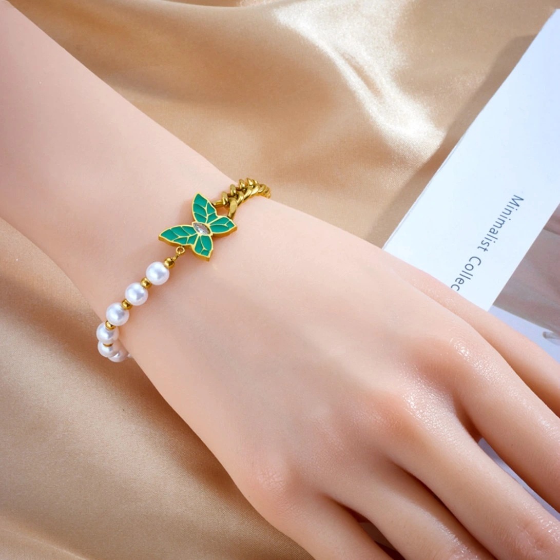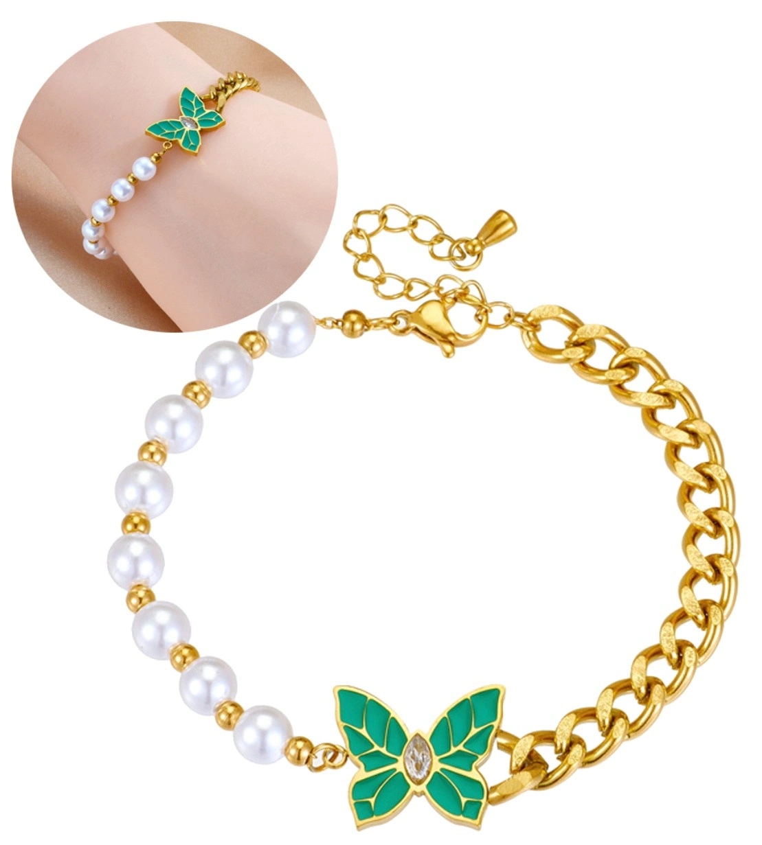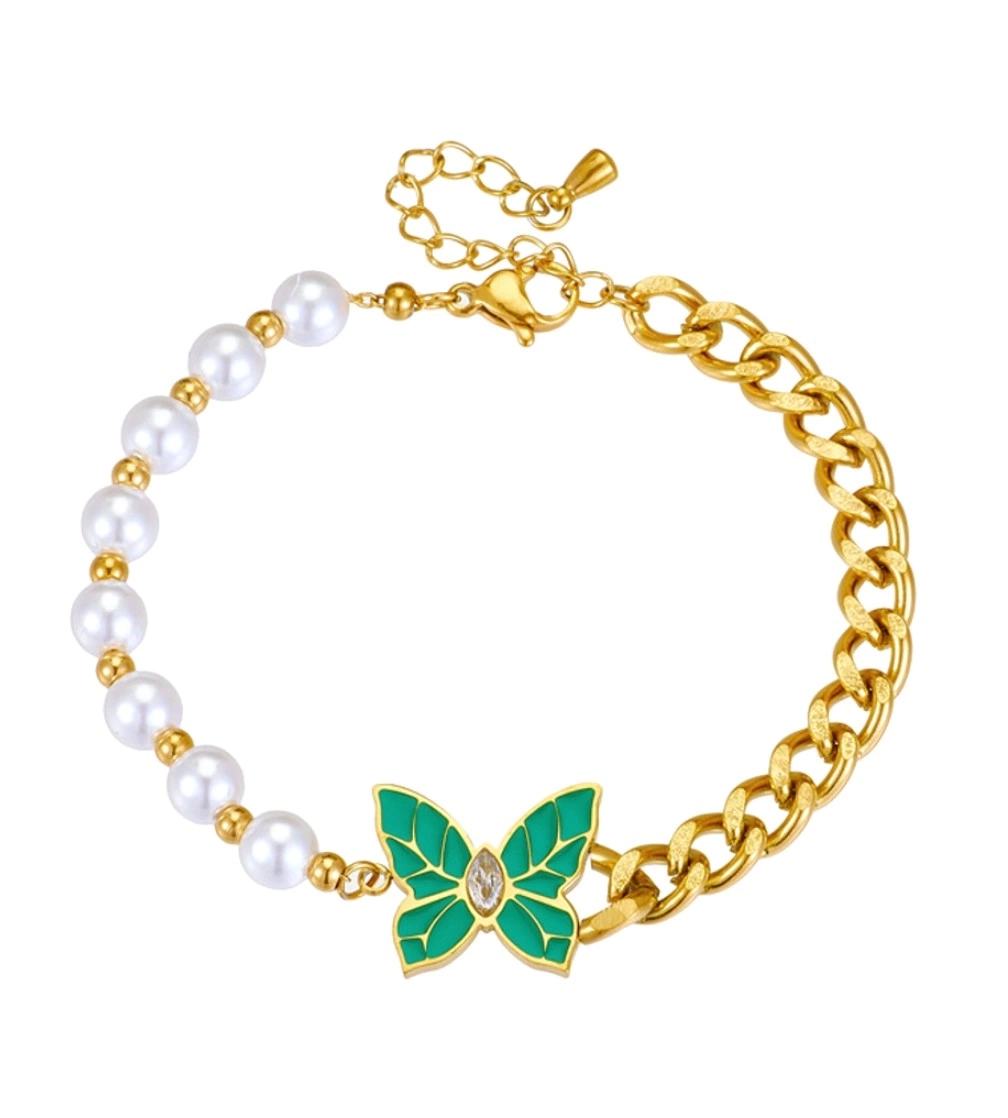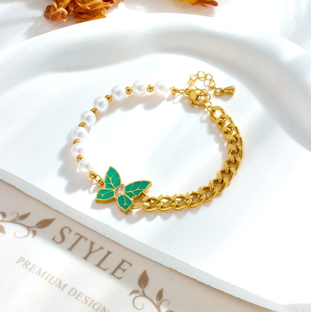 Brățara cu perle din oțel chirurgical auriu pe care o oferim constă din două părți diferite, conectate de un fluture auriu frumos, cu un element din zirconiu și email verde pe aripi.