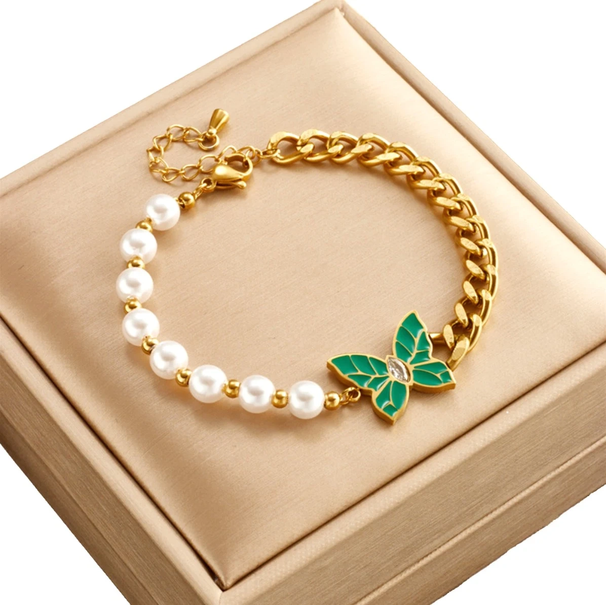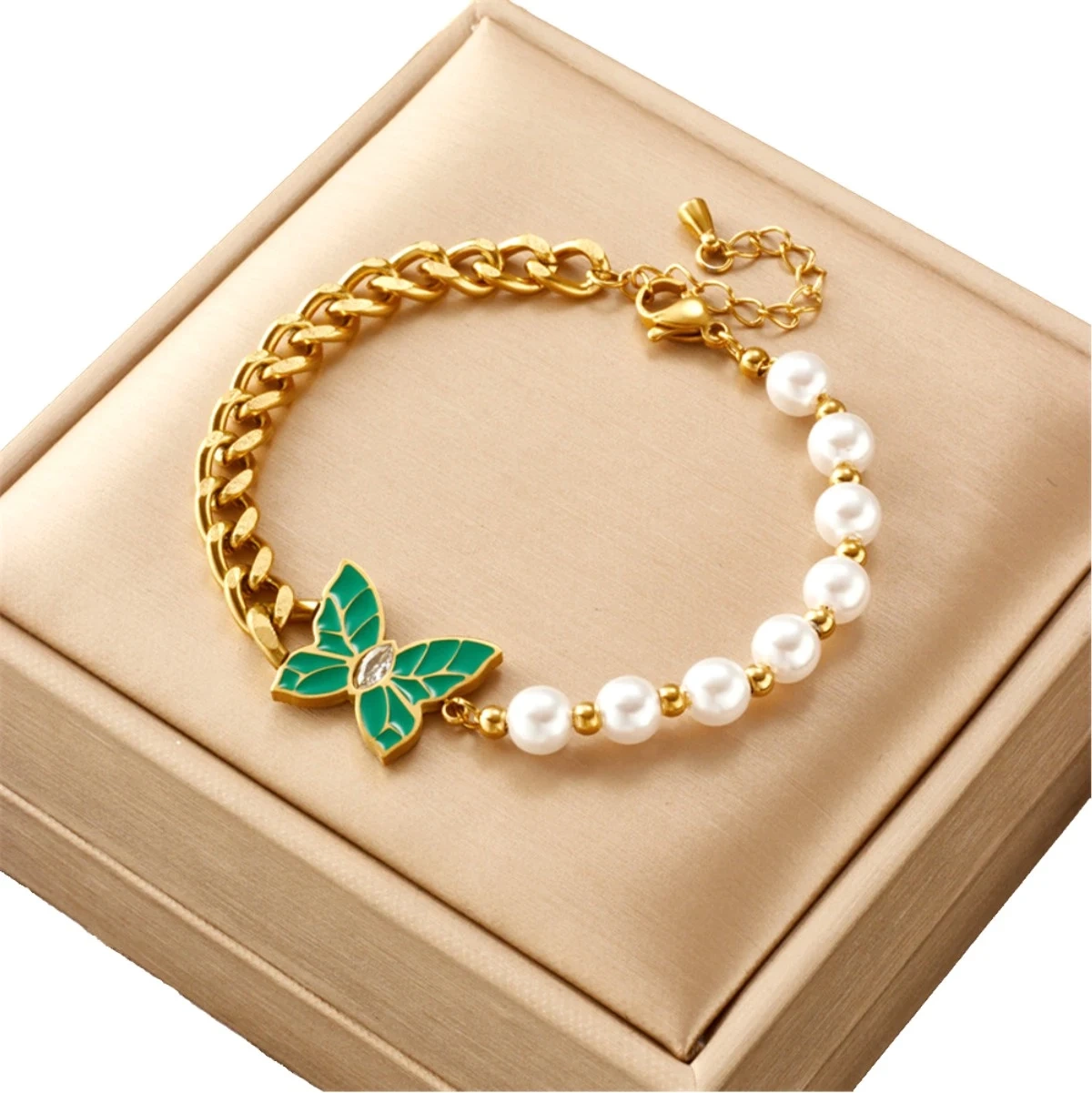 Brățară aurie cu perle din oțel chirurgical fluture - un ornament fermecător