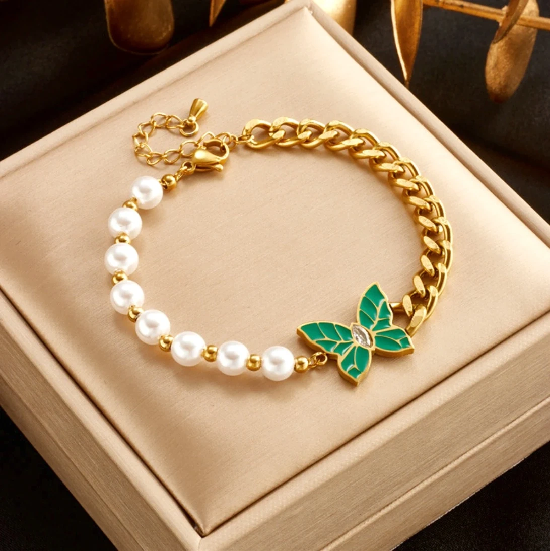 Brățara fluture din oțel chirurgical aurit cu perle , extrem de feminină, este o podoabă care poate fi purtată de femeile de toate vârstele. Bijuteria poate fi un accesoriu perfect pentru orice styling, indiferent de anotimp.