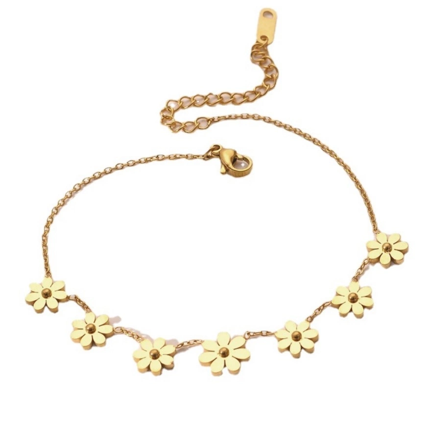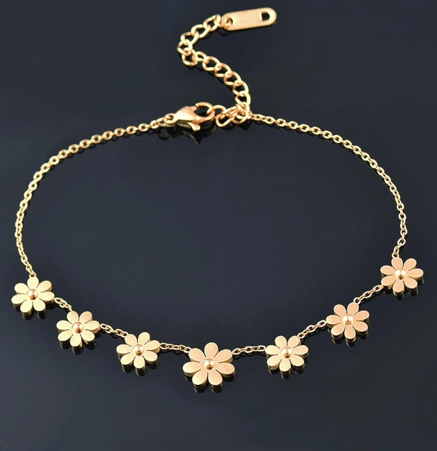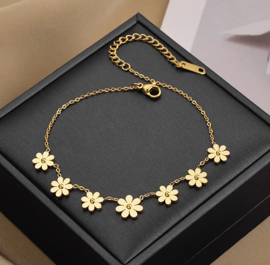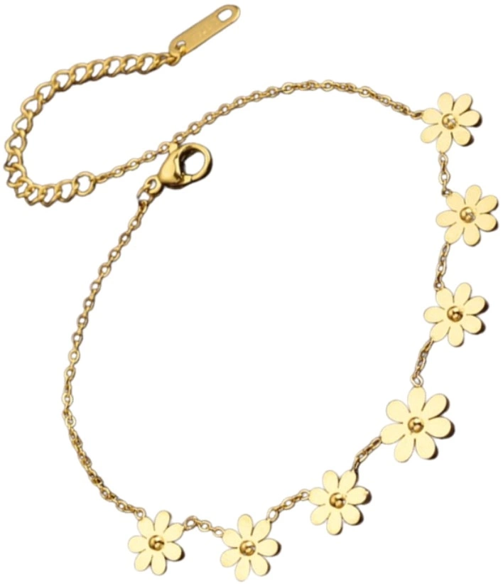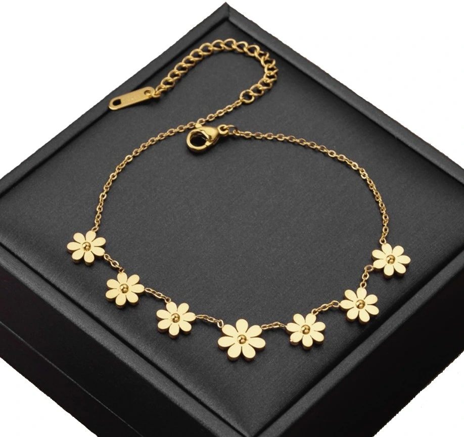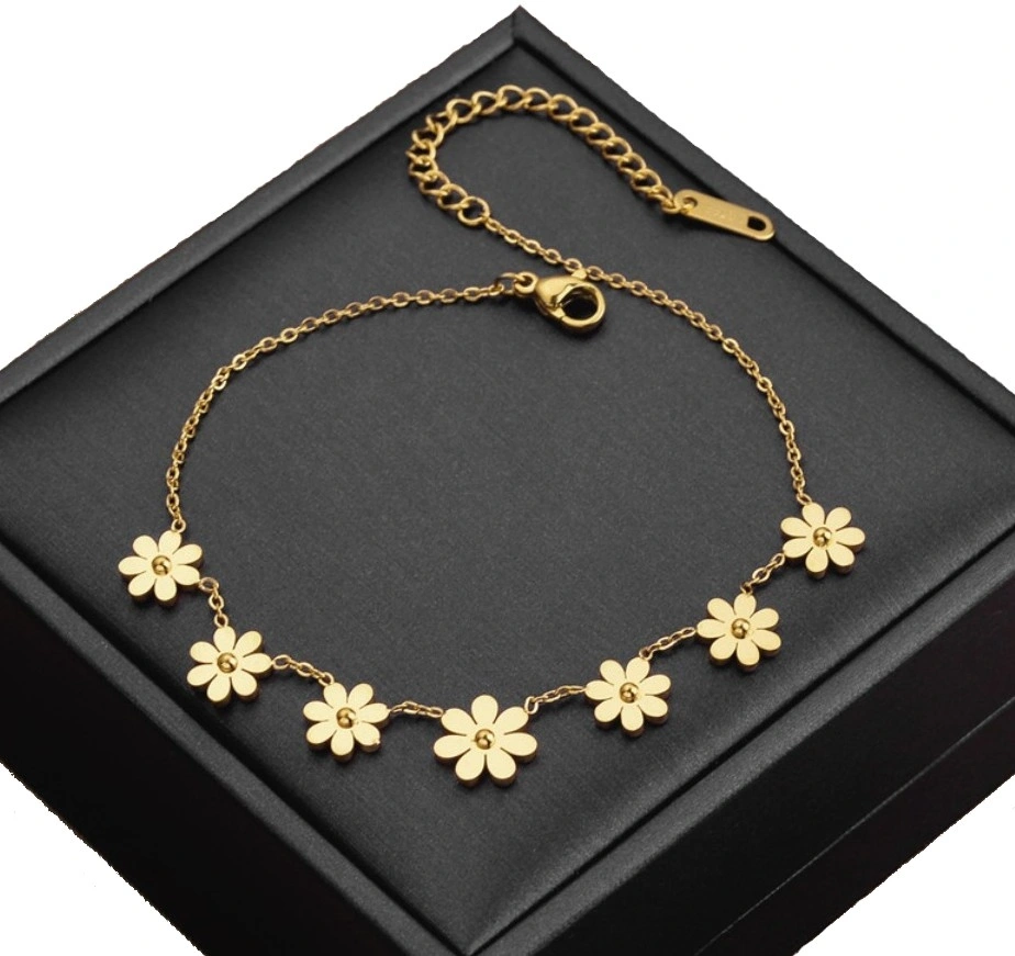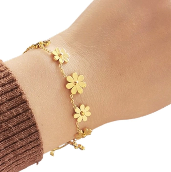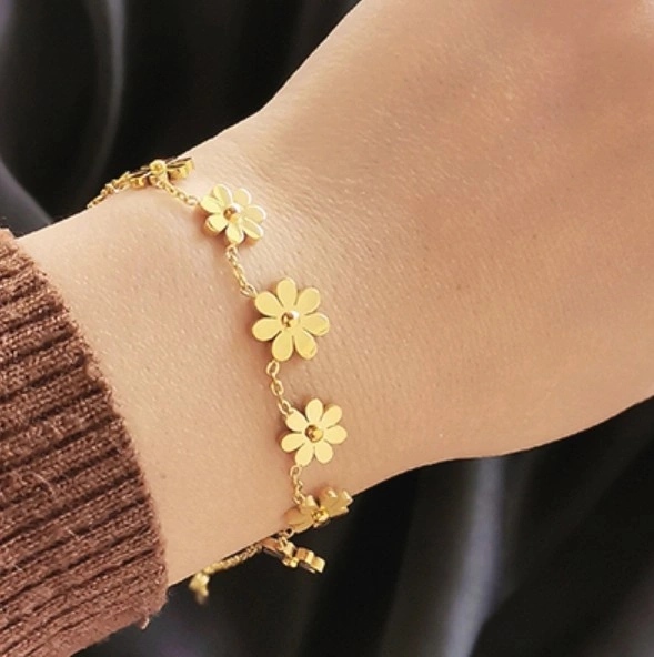 Brățara cu flori aurii din oțel chirurgical placat cu aur recomandată de magazinul nostru online este un produs la modă, care este admirat de femeile de toate vârstele. Va decora magnific orice ținută, indiferent dacă este o rochie sau o bluză elegantă, lejeră.