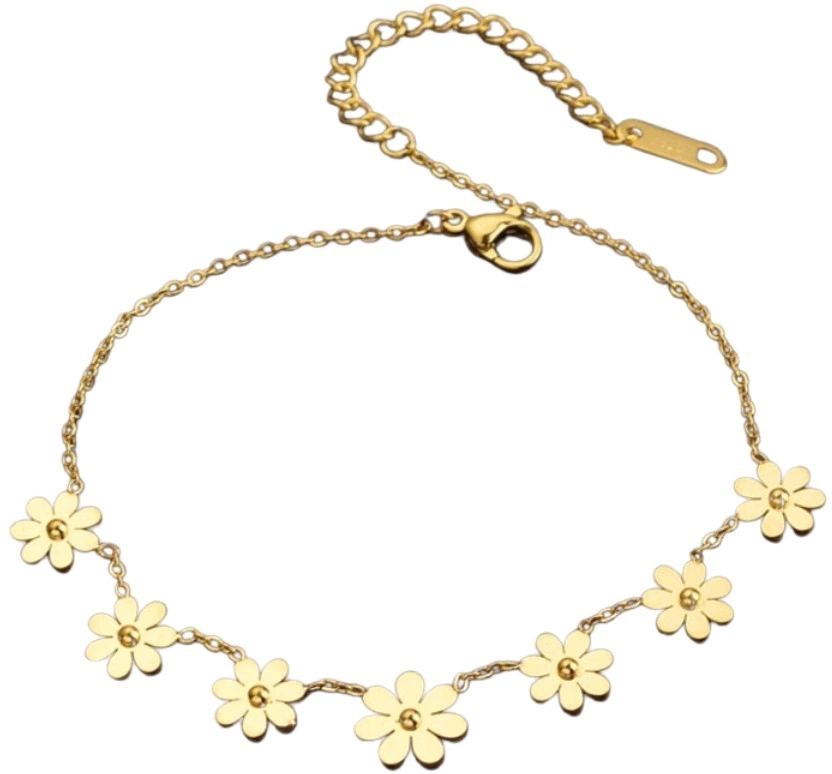 Brățara cu flori aurii placate cu aur pe care o recomandăm constă dintr-un lanț de brățară, care este decorat cu șapte etichete mici. Elementele individuale ale ornamentului sunt distanțate uniform. Florile de dimensiuni mici au centrele umplute cu bile mici. Toate etichetele sunt de culoare aurie. Cea mai mare are 10 cm în diametru. Cele mai mici au 8 mm fiecare.