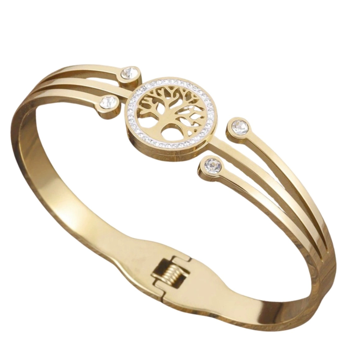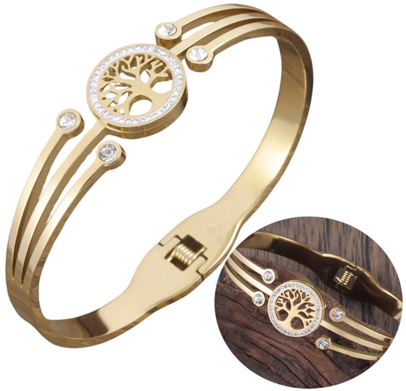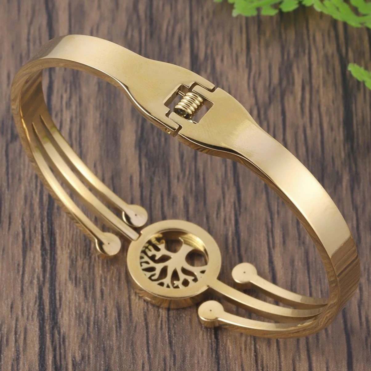 Bratara din otel chirurgical placat cu aur, rigida, cerc copac auriu