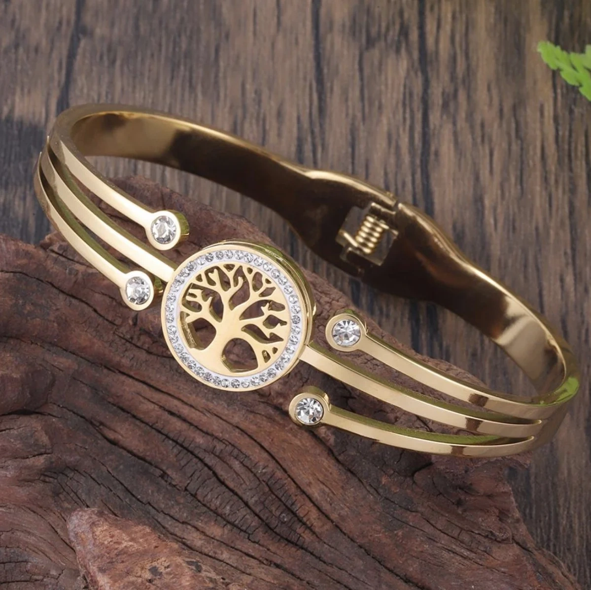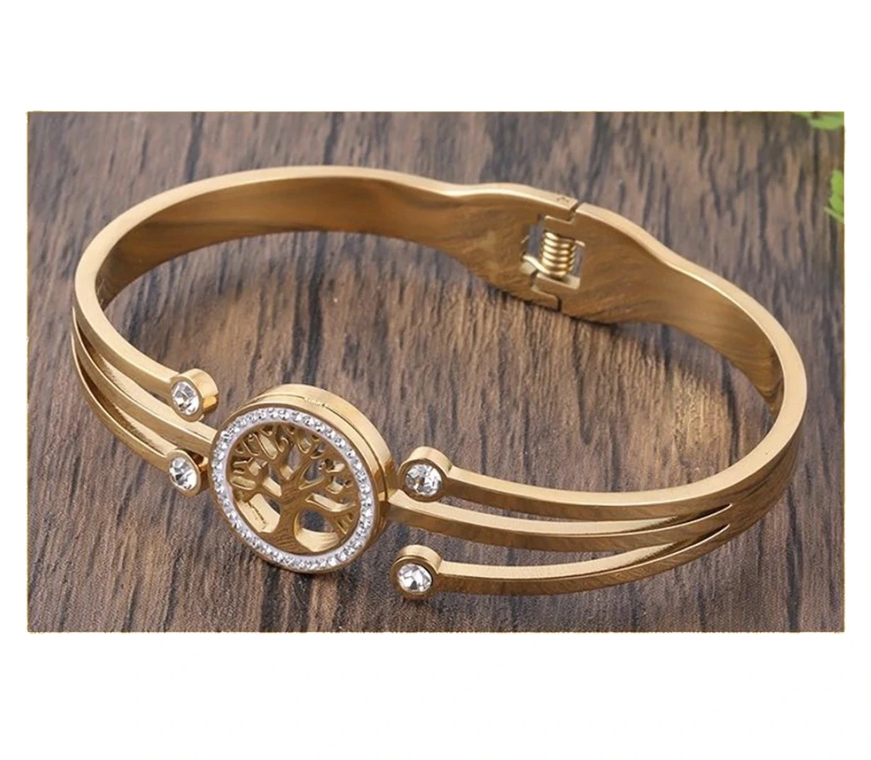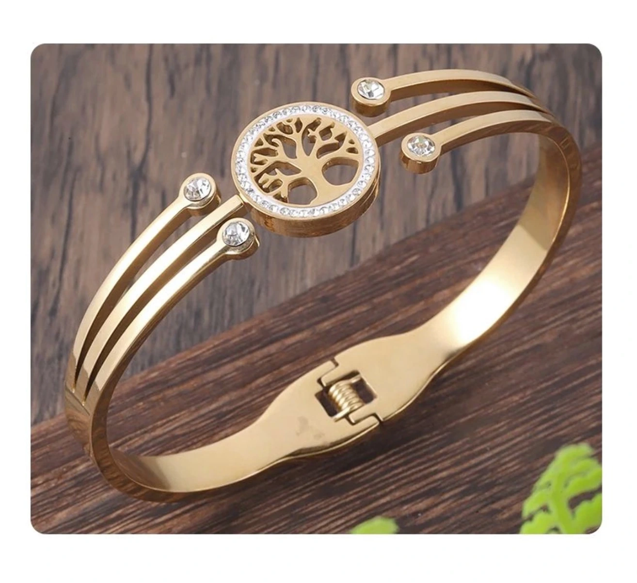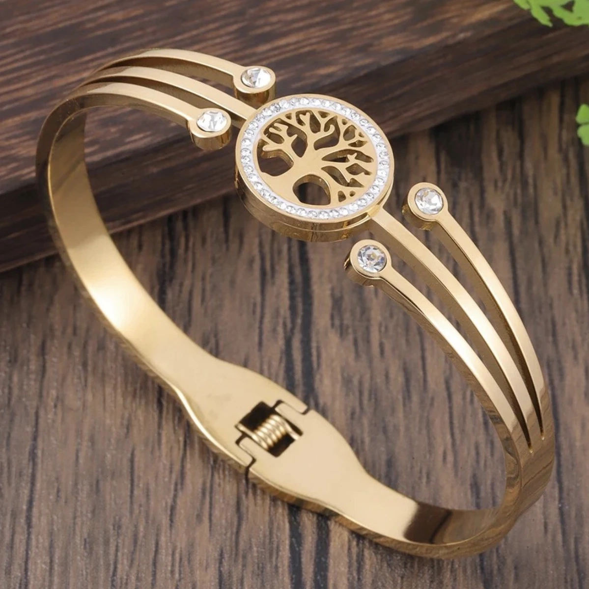 Bratara din otel chirurgical placat cu aur, rigida, cerc copac auriu