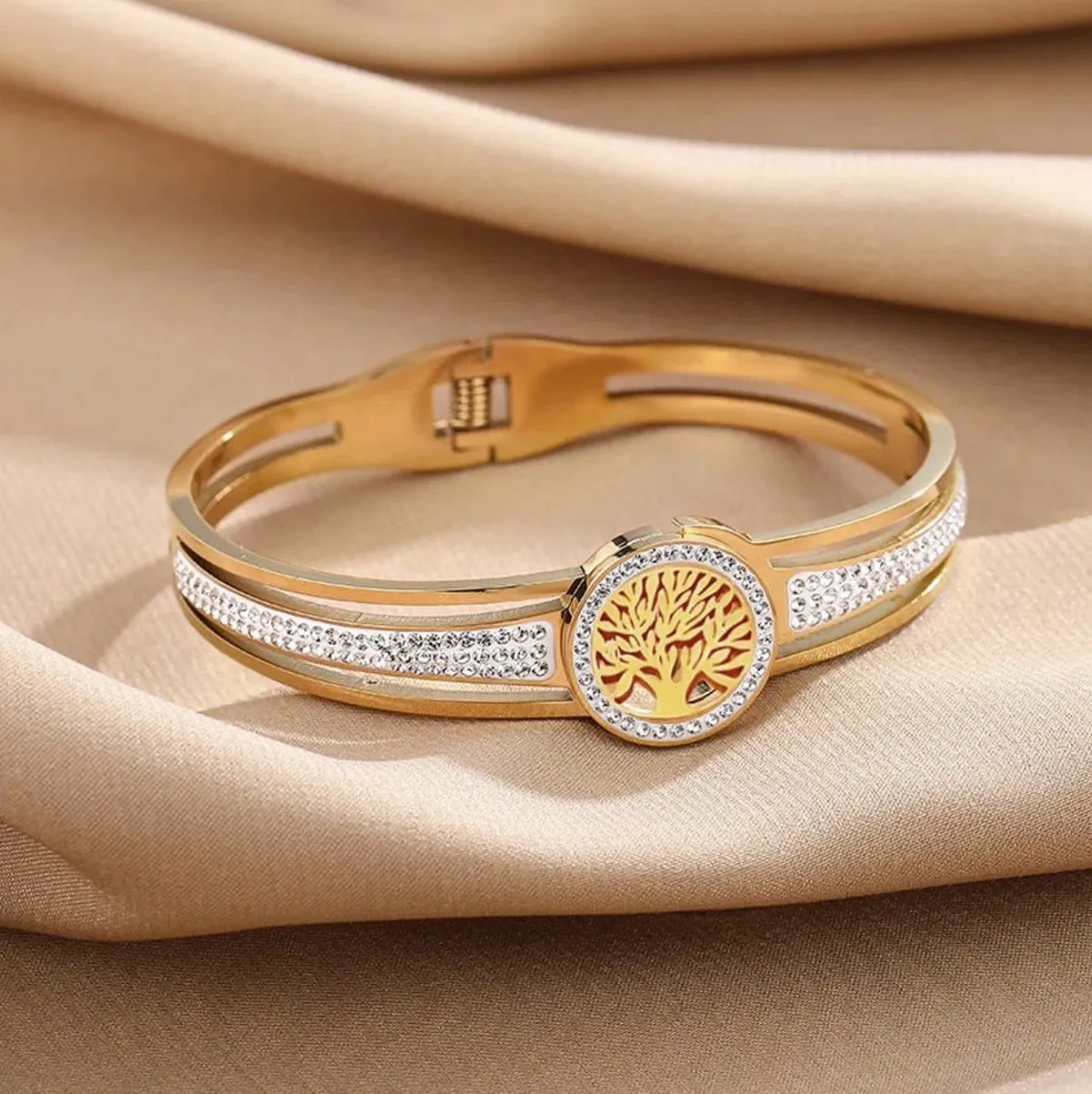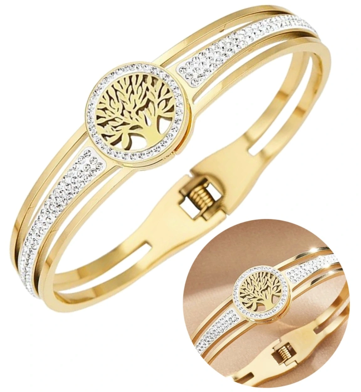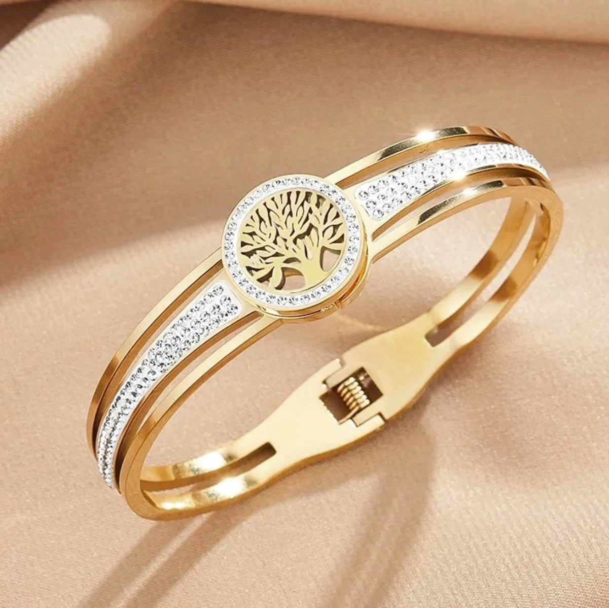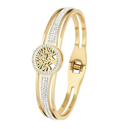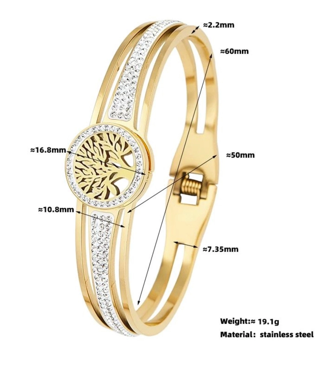 Brățara noastră din oțel chirurgical placat cu aur cu designul copacului vieții este alegerea perfectă pentru orice femeie care caută bijuterii sofisticate, dar versatile. Perfectă ca un cadou sau pentru a o adăuga la propria colecție. Comandați acum și adăugați o notă de lux look-ului dvs. de zi cu zi!