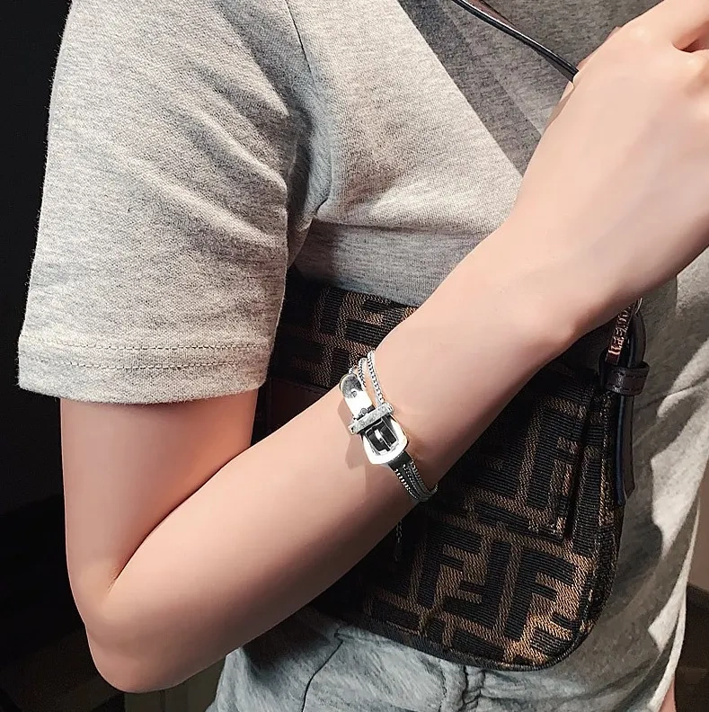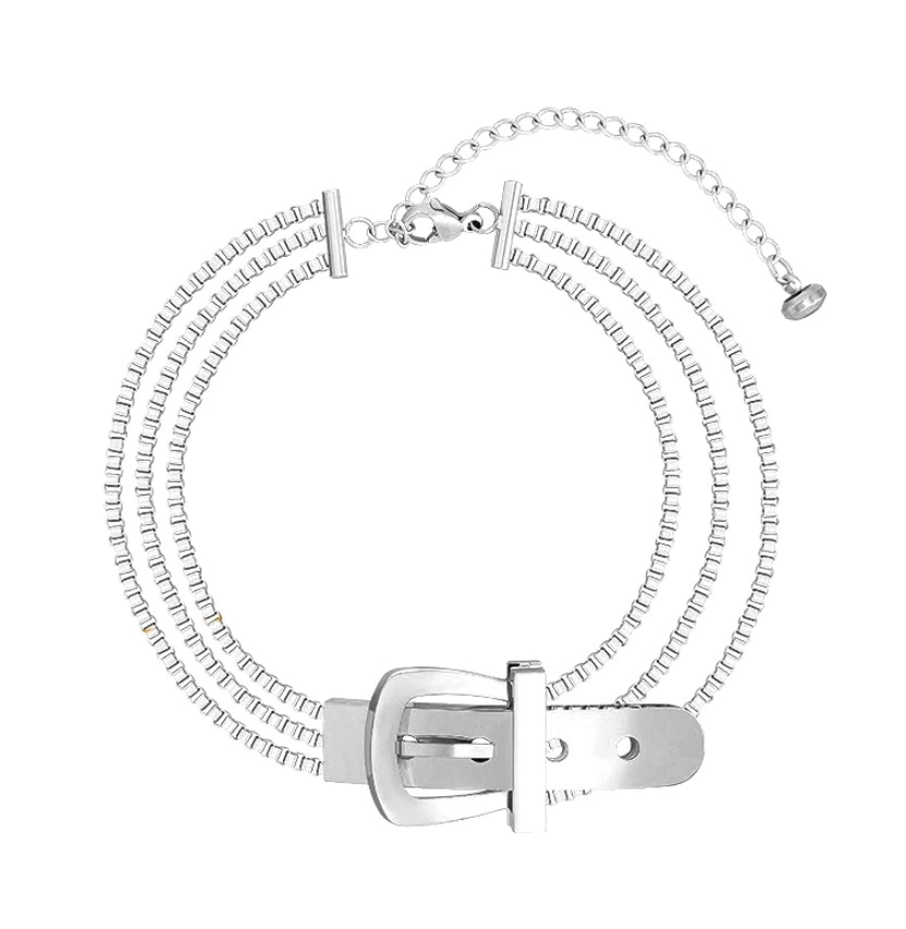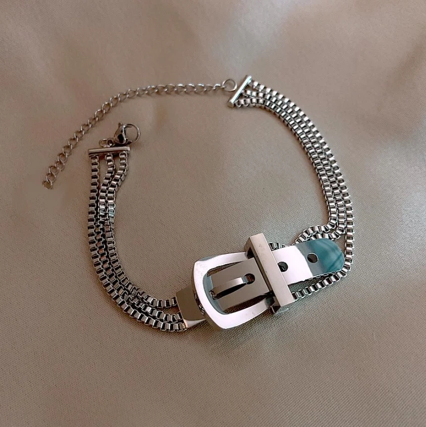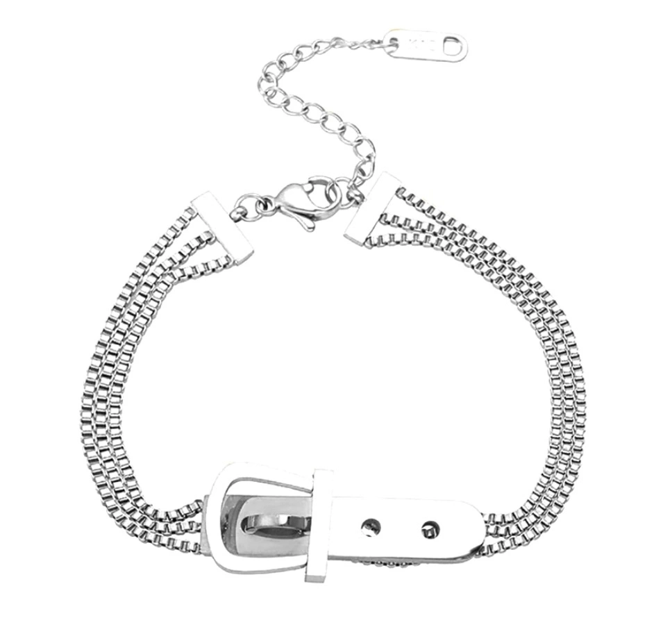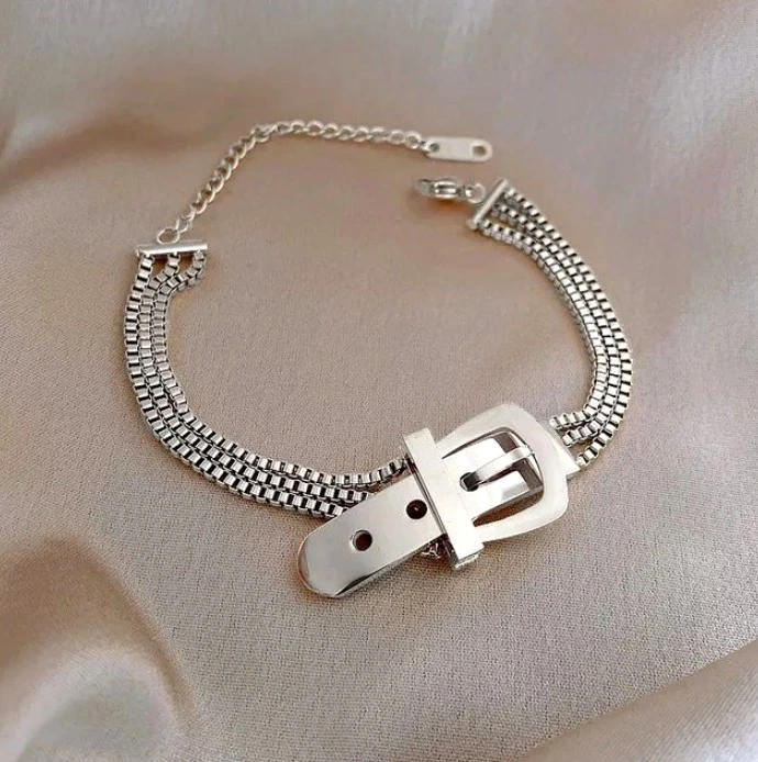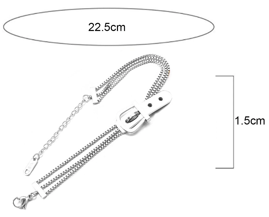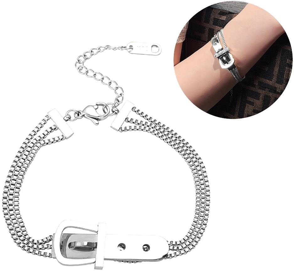 Designul său neobișnuit atrage atenția. Circumferința este alcătuită din 2 părți formate din 3 lanțuri mici conectate de un element decorativ care seamănă cu o cataramă de curea mare. Întregul este argintiu, ceea ce cu siguranță va atrage femeile care apreciază ornamentele mai puțin evidente și ostentative.