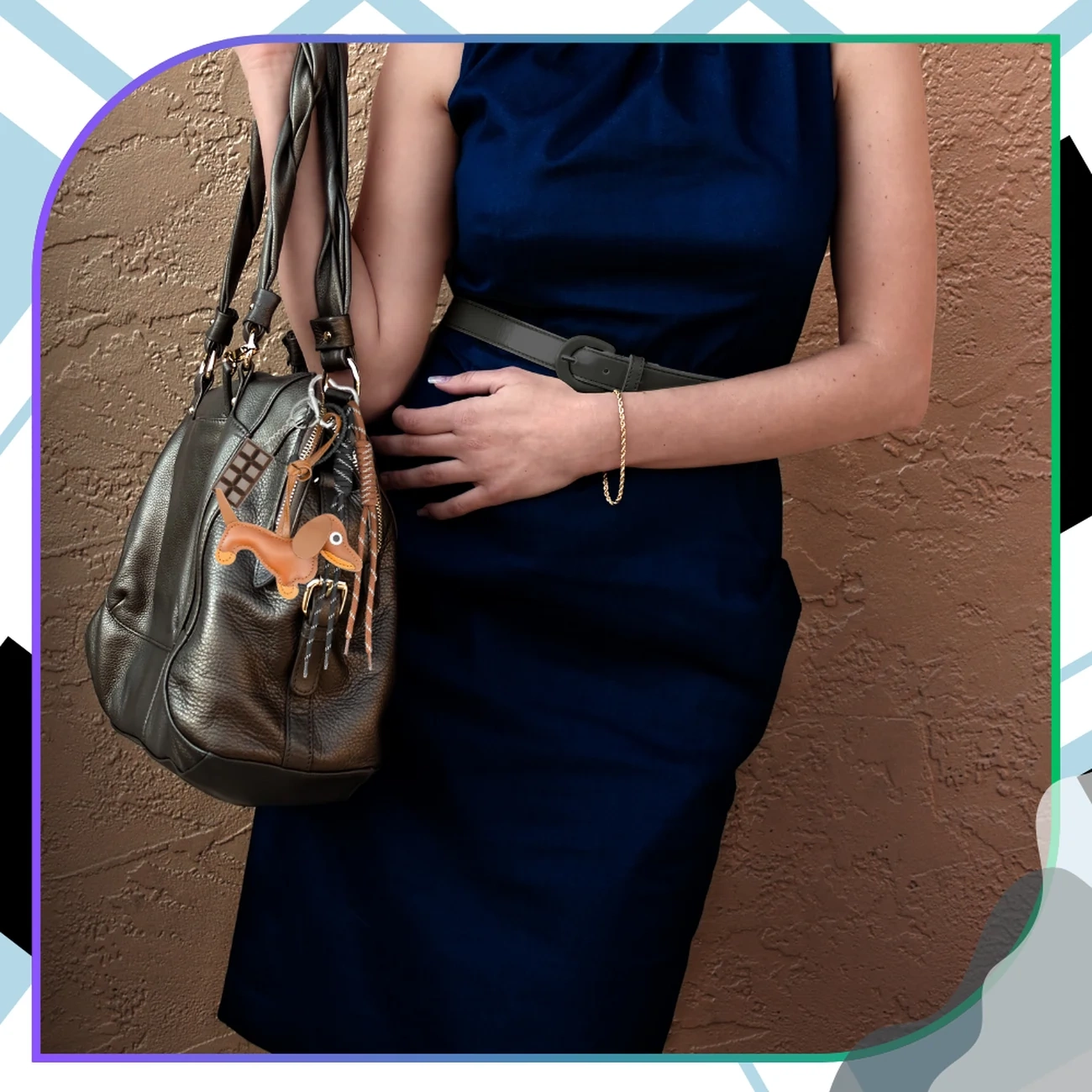 Acest fermecător breloc de geantă cu motiv teckel și o tabletă de ciocolată este combinația perfectă de stil, funcționalitate și design original. Fabricat din 100% piele ecologică, încântă prin măiestria meticuloasă și atenția la fiecare detaliu. Acest accesoriu unic nu numai că vă va decora cheile, geanta sau rucsacul, dar va da și accesoriilor de zi cu zi un caracter unic.
