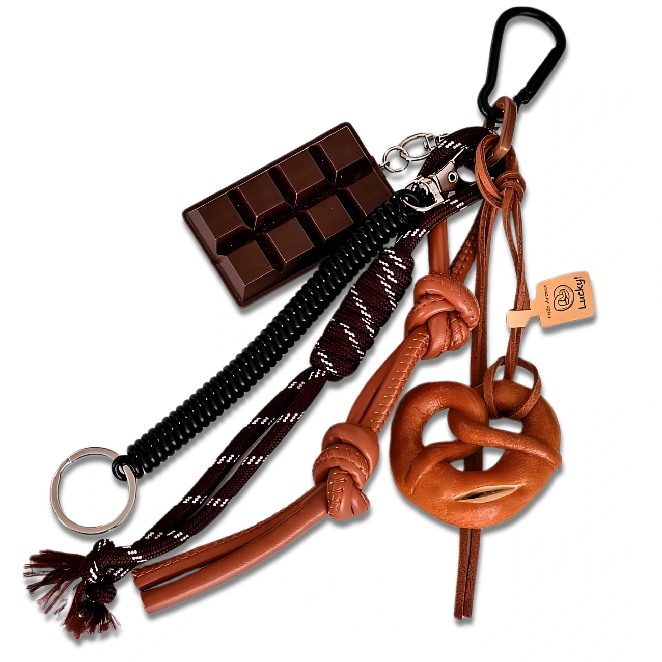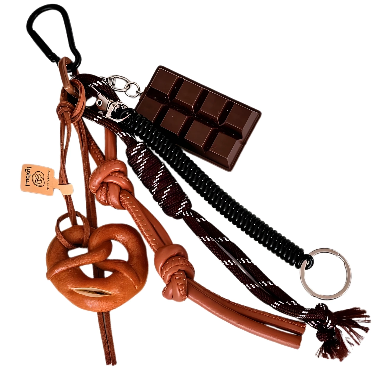 Noul breloc în nuanțe de maro încântă de la prima vedere - este un accesoriu la modă care combină funcția unui pandantiv practic și a unei bijuterii de designer. Acest produs este **NOU** – perfect pentru cei care prețuiesc accesoriile practice. Fabricat din piele ecologică 100% și șnururi țesute cu grijă, completat de elemente realiste sub forma unui covrig și a unei tablete de ciocolată – arată la fel de apetisant cum doar un breloc „fashion foodie” poate.