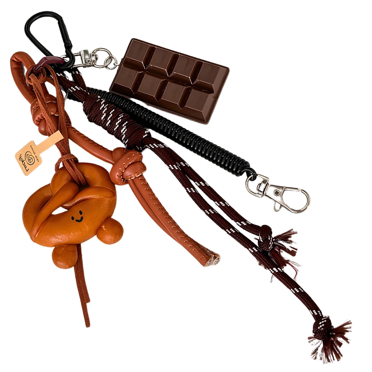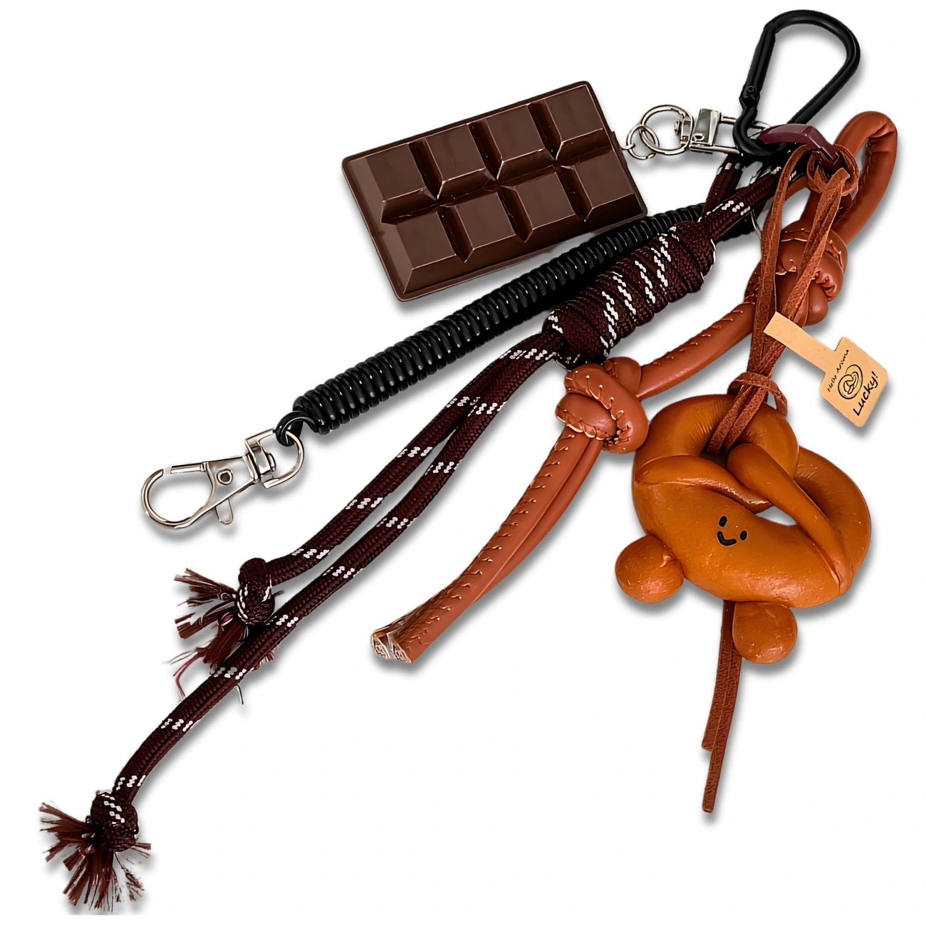 Breloc pentru geantă sau rucsac - un covrig zâmbitor și un pandantiv cu ciocolată