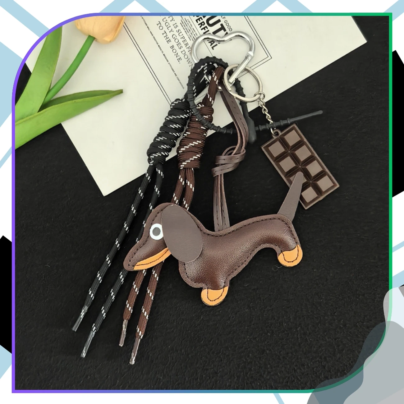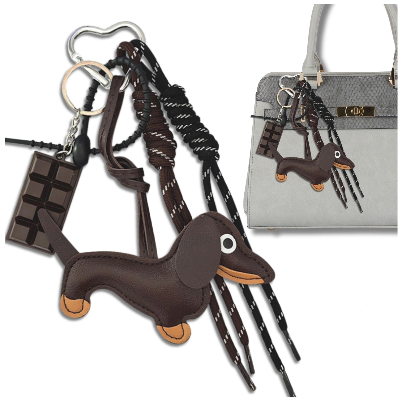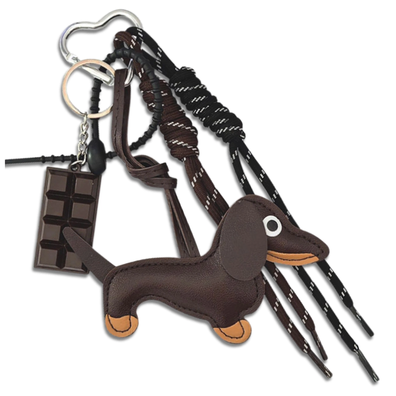 Acest fermecător breloc de geantă cu motiv teckel și o tabletă de ciocolată este combinația perfectă de stil, funcționalitate și design original. Fabricat din 100% piele ecologică, încântă prin măiestria meticuloasă și atenția la fiecare detaliu. Acest accesoriu unic nu numai că vă va decora cheile, geanta sau rucsacul, dar va da și accesoriilor de zi cu zi un caracter unic.