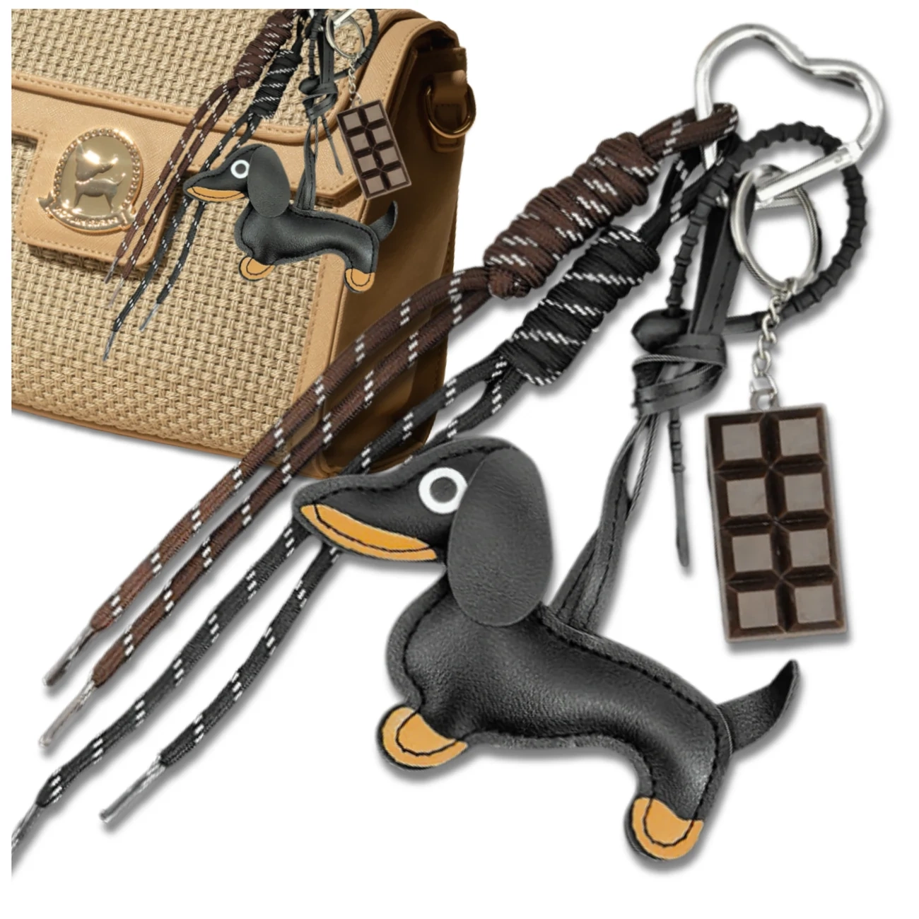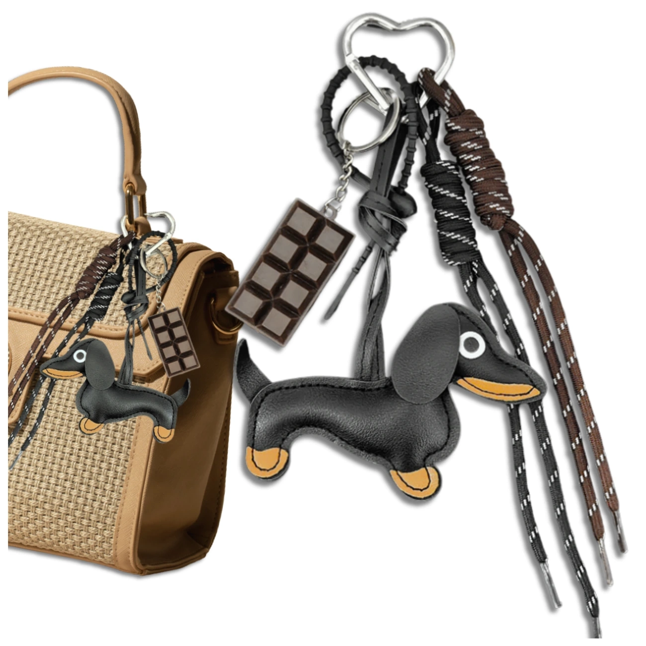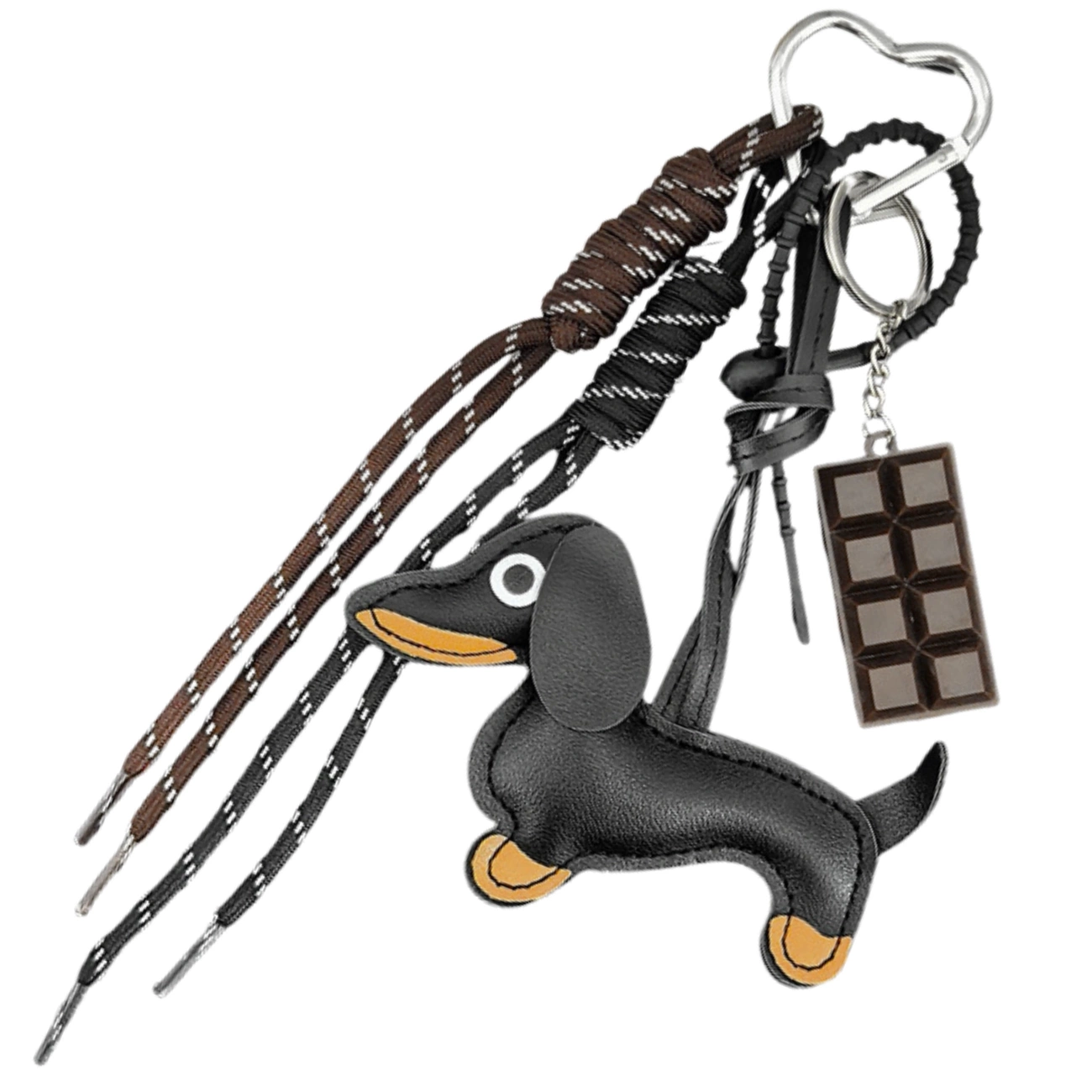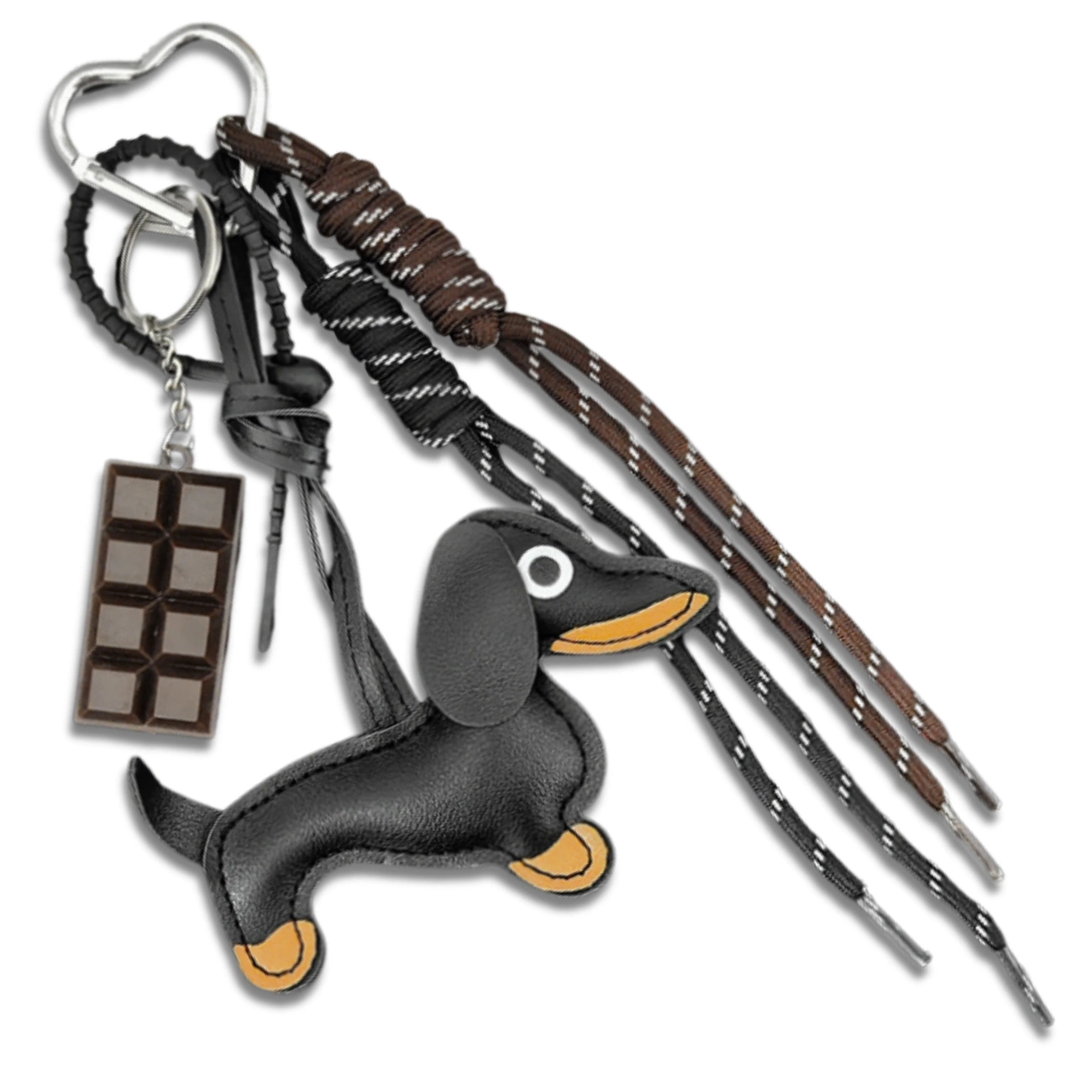 Pandantivul, în formă de teckel drăguț, în negru clasic cu detalii maro, emană farmec și eleganță. Combinat cu o ciocolată reprodusă realist, creează un set unic, la modă, care atrage atenția și se remarcă față de alte accesorii. Șnururile lungi, decorative, în tonuri de maro și negru, accentuează designul modern și conferă brelocului o notă ușoară.