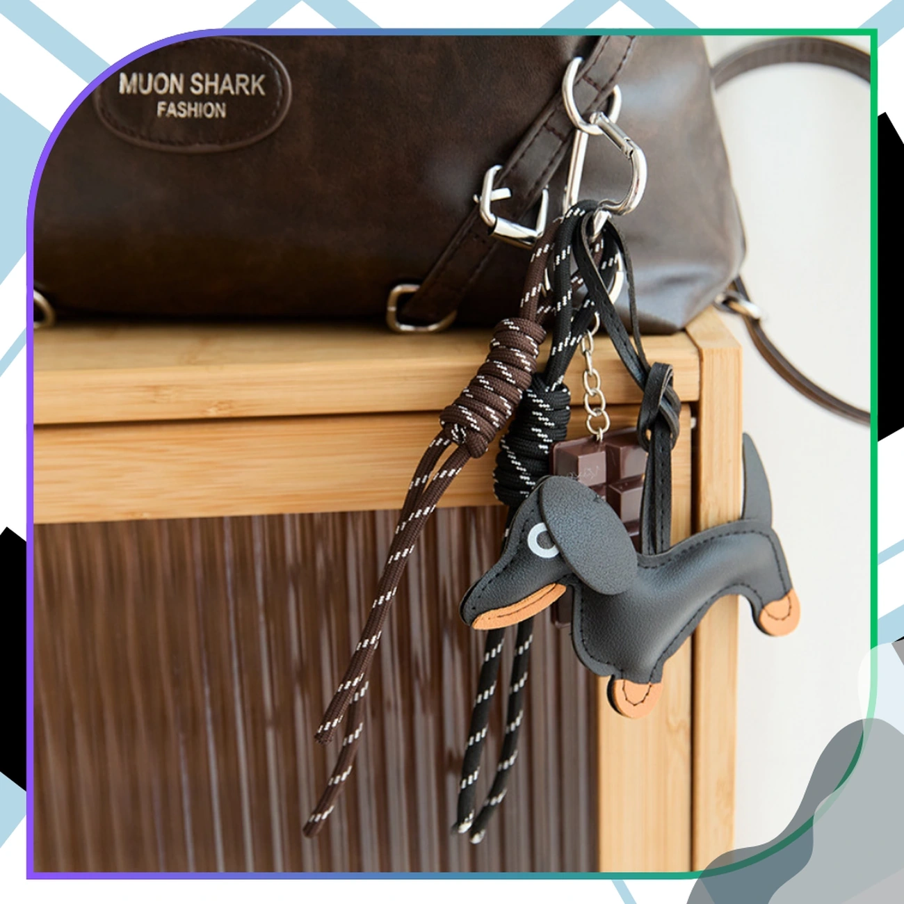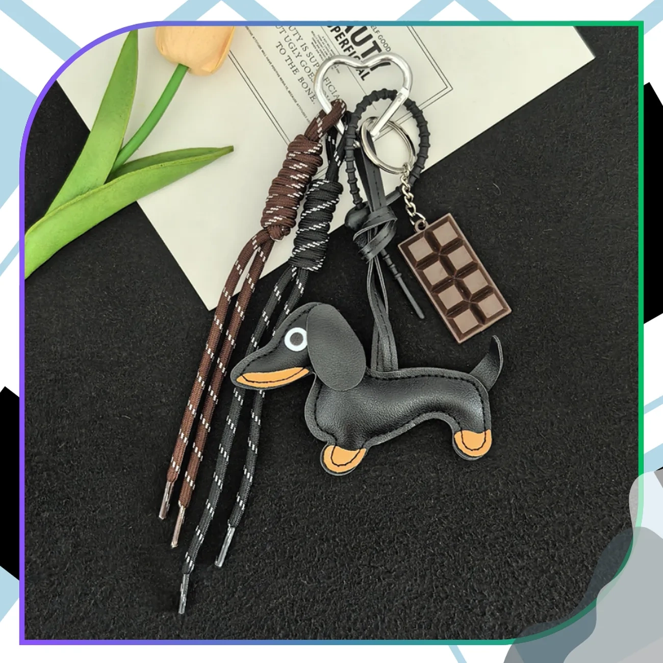 Acest fermecător breloc de geantă cu motiv teckel și o tabletă de ciocolată este un accesoriu unic care combină stilul, funcționalitatea și o notă de umor. Fabricat din 100% piele ecologică, impresionează prin măiestria sa meticuloasă, senzația moale și durabilitatea. Acest breloc este accesoriul perfect care va adăuga caracter cheilor, genții sau rucsacului tău, fiind totodată un accesoriu practic și durabil de zi cu zi.