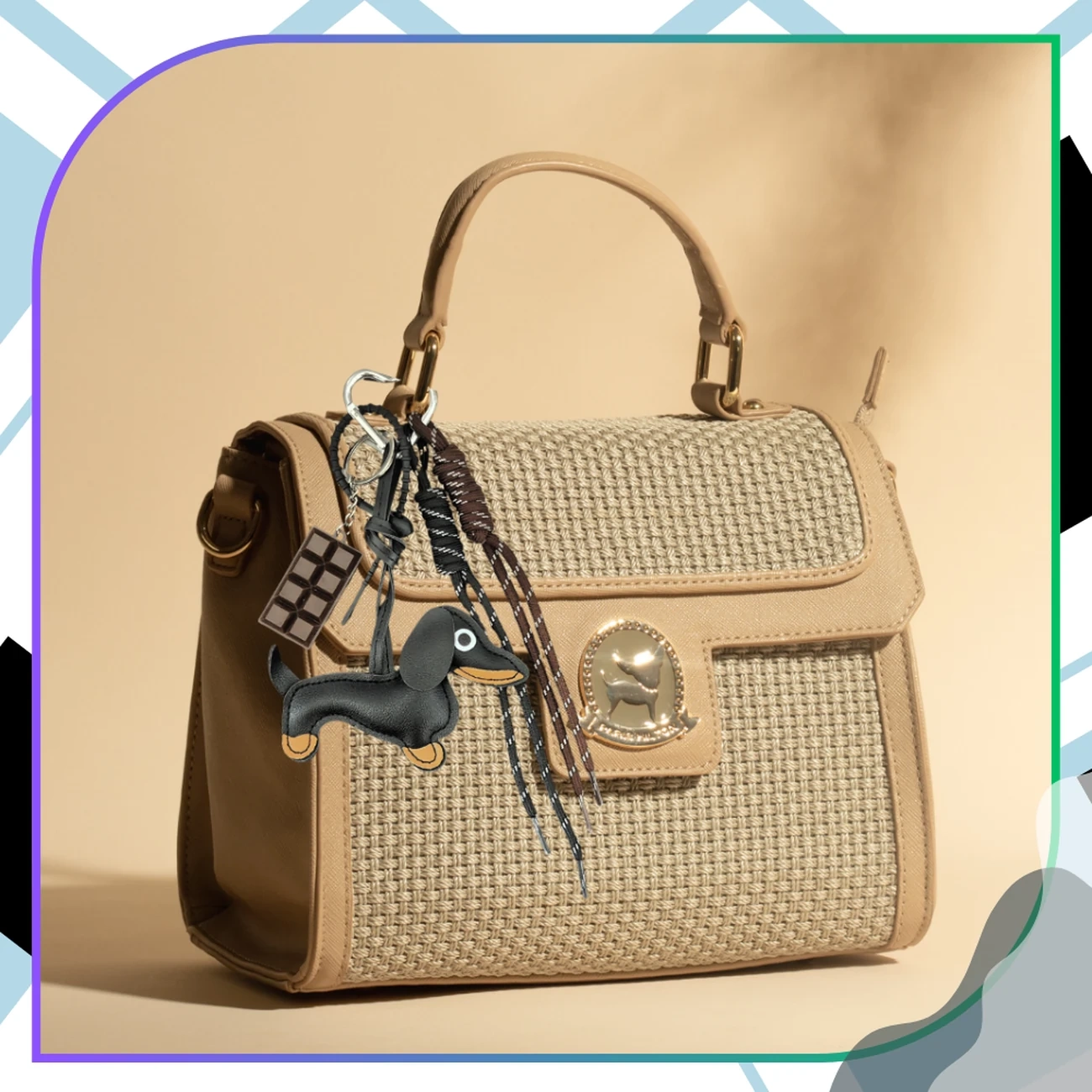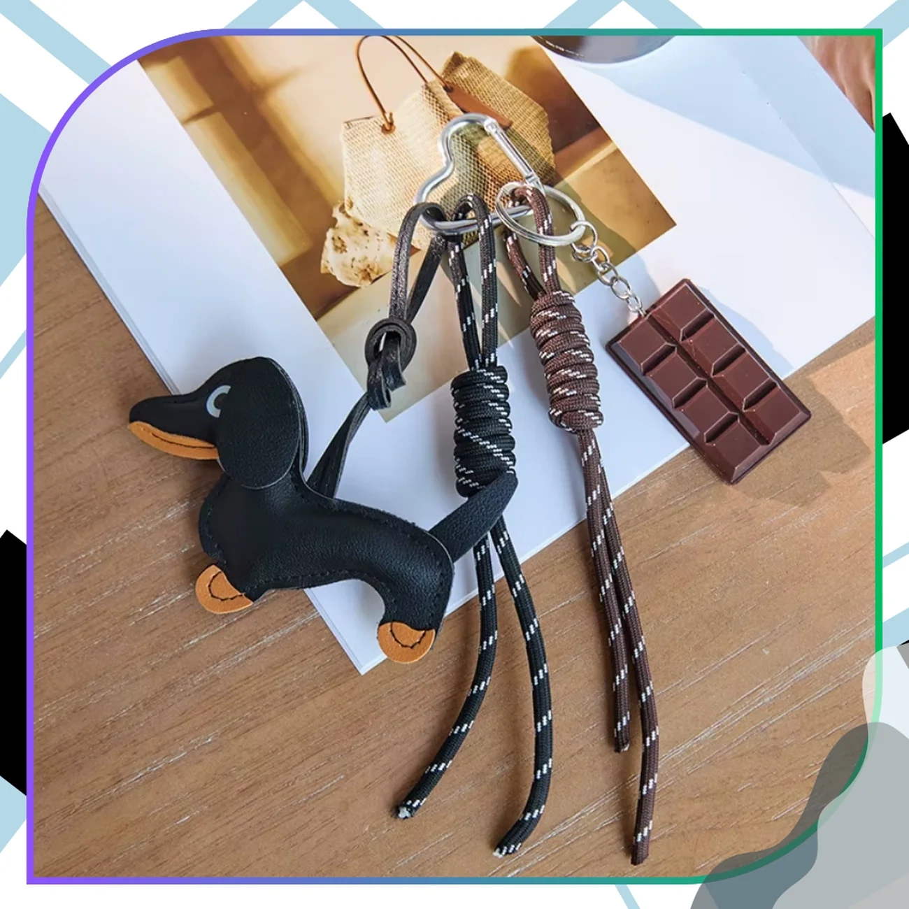 Breloc pentru o geantă cu un teckel și o tabletă de ciocolată