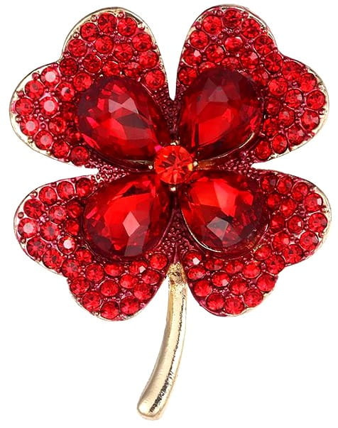 Broșa trifoi pe care o recomandăm este un produs care constă din patru frunze așezate pe o tulpină aurie. Aceste elemente au fost decorate cu zirconii sintetice roșii. Ele strălucesc magnific atât în lumina zilei, cât și în lumina artificială. În centrul produsului, care este o broșă trifoi, există un decor suplimentar sub forma a patru zirconii foarte mari, de culoarea rubinului.
