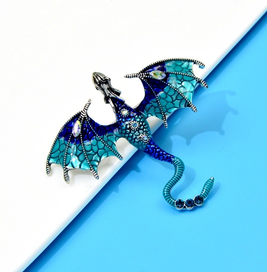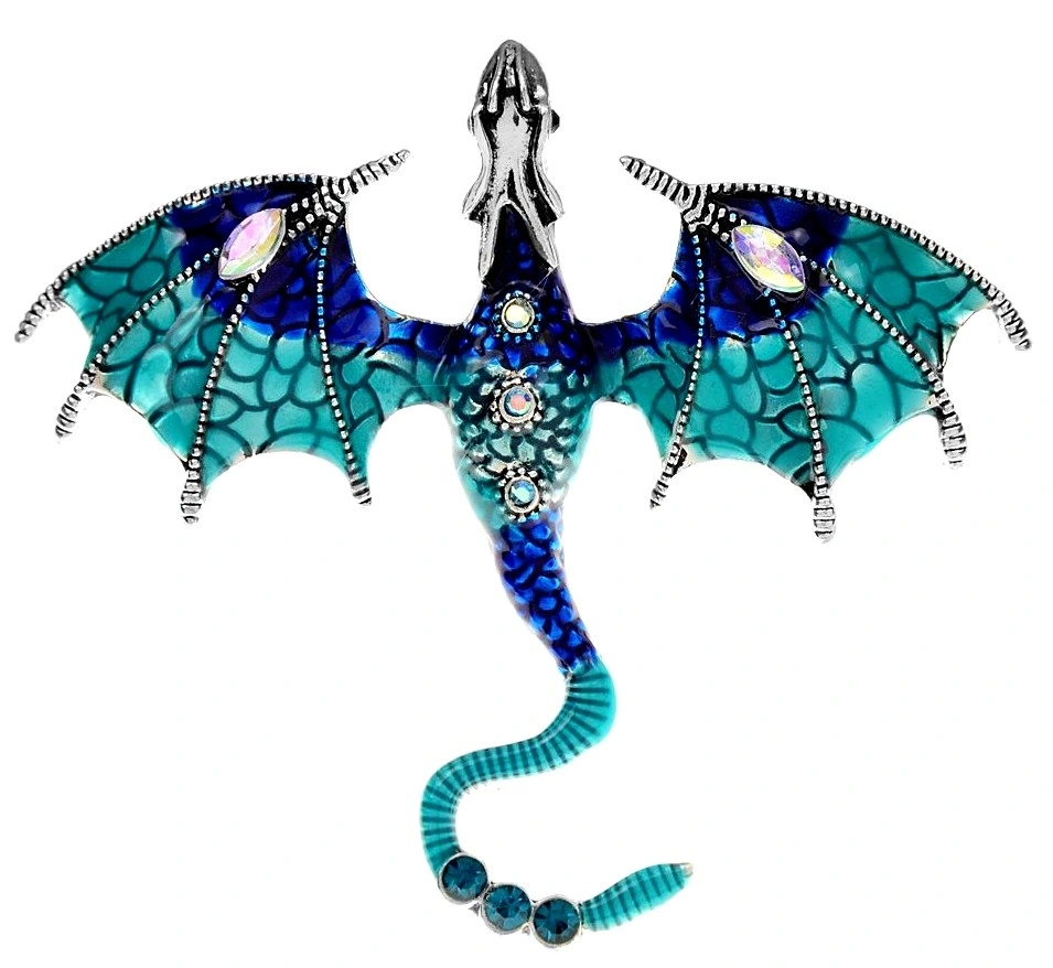 O frumoasă și elegantă broșă dragon albastru cu zirconii poate fi atașată unei rochii de seară sau altei ținute la modă.