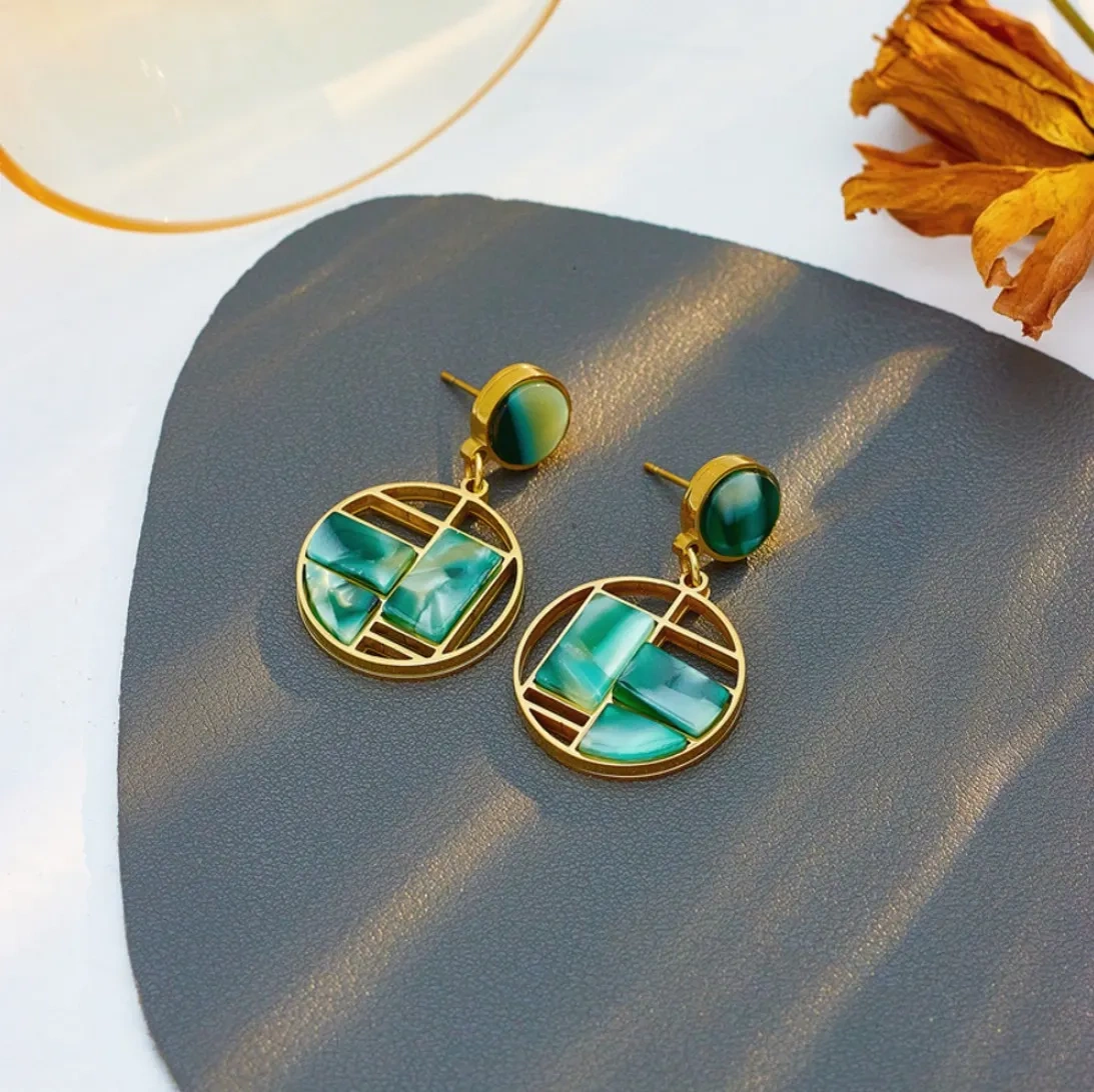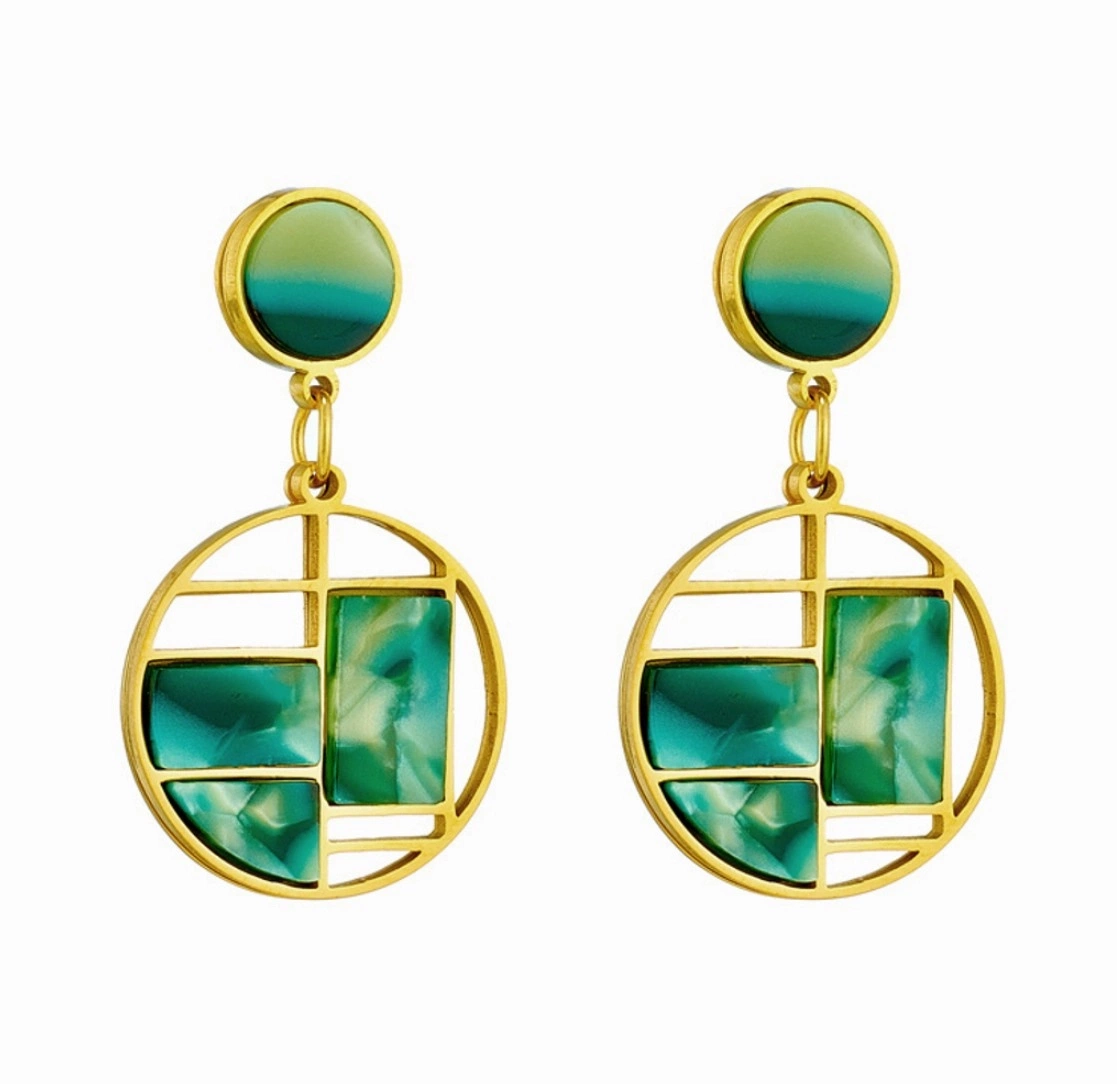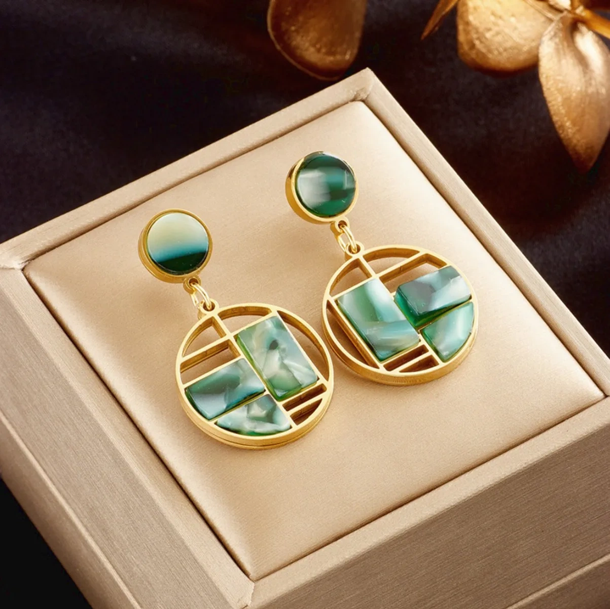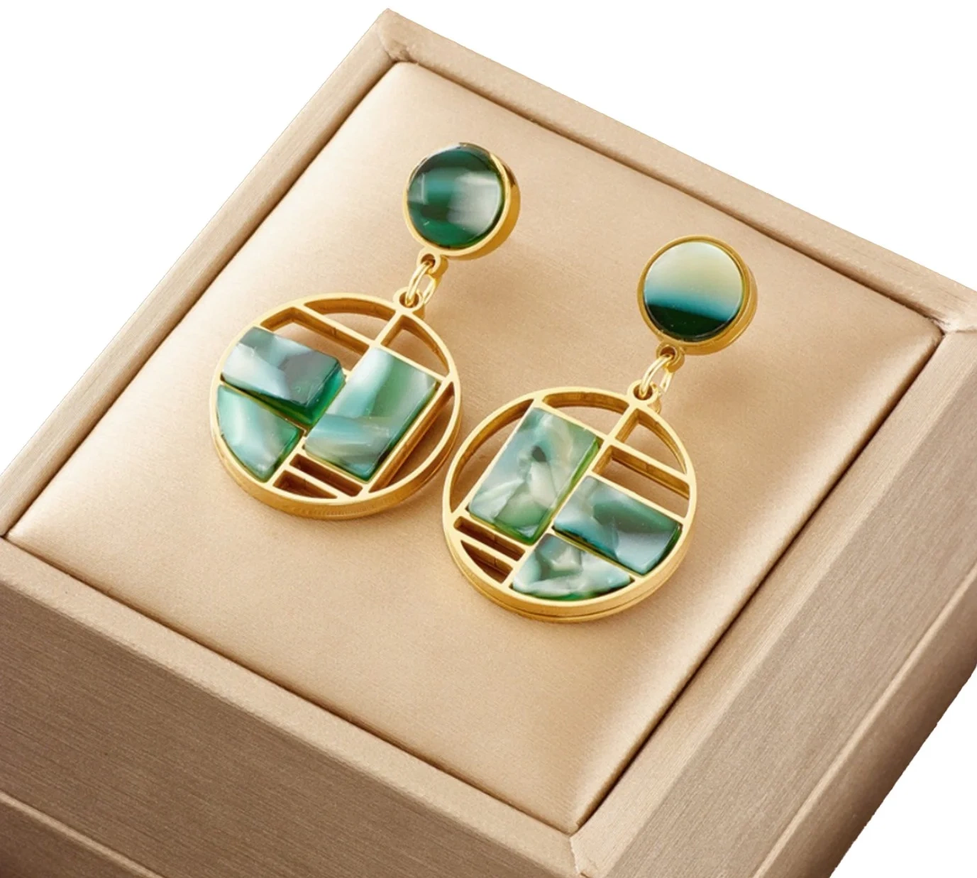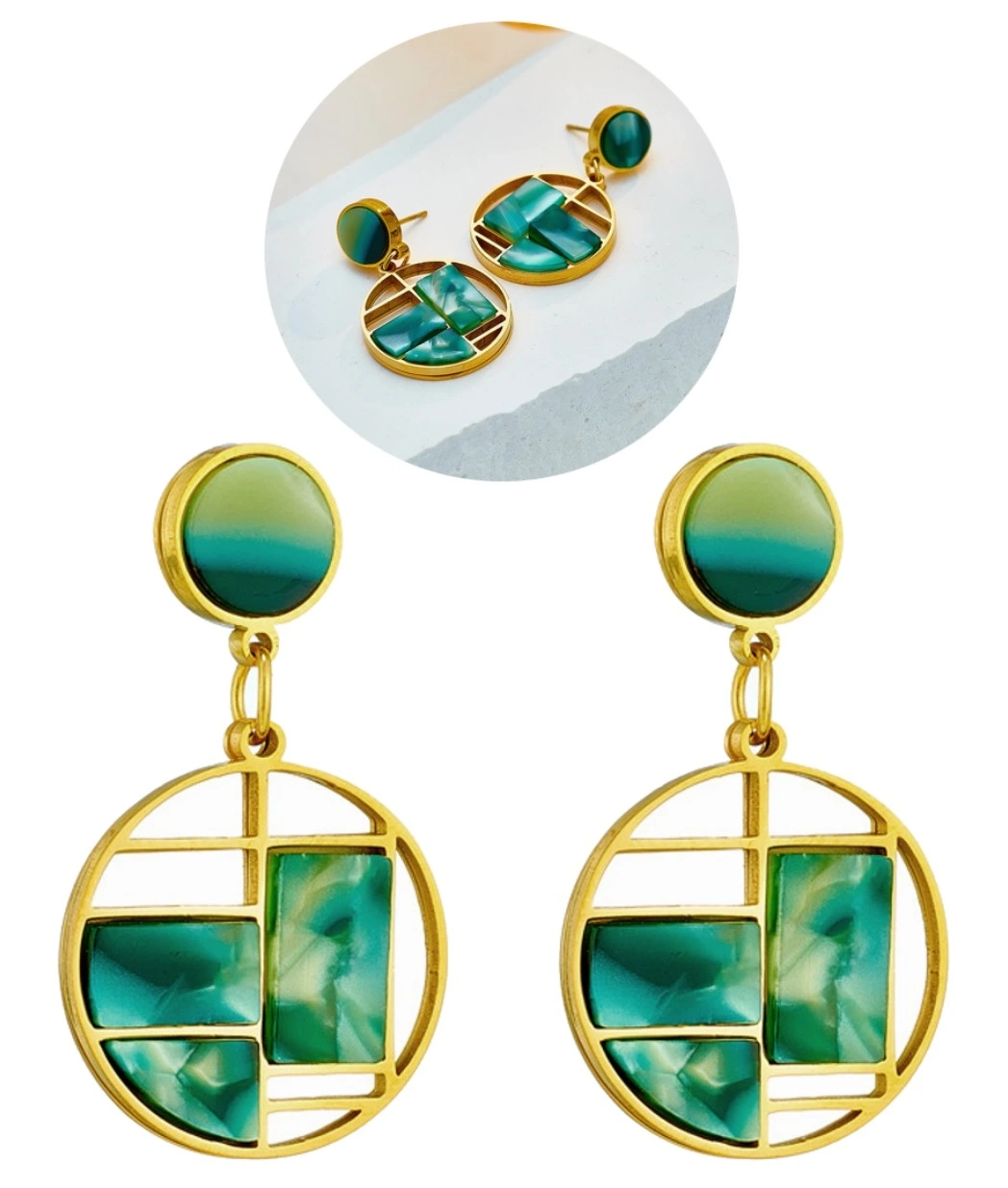 Cercei agățați din aur, oțel chirurgical, cercuri rotunde verzi