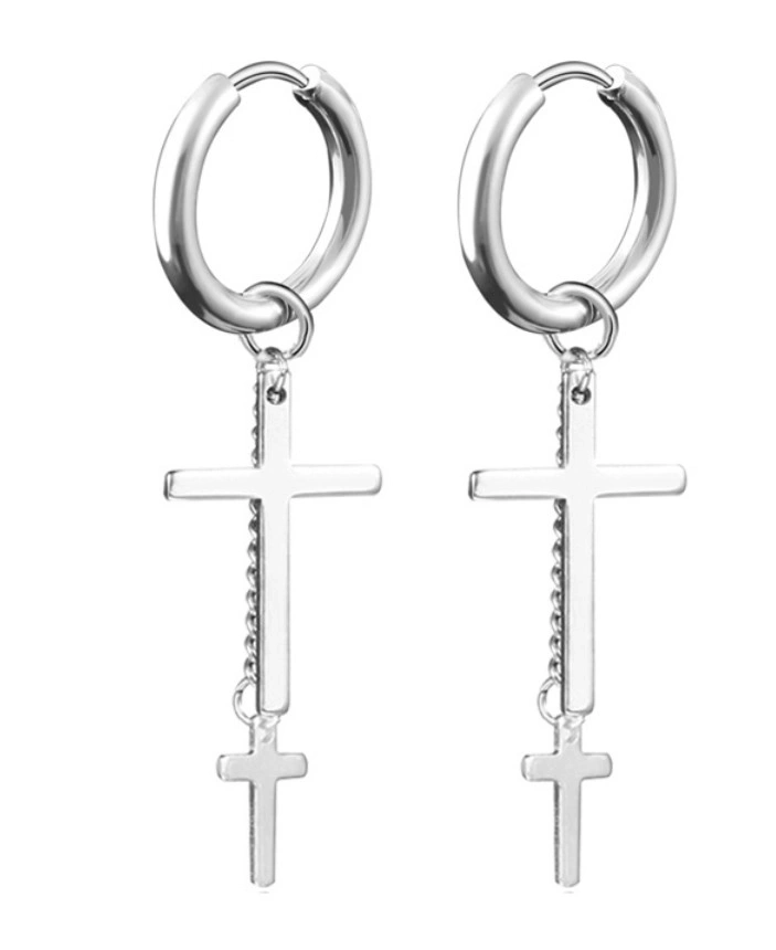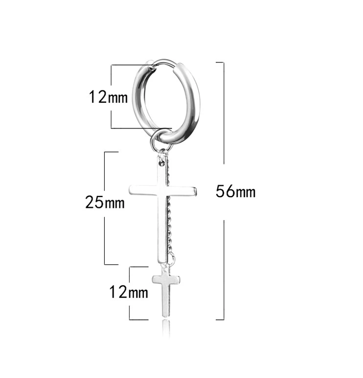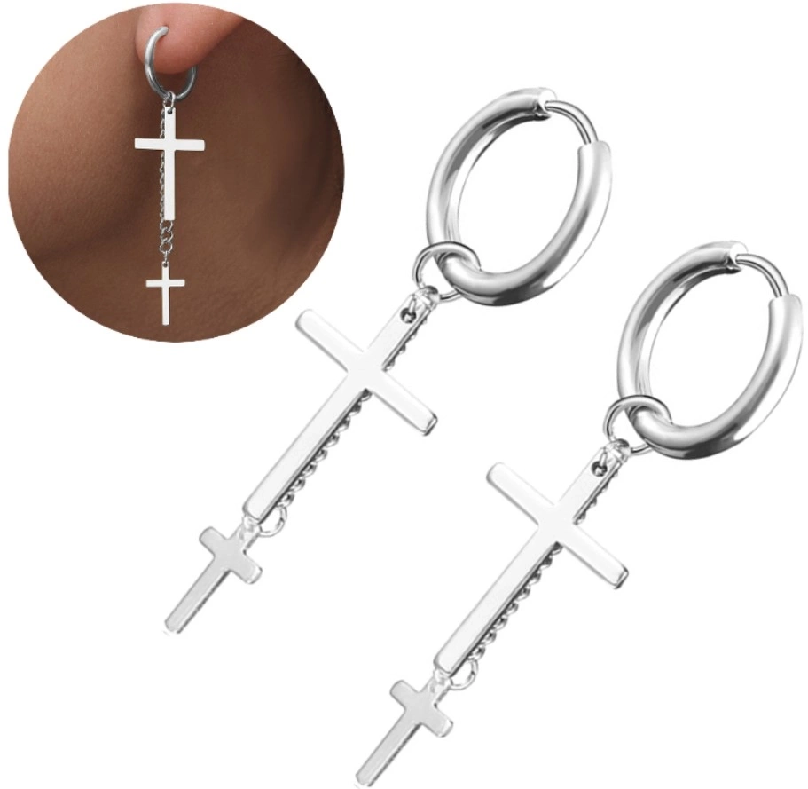 Două cruci au fost suspendate pe creole. Cea mai mică, atârnată pe un lanț scurt armat, are 12 mm lungime. Cea mai mare are 25 cm lungime și este așezată pe un cerc mic atașat la creolă. Cerceii agățători eleganți din oțel cu cruce de argint pe care îi recomandăm au o lungime totală de 56 cm. Bijuteriile pot fi completate cu achiziționarea unui colier într-un stil similar.
