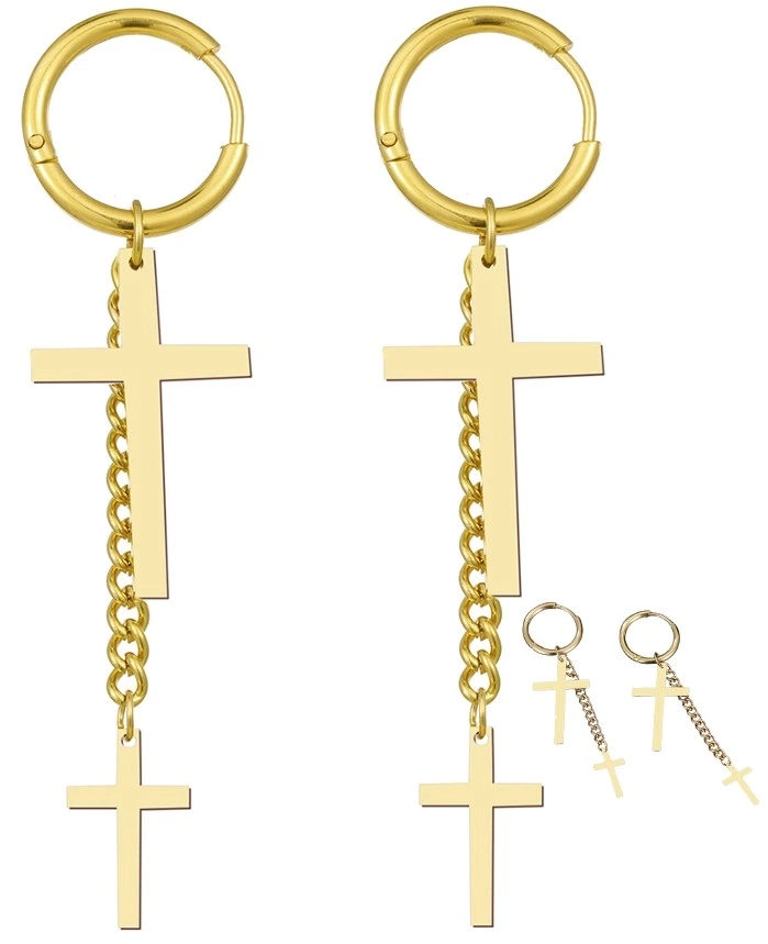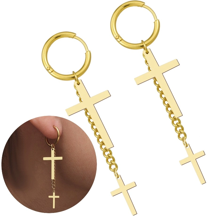 Cerceii pandantiv din oțel chirurgical cu cruce aurie au o lungime totală de 56 mm, astfel încât vor scoate în evidență orice stil cu care sunt purtați. Acesta este un produs pentru cei care preferă bijuteriile neconvenționale. Acesta poate fi completat cu un colier într-un stil similar din oferta magazinului nostru.