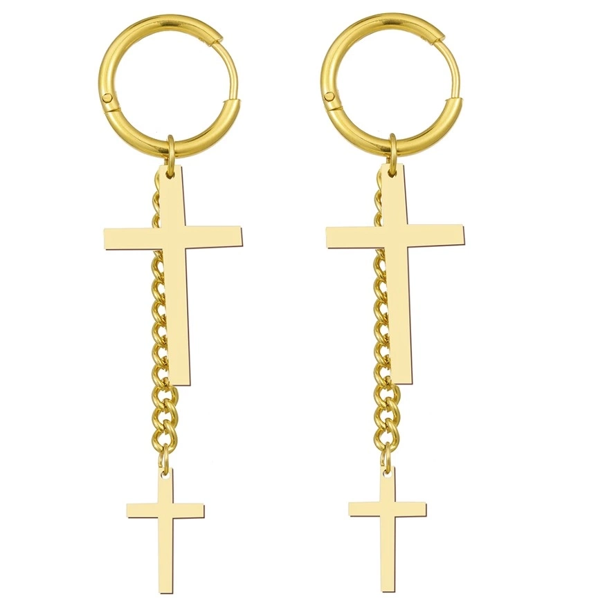 Cerceii cu cruci aurii oferiți de noi cercei agățători eleganți din oțel chirurgical se remarcă printr-un design foarte original. Baza acestui produs este formată din mici creițe cu diametrul de 12 mm.