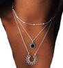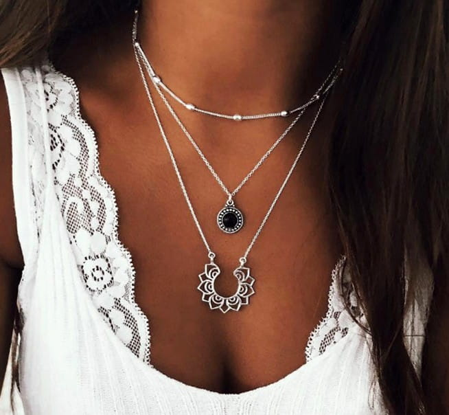 Disponibil în argintiu, strălucind glorios la lumina zilei și la lumina artificială, acest colier choker de damă cu pandantive este o bijuterie minunată, realizată din metal de calitate excelentă, rezistent la pătarea culorii. Este un produs format din trei lanțuri cu o țesătură foarte subtilă de ochiuri. Primul este decorat cu mărgele delicate, din argint. Celelalte două au pandantive neobișnuite. Toate acestea fac ca colierul nostru pentru femei în stil Boho să fie capabil să accentueze acest tip de ținută.
