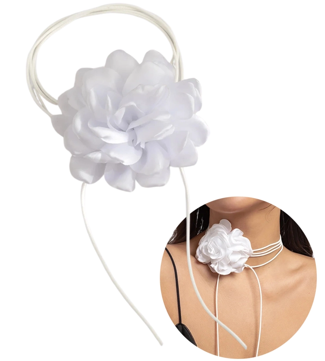 Colierul a fost realizat din cordon și șnur alb de cea mai bună calitate, ceea ce garantează confortul purtării și durabilitatea. Punctul central al colierului este un ornament mare, izbitor, sub forma unei flori din țesătură de 12 cm lățime. Această floare adaugă un caracter unic, atrăgând atenția și subliniind gustul rafinat.