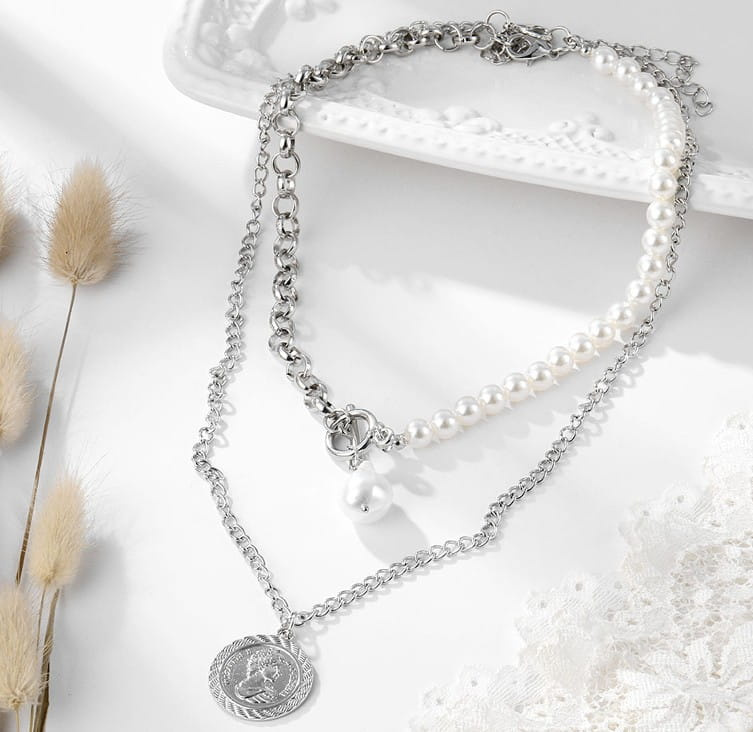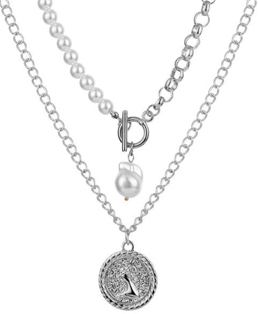 Lanțul de perle din aur pe care îl oferim este decorat cu elemente suplimentare sub forma unui pandantiv frumos, care face aluzie prin forma și culoarea sa la monedele antice tradiționale. De asemenea, este demn de remarcat al doilea element decorativ sub forma unui pandantiv cu perle, situat sub închizătoarea elegantă a lanțului. Toate elementele pe care le are acest lanț din aur cu perle sunt realizate foarte atent, ceea ce îi sporește valoarea estetică.