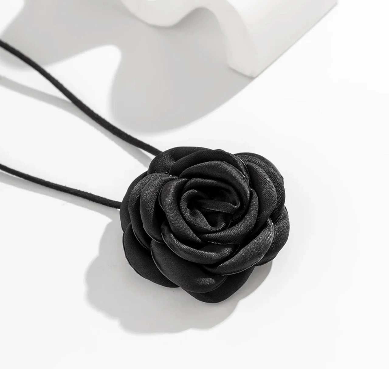 Realizat din cordon negru fin și șnur, acest colier oferă o purtare confortabilă combinată cu durabilitate și un aspect elegant. Punctul central al colierului este o floare din țesătură de 6 cm lățime, care adaugă o notă unică și subliniază eleganța întregului accesoriu.