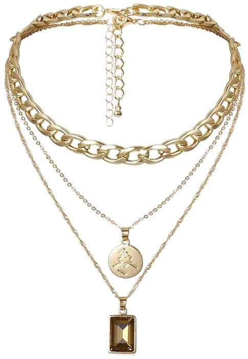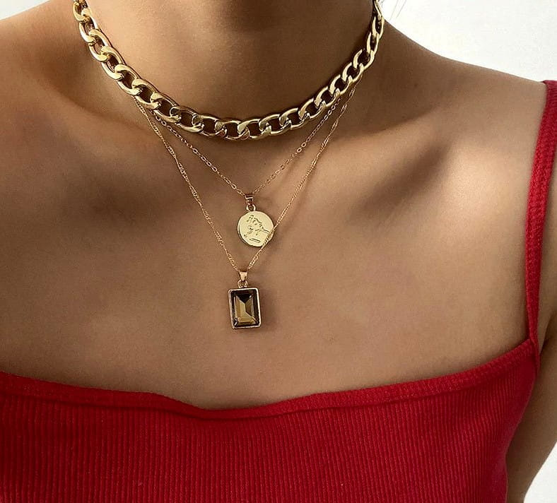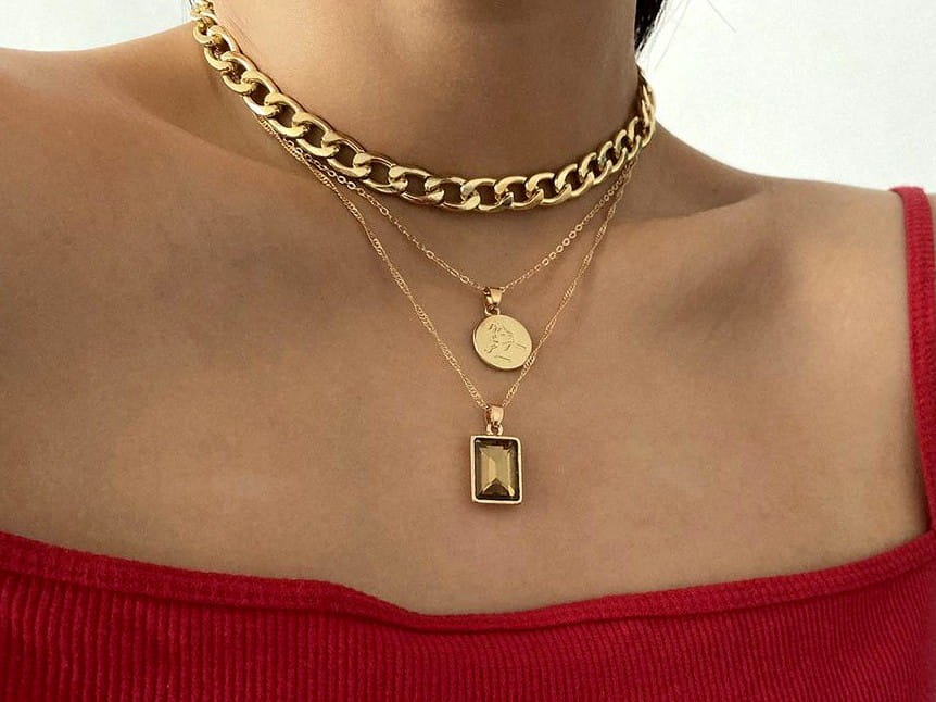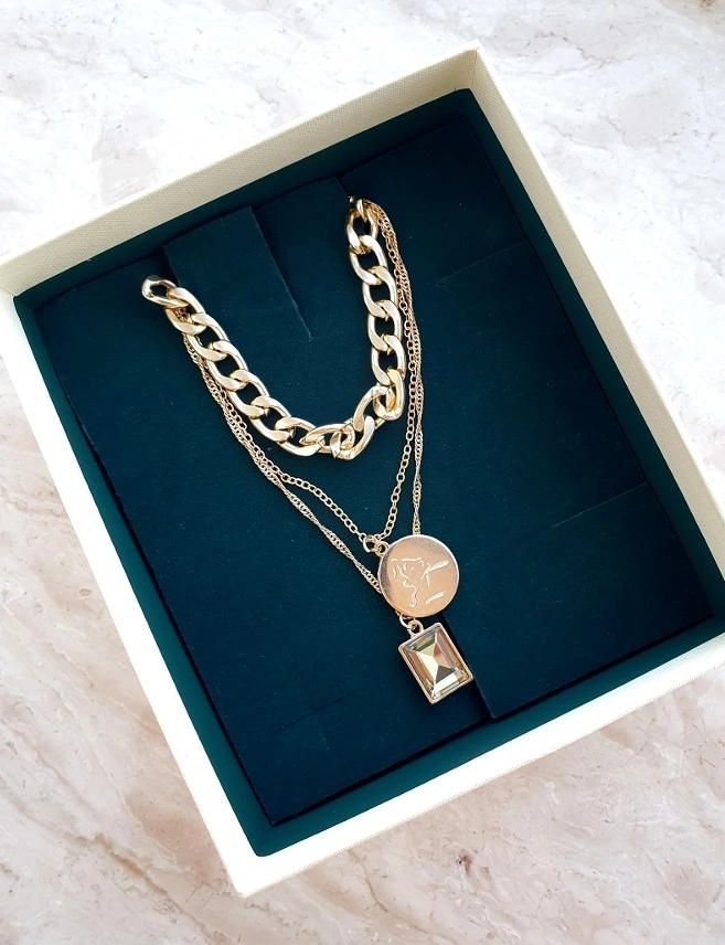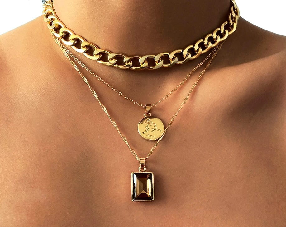 Colierul Choker original pentru femei cu pandantive este o bijuterie extrem de frumoasă, dar la un preț atractiv, realizată din metal de înaltă calitate, vopsit în aur galben strălucitor. De remarcat sunt cele trei lanțuri din care este creat acest colier pentru femei cu pandantive. Acestea sunt o armură clasică, precum și o țesătură sub formă de bile mici și cea numită Singapore, formată din elemente delicate, răsucite.