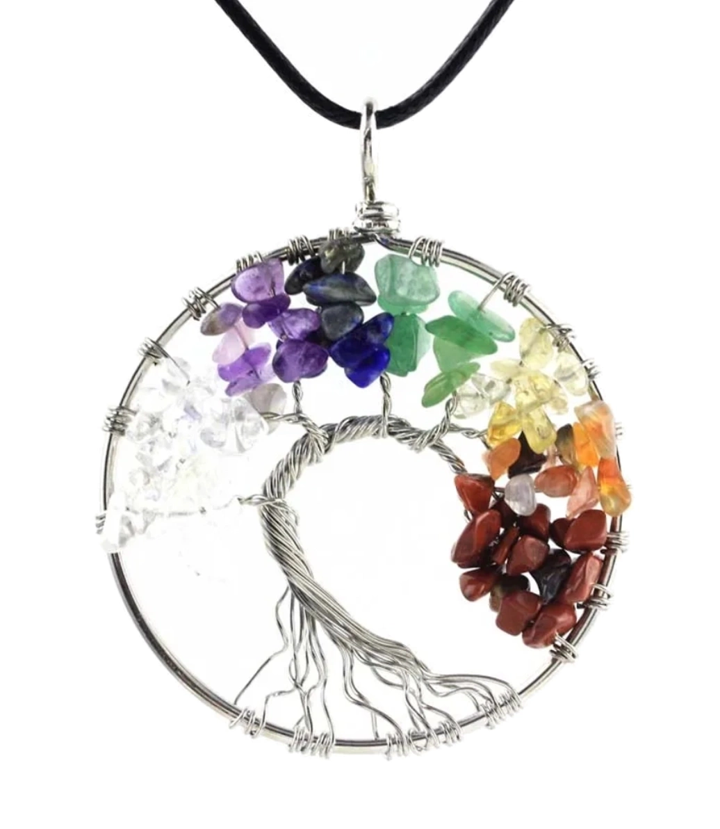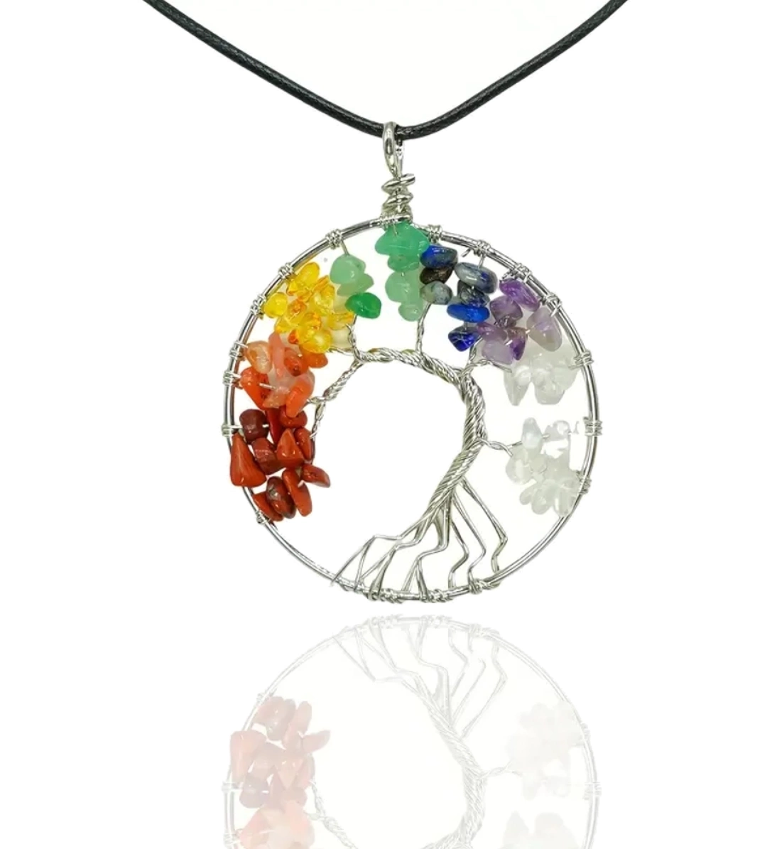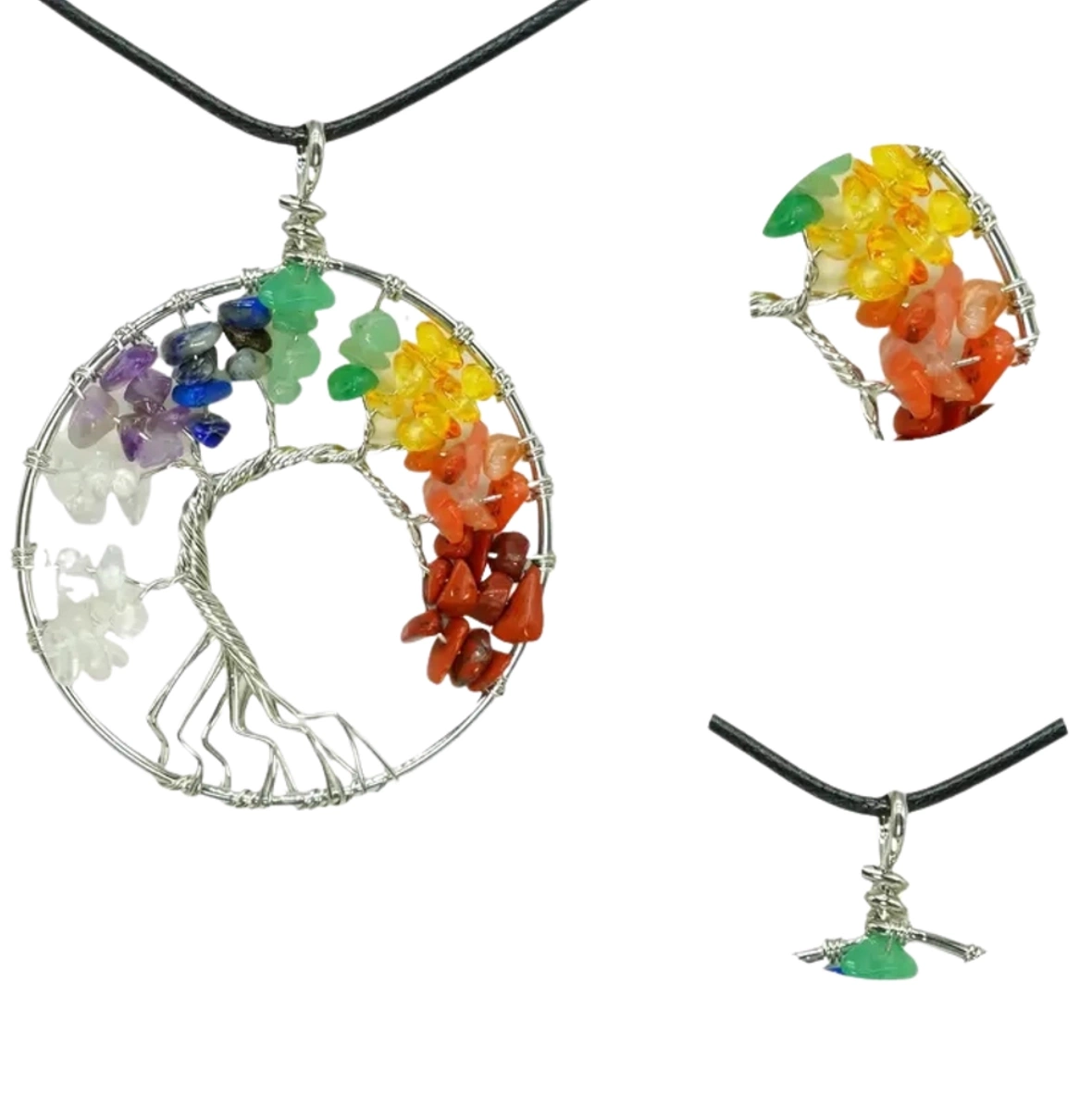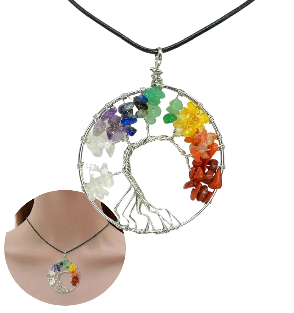 Colierul are un pandantiv distinctiv cu motivul copacului norocos, care simbolizează norocul, sănătatea și noile începuturi de secole. Cu un diametru de 5 cm, pandantivul, decorat cu minerale colorate, atrage privirea și adaugă farmec oricărei ținute. Pietricelele, atent selectate pentru culorile și energia lor, aduc culoare și energie pozitivă în viața ta.