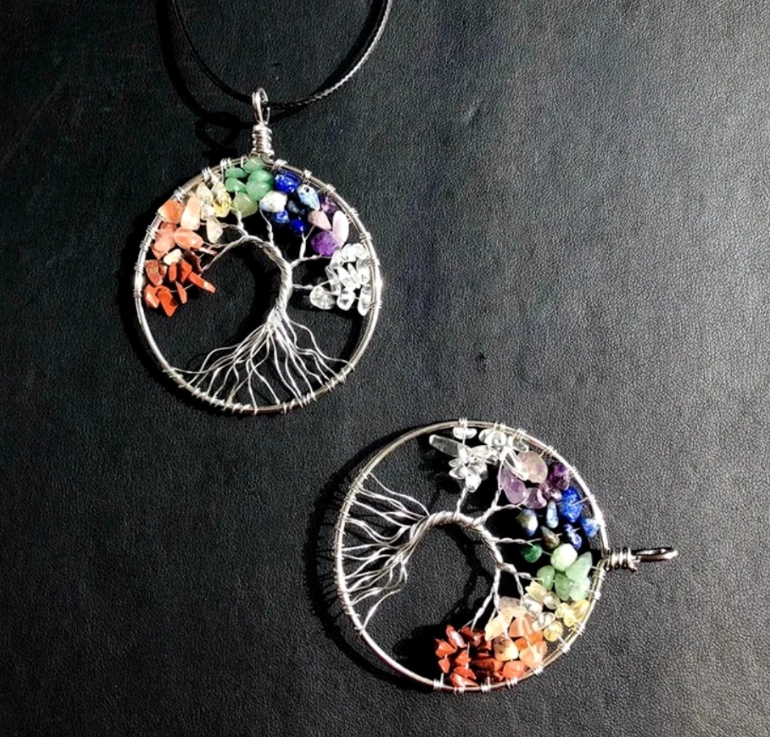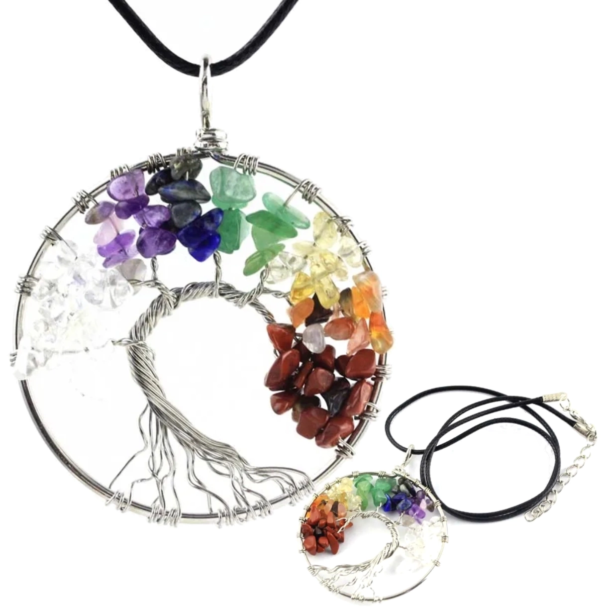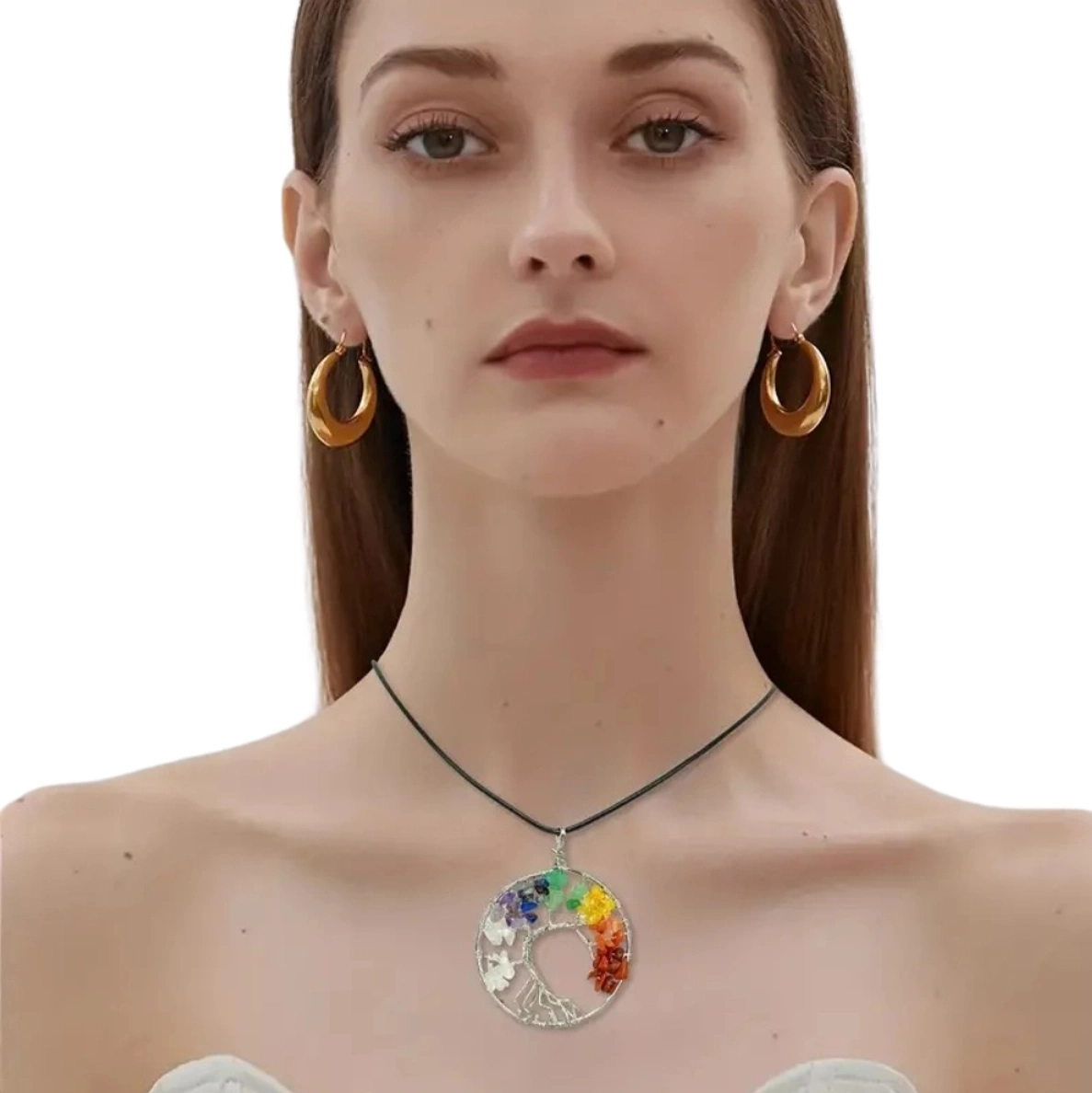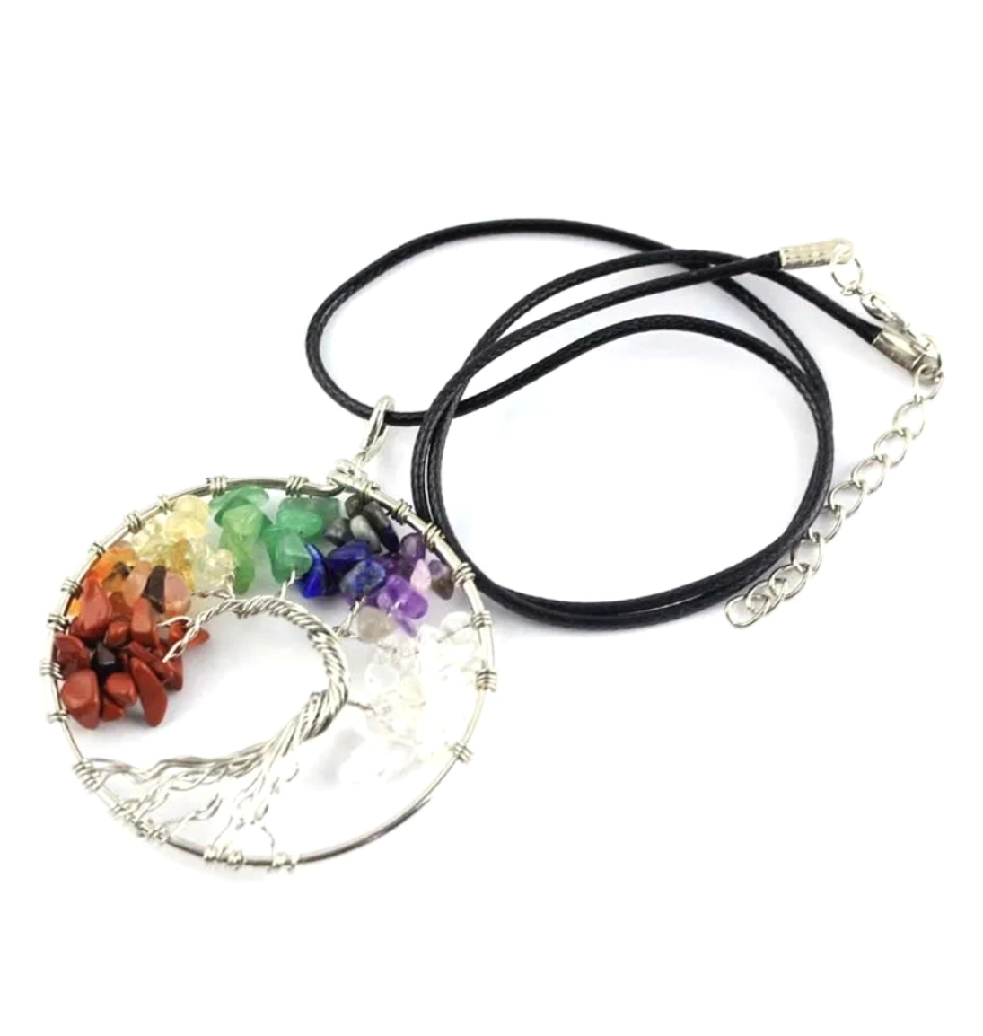 Colierul are un pandantiv distinctiv cu motivul copacului norocos, care simbolizează norocul, sănătatea și noile începuturi de secole. Cu un diametru de 5 cm, pandantivul, decorat cu minerale colorate, atrage privirea și adaugă farmec oricărei ținute. Pietricelele, atent selectate pentru culorile și energia lor, aduc culoare și energie pozitivă în viața ta.