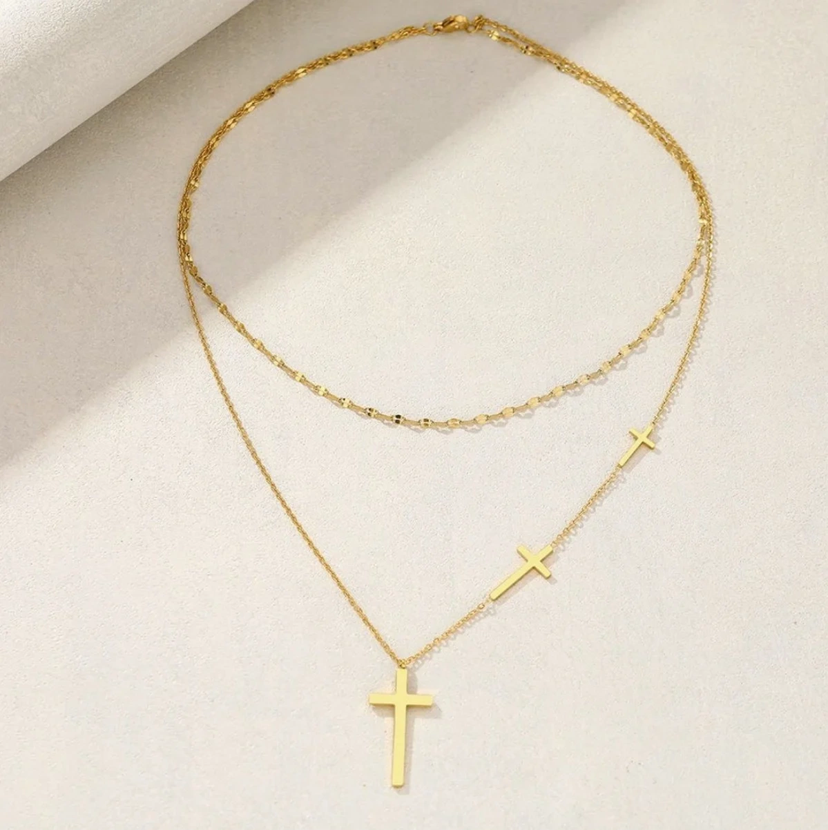 Colier dublu din aur, cruci elegante, delicate din otel chirurgical