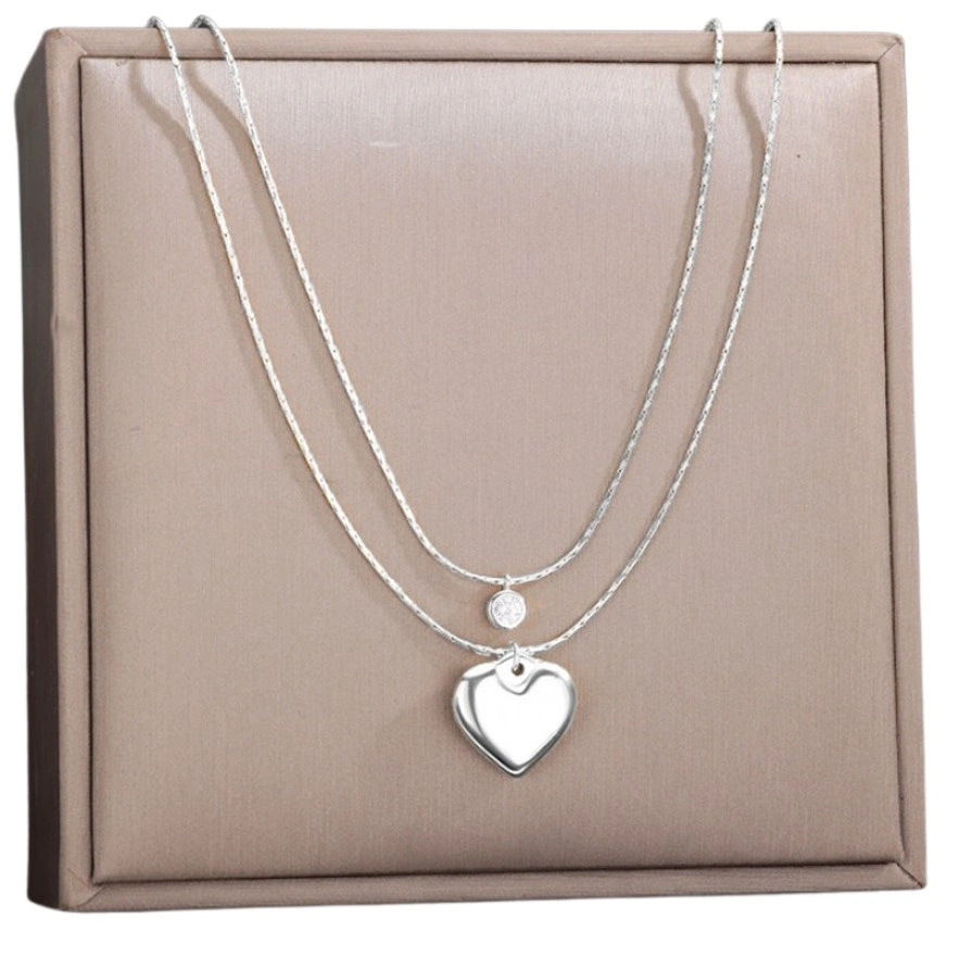 Acestea au lungimi diferite. Un pandantiv rotund delicat a fost atașat lanțului mai scurt, în interiorul căruia se află un zirconiu alb atrăgător. Piesa mai lungă este împodobită cu un pandantiv plin în formă de inimă, care măsoară 1,5 cm x 1 cm.