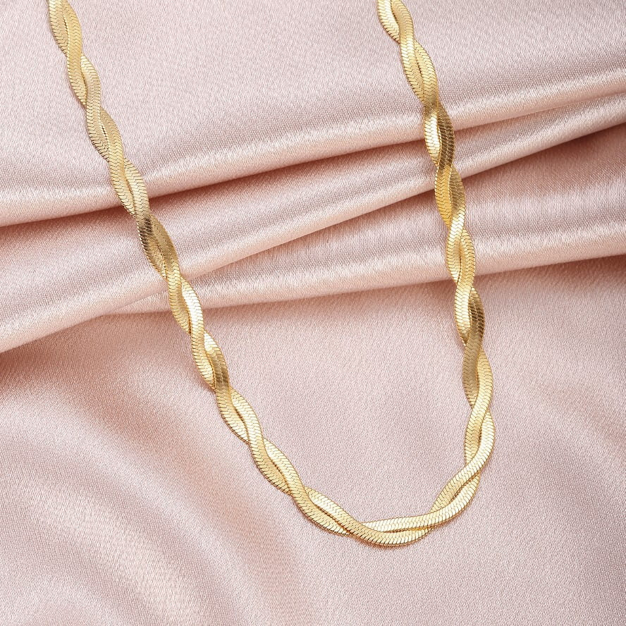 Acest produs fin lucrat este format din două lanțuri cu o țesătură fină de vene. Acestea au o lungime de 38 cm. Lanțurile care se împletesc sunt destul de late, de aceea bijuteria pe care o recomandăm arată fenomenal. Colierul este livrat cu un prelungitor lung de 6 cm. Datorită acestei soluții colierul poate fi ajustat. Întregul este fixat cu un carabinier durabil și sigur.