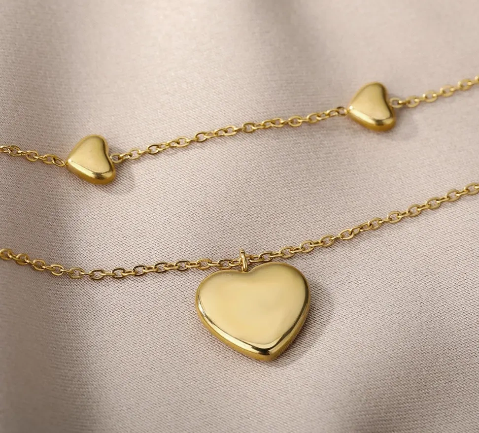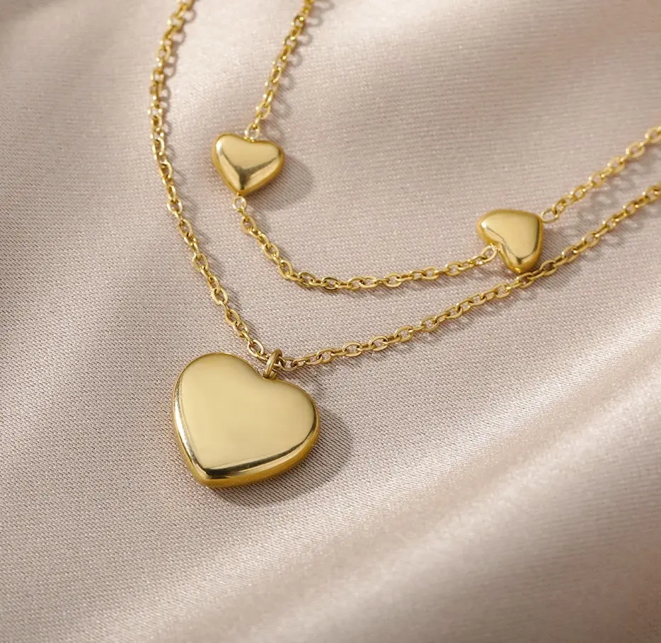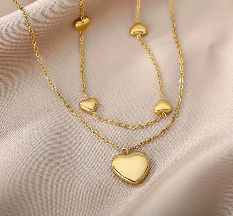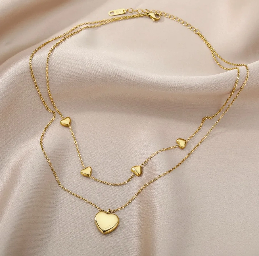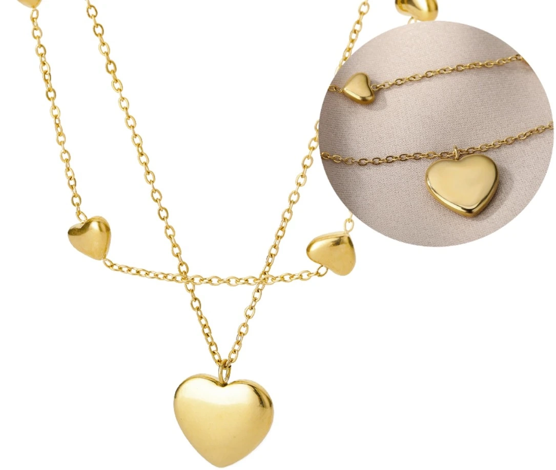 Frumosul colier dublu cu inimi din oțel chirurgical din magazinul nostru online, a fost placat cu aur de 18K.