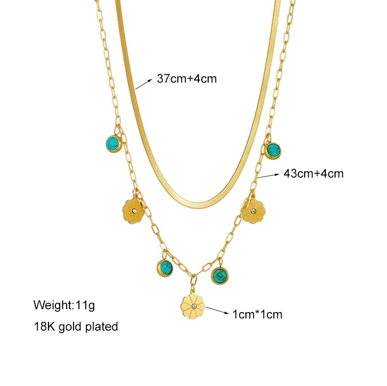 Cel mai scurt, de tip viperă, are o lungime de 37 cm. Lanțul mai lung, de tip brățară împletită, are 47 cm lungime. Piesa mai lungă este decorată cu trei pandantive care seamănă cu mici flori de aur cu centre din zirconiu și patru pandantive rotunde cu turcoaz albastru în interior. Pandantivele au fost așezate alternativ pe lanț.