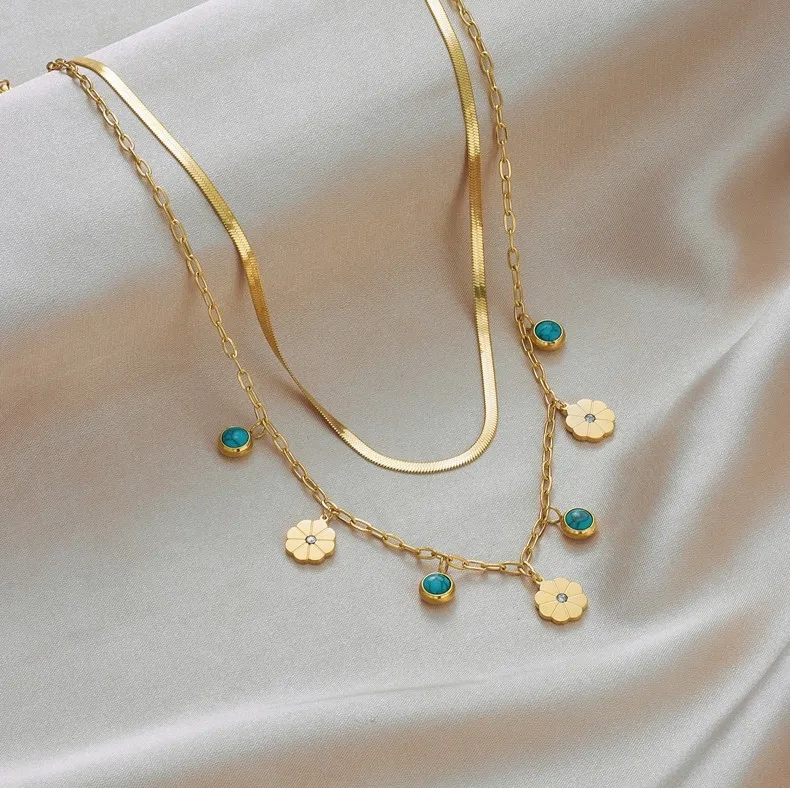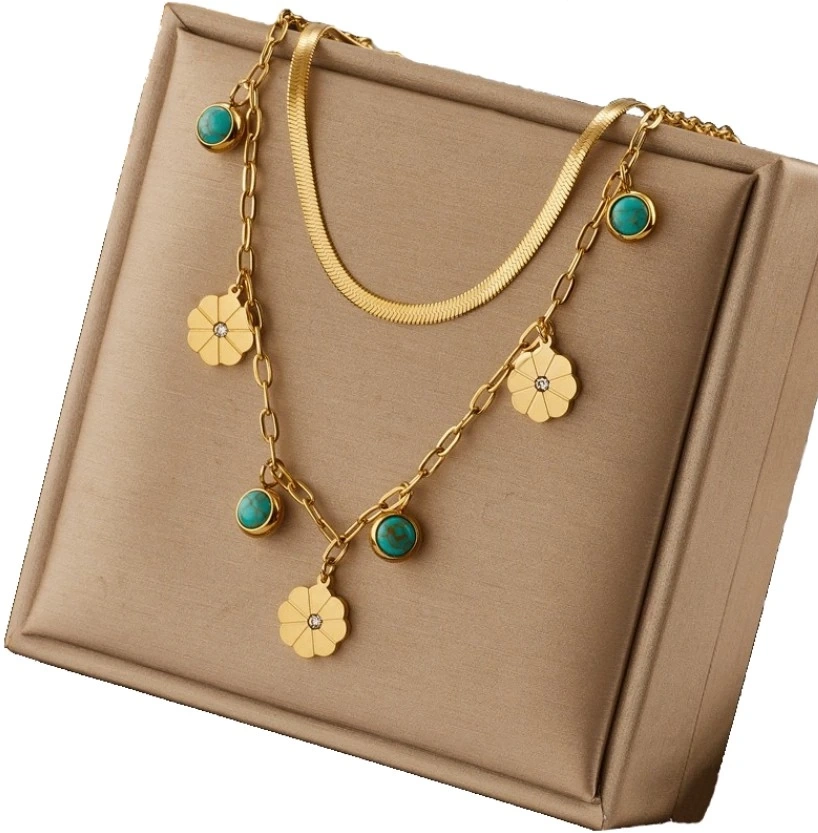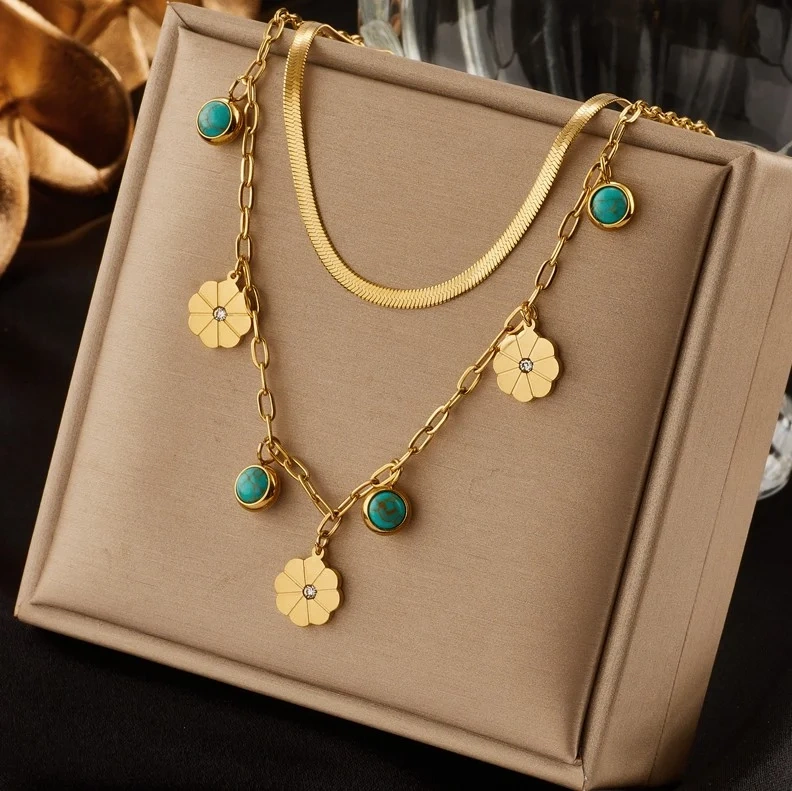 ✅ Colierul are numeroase pandantive: flori și ochi albaștri/verzi