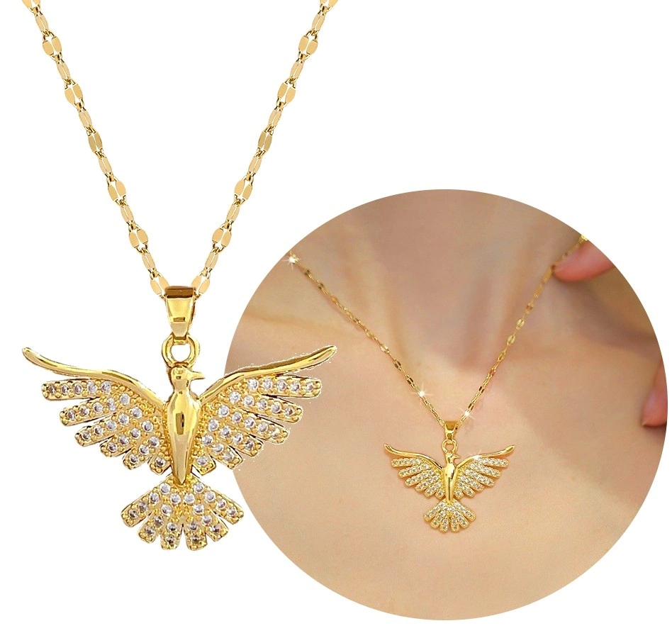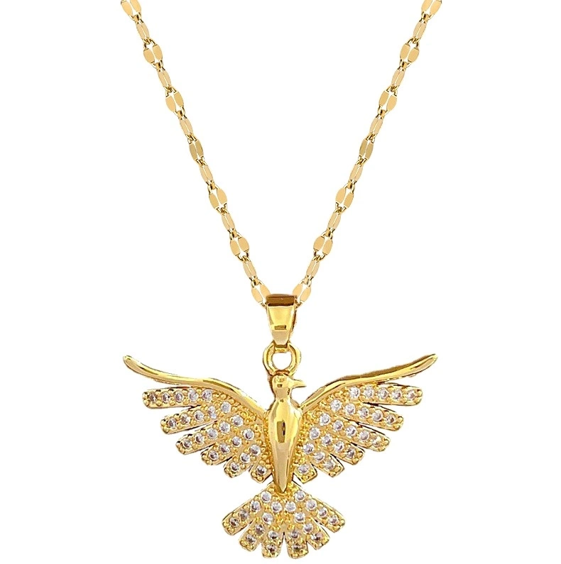 Va fi iubit de fiecare persoană care apreciază ornamentele strălucitoare, caracterizate prin exclusivitate. Colierul pasăre de aur cu zirconii provine din colecția modernă de produse de bijuterie realizate din oțel inoxidabil placat cu aur de 18k.