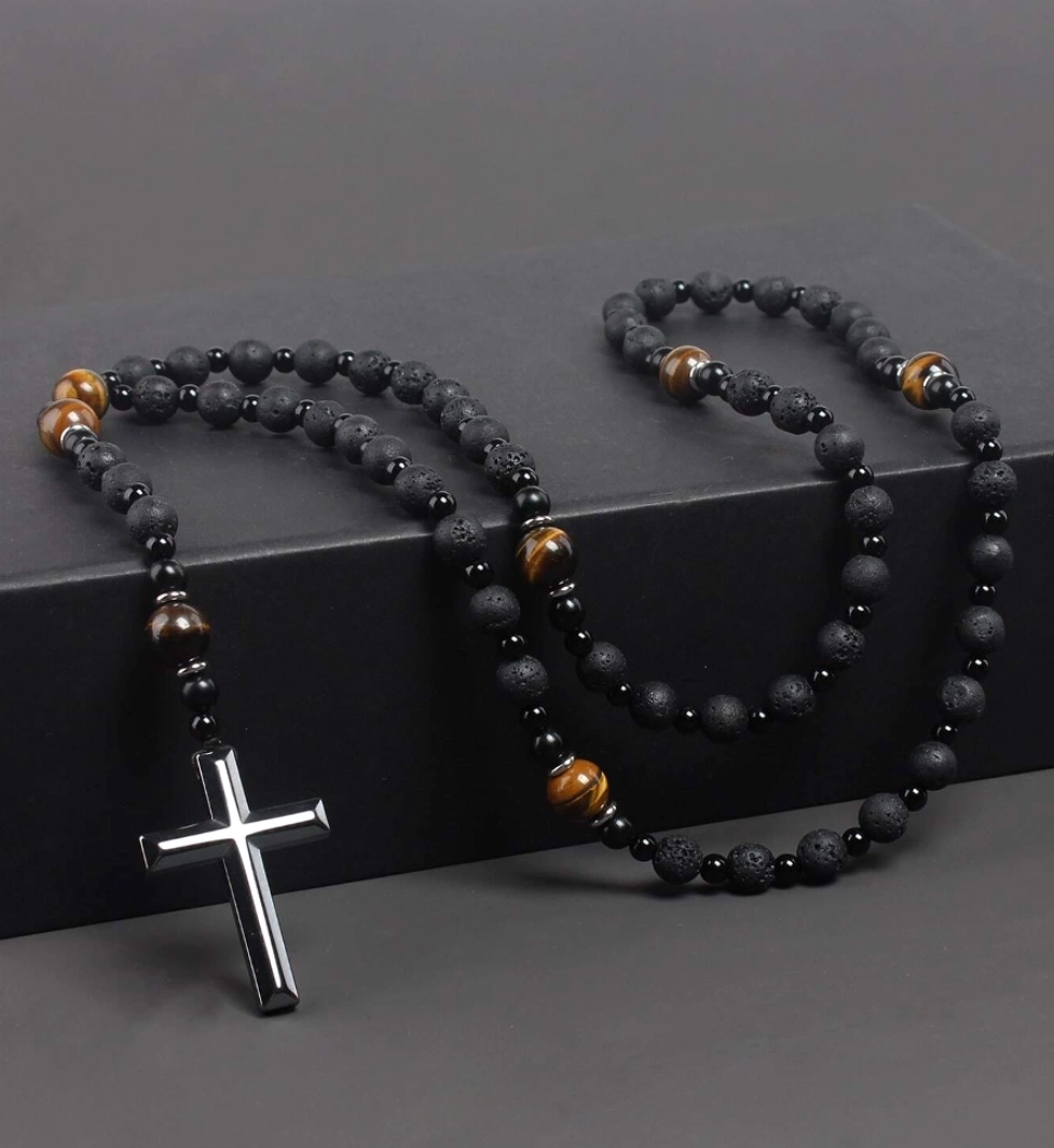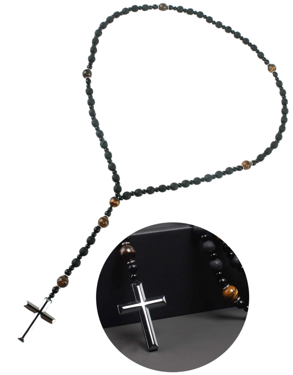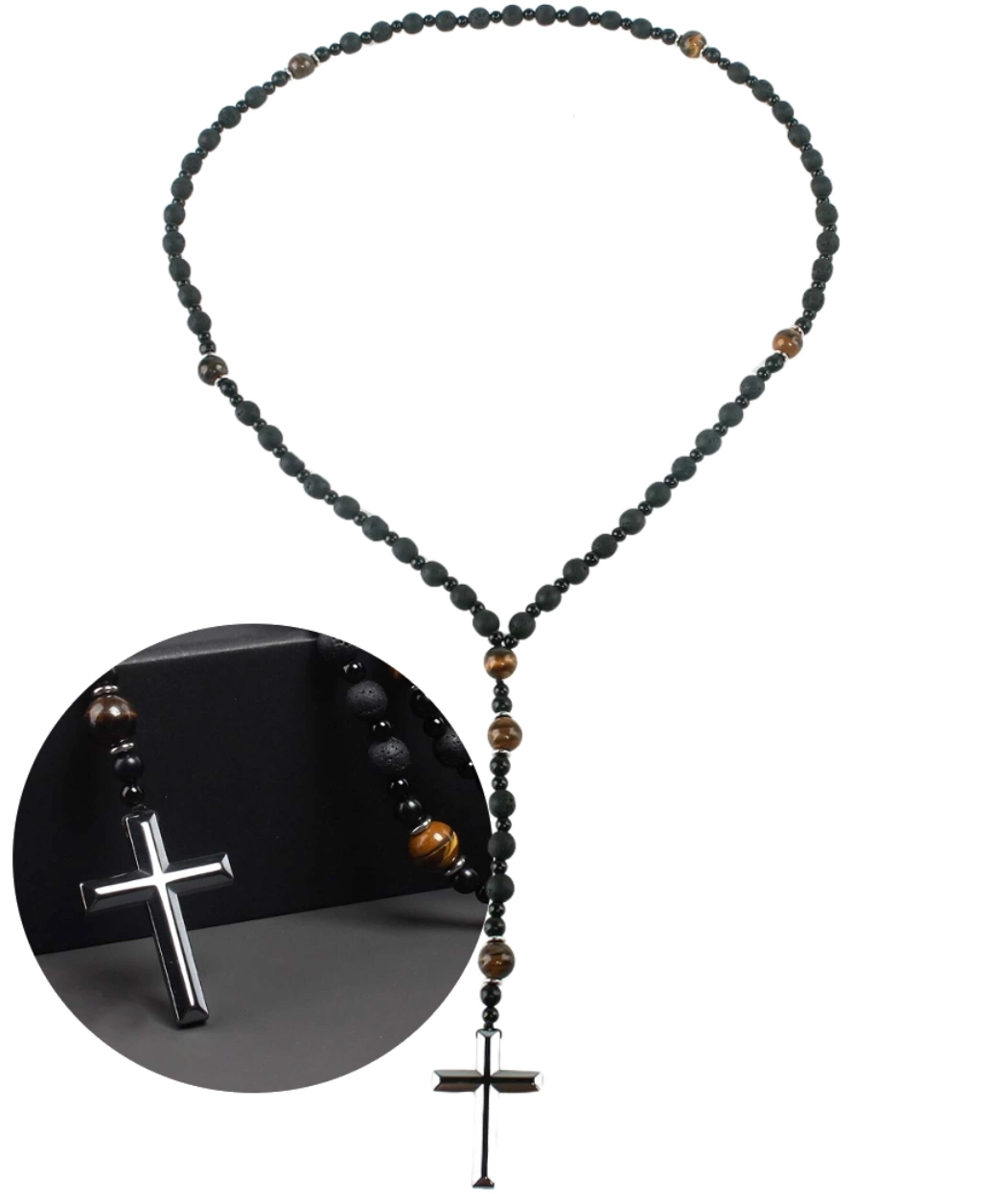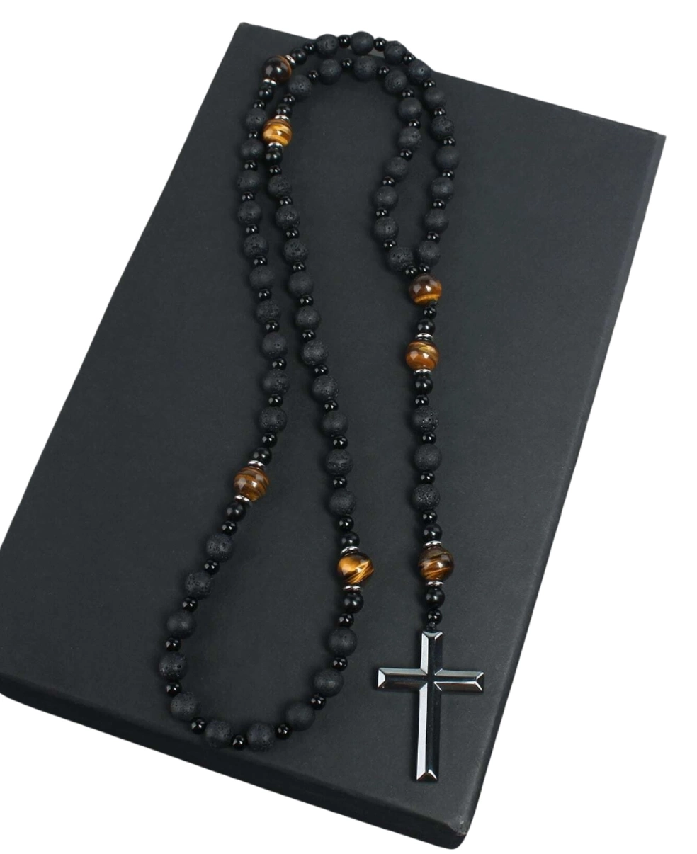 Descoperiți profunzimea și caracterul extraordinar al colierului nostru Rozariu - perfect atât pentru bărbați, cât și pentru femei. Realizat din rocă vulcanică naturală și împodobit cu o piatră ochi de tigru, acest rozariu negru elegant este unic în toate privințele.