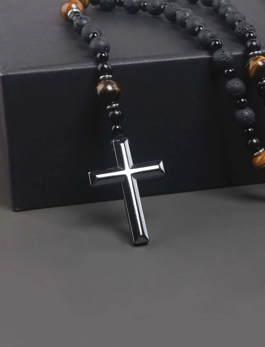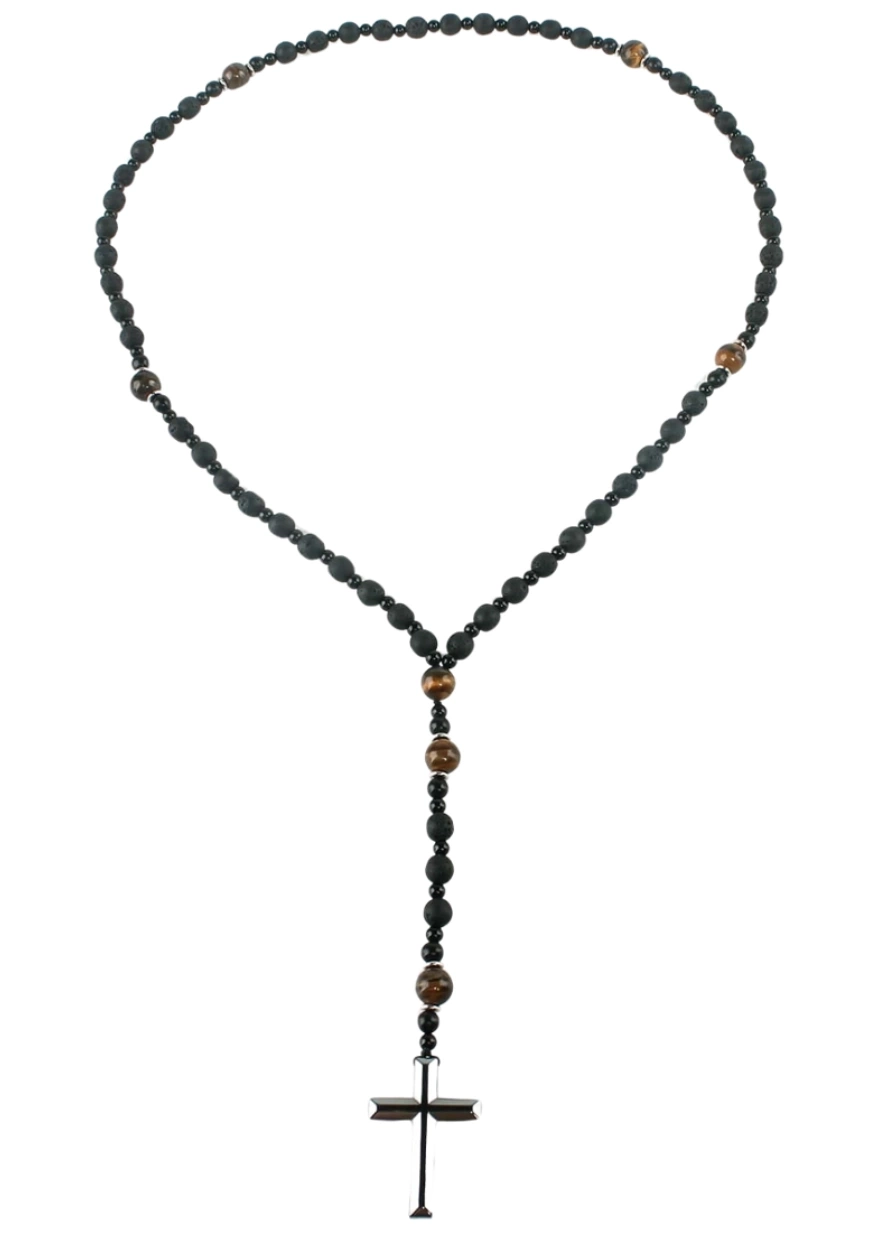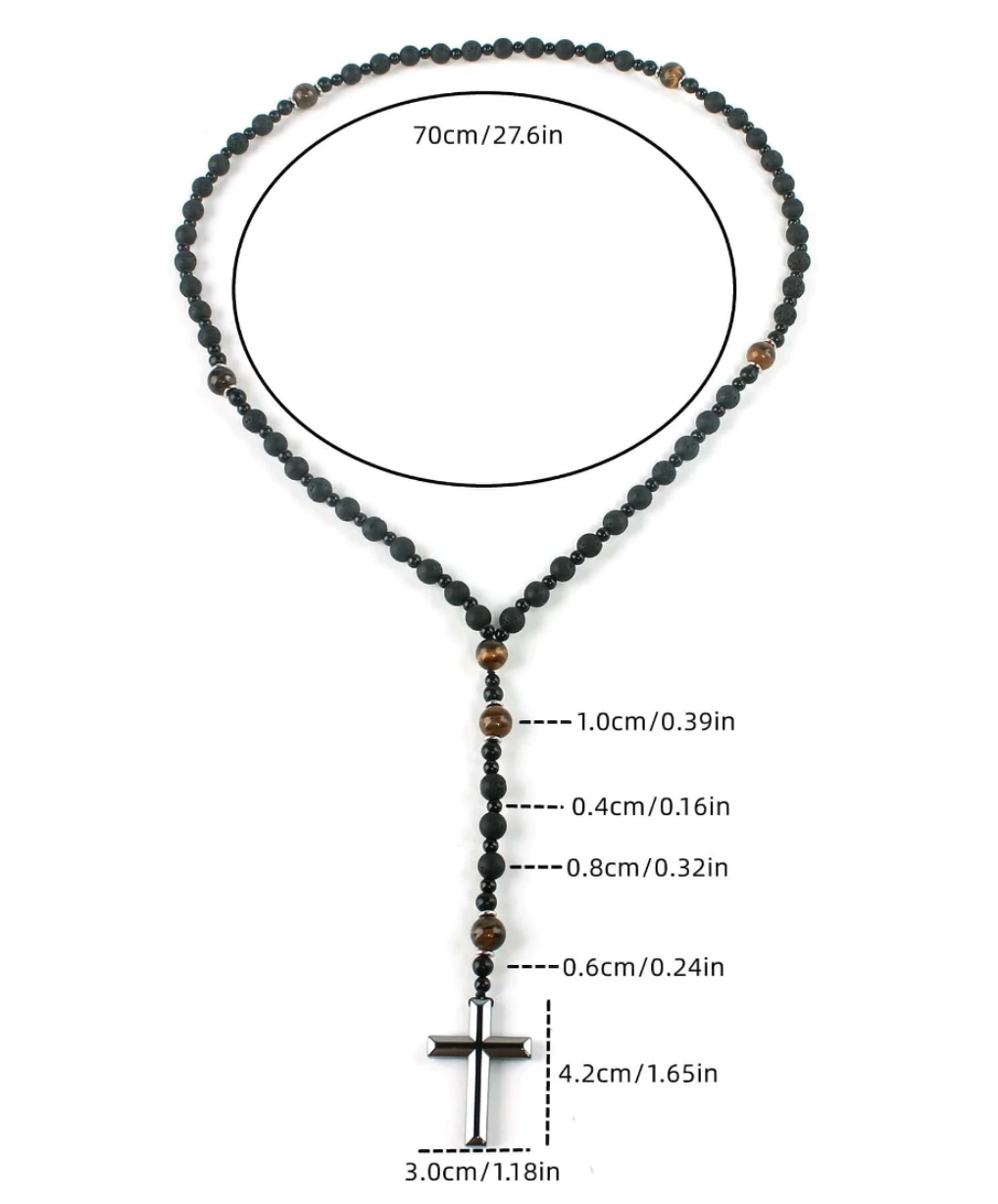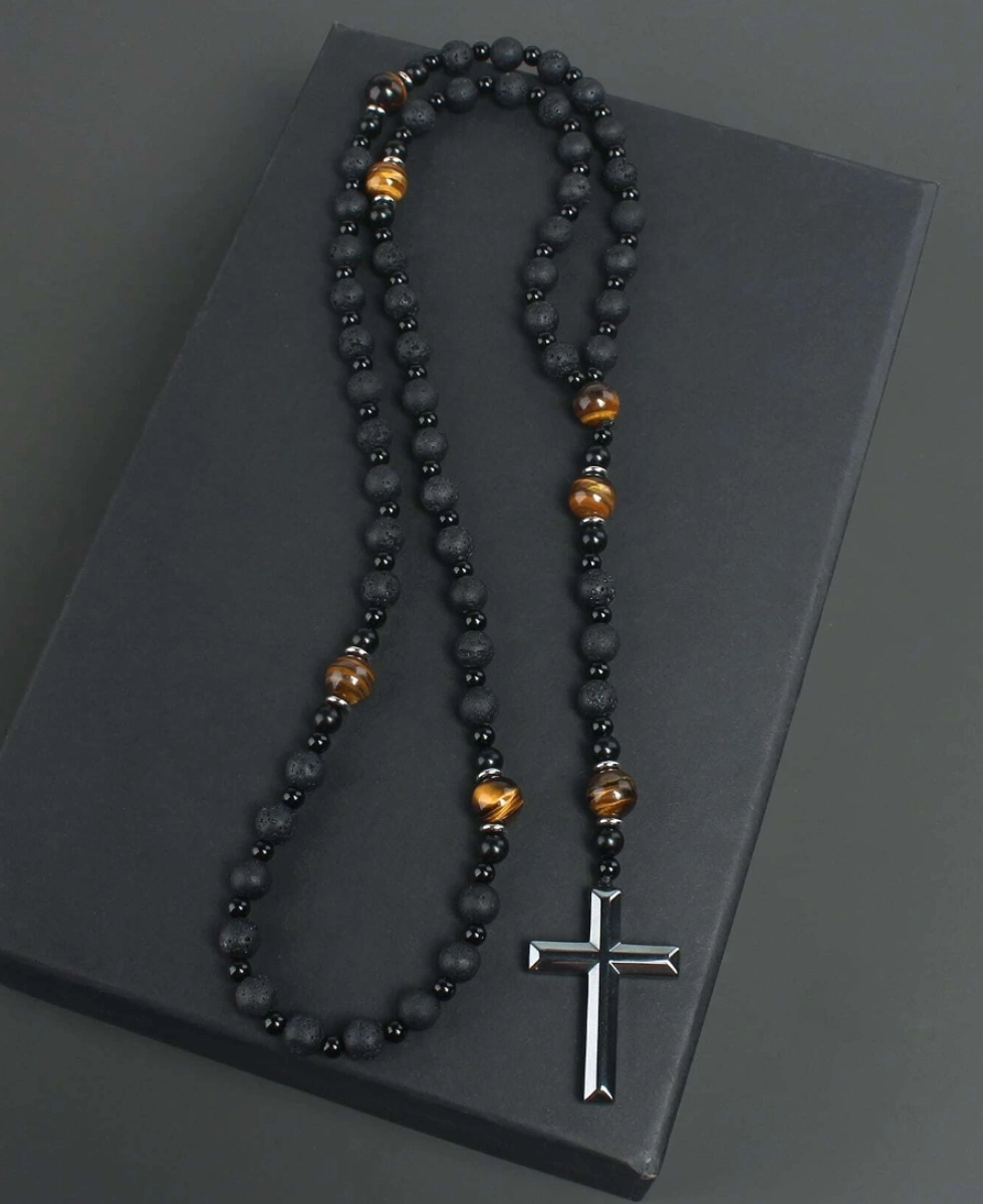 Descoperiți profunzimea și caracterul extraordinar al colierului nostru Rozariu - perfect atât pentru bărbați, cât și pentru femei. Realizat din rocă vulcanică naturală și împodobit cu o piatră ochi de tigru, acest rozariu negru elegant este unic în toate privințele.