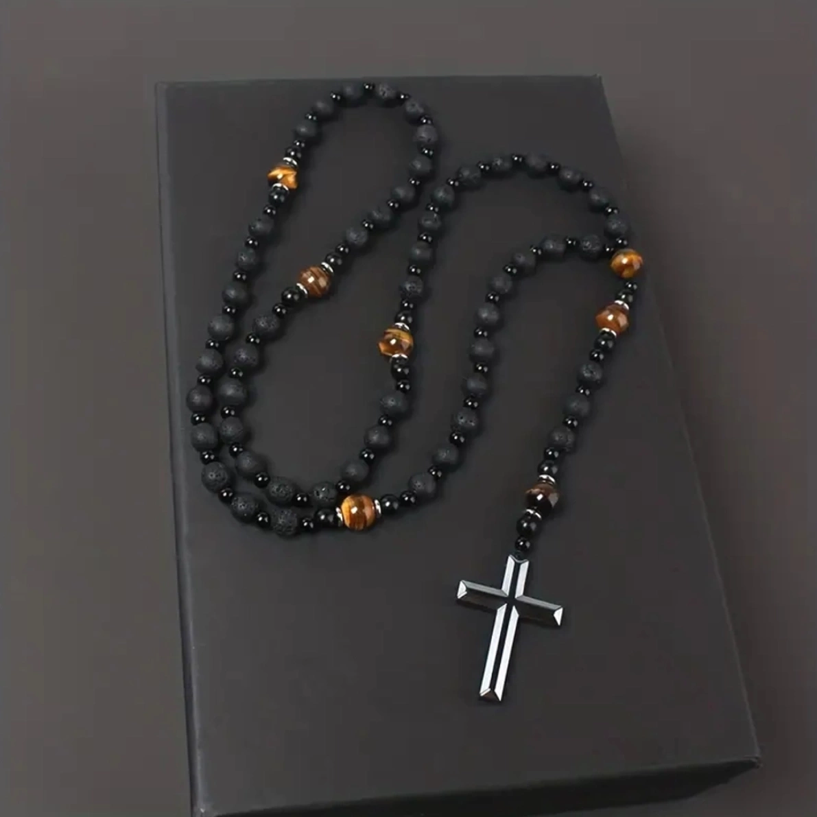 Colier Rozariu pentru bărbați, pandantiv cu ochi de tigru din stâncă vulcanică