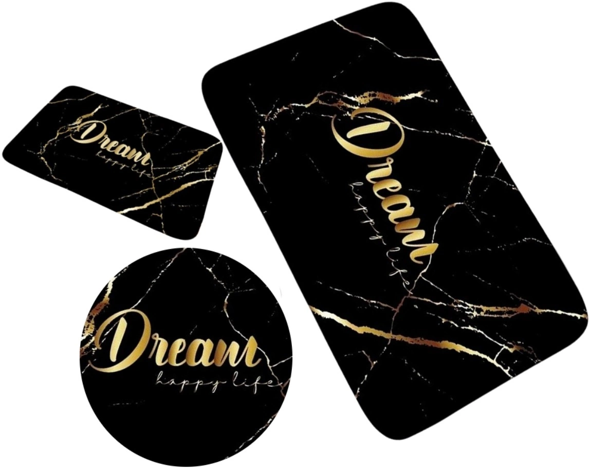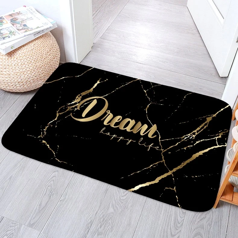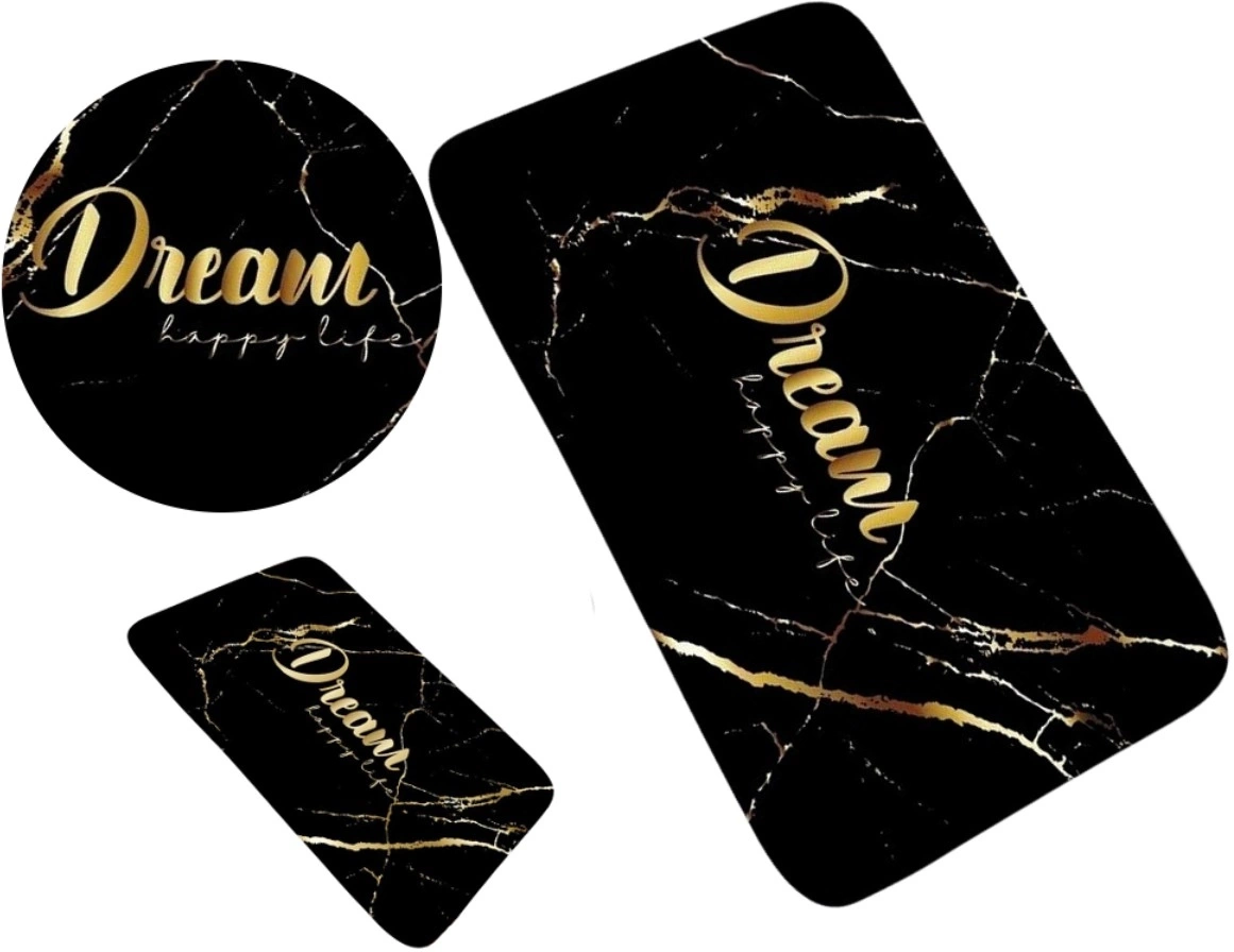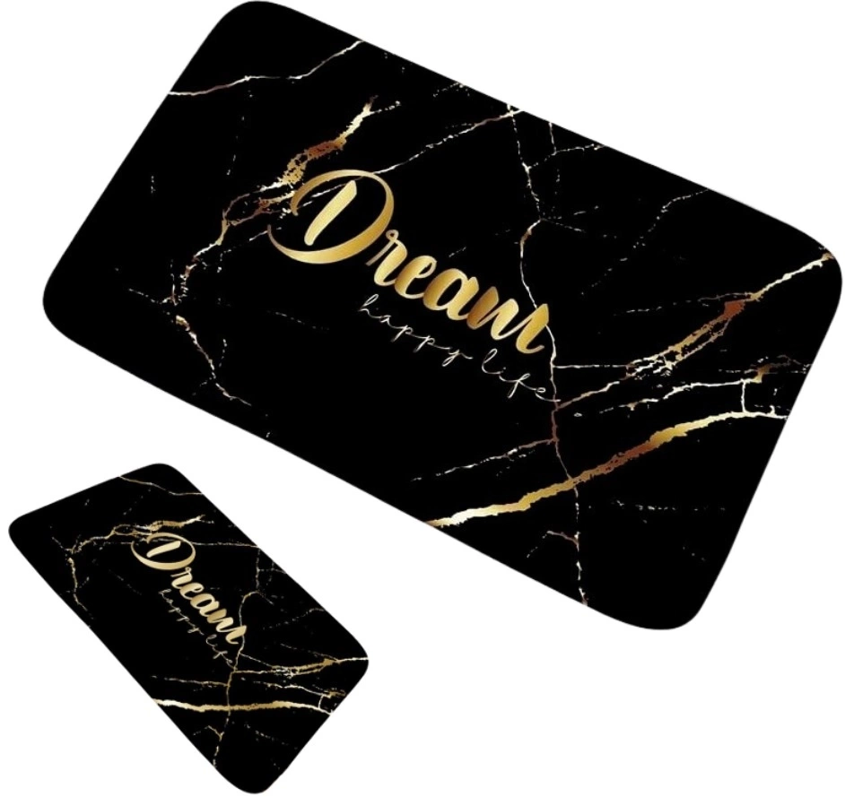 Dimensiunile covorașului sunt de 40 cm x 60 cm. Acest produs a fost realizat în culoarea neagră. Are o imprimare în relief pe suprafața sa, făcând covorașul să arate ca marmura neagră, precum și o inscripție în limba engleză cu litere de culoare aurie.