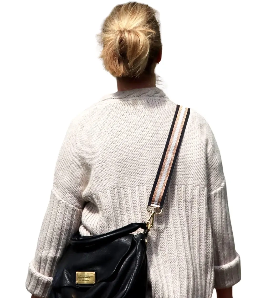 Lată reglabilă pentru geanta rucsac. Produsul pe care îl oferim este o curea din bandă împletită din poliester. Produsul este decorat cu dungi alungite în trei culori. Există negru pe margini, urmat de bej și alb în mijloc.