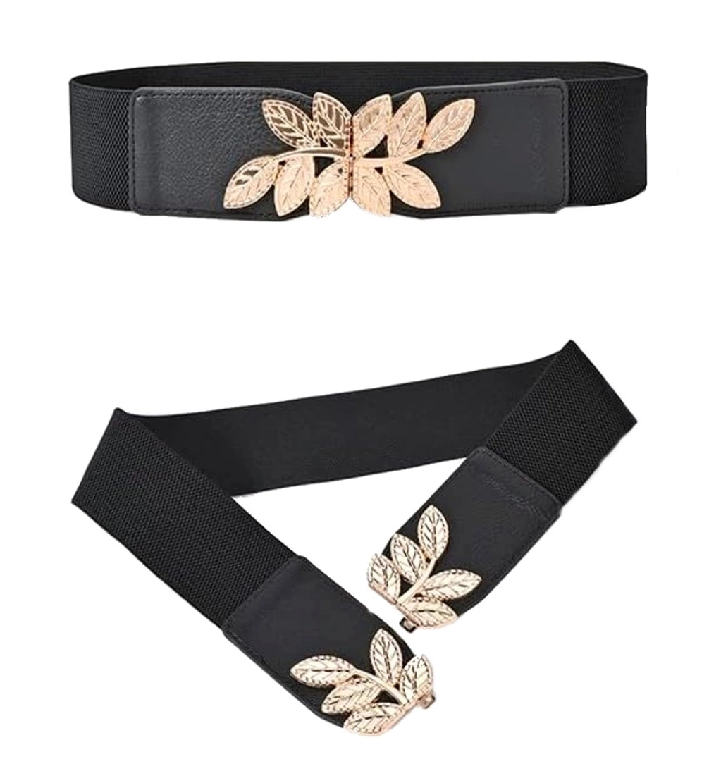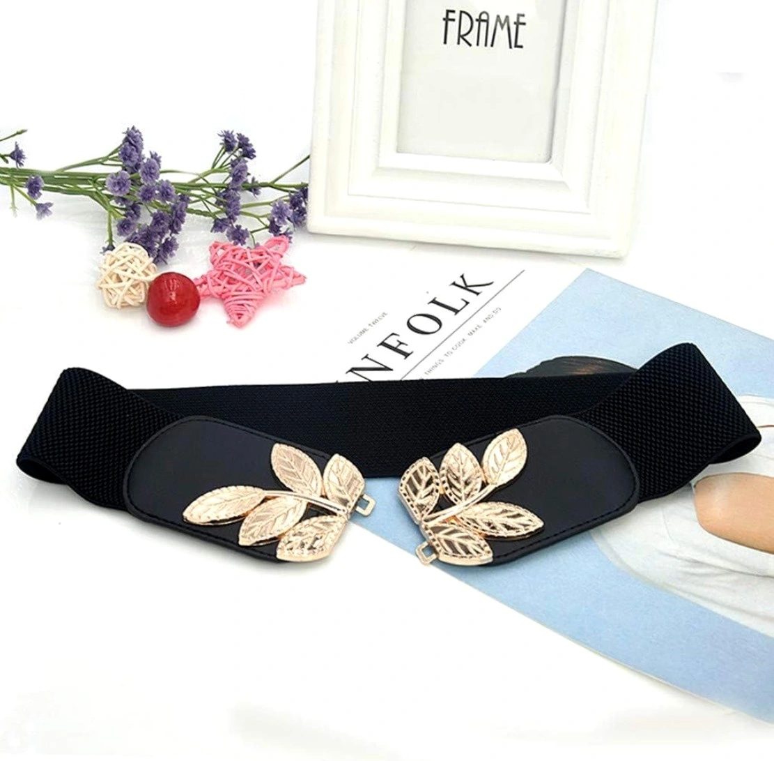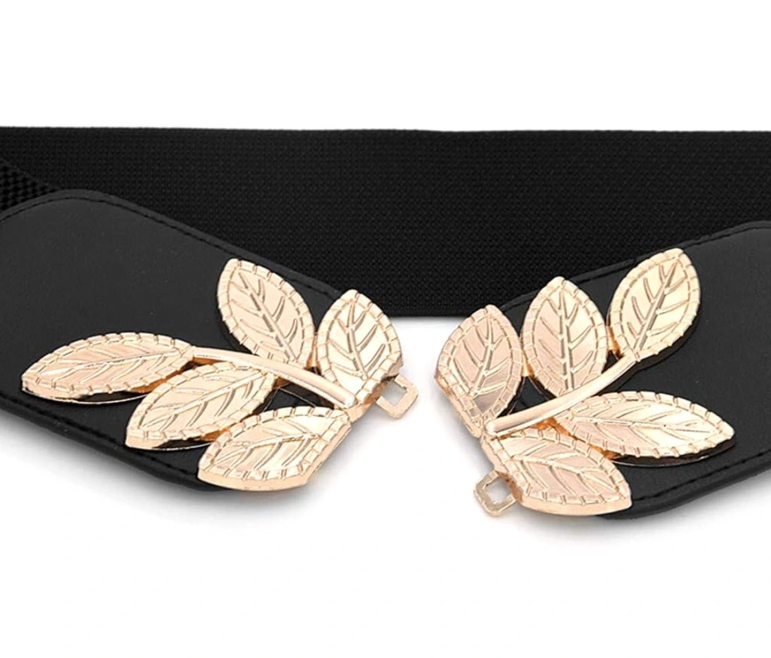 Curea elastică pentru femei cu cataramă decorativă cu frunze, cu accente aurii