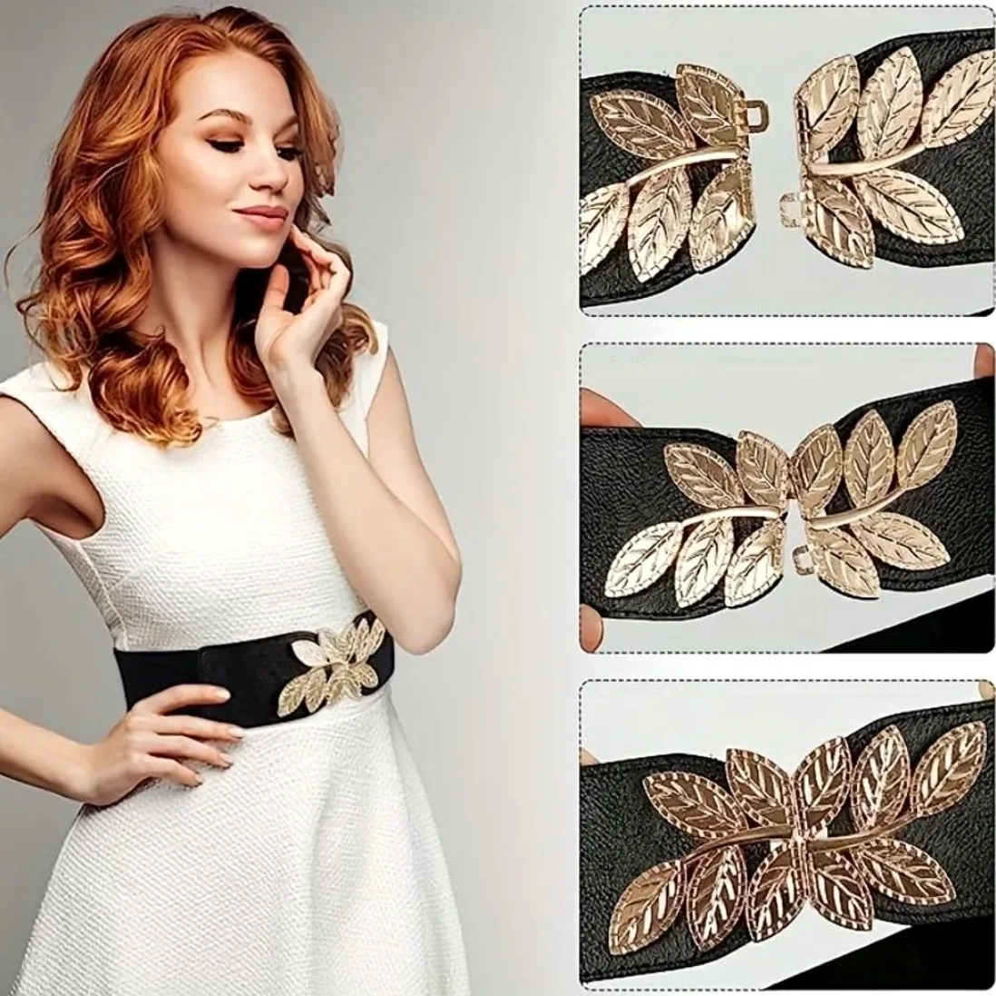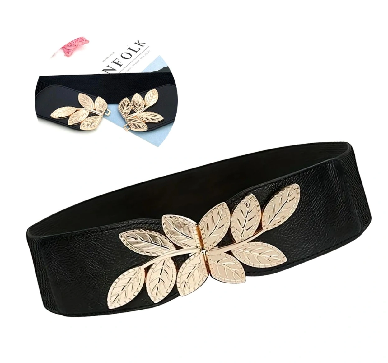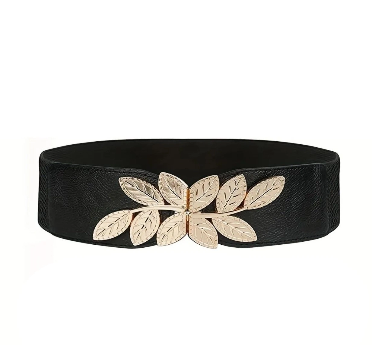 Curea elastică pentru femei cu cataramă decorativă cu frunze, cu accente aurii