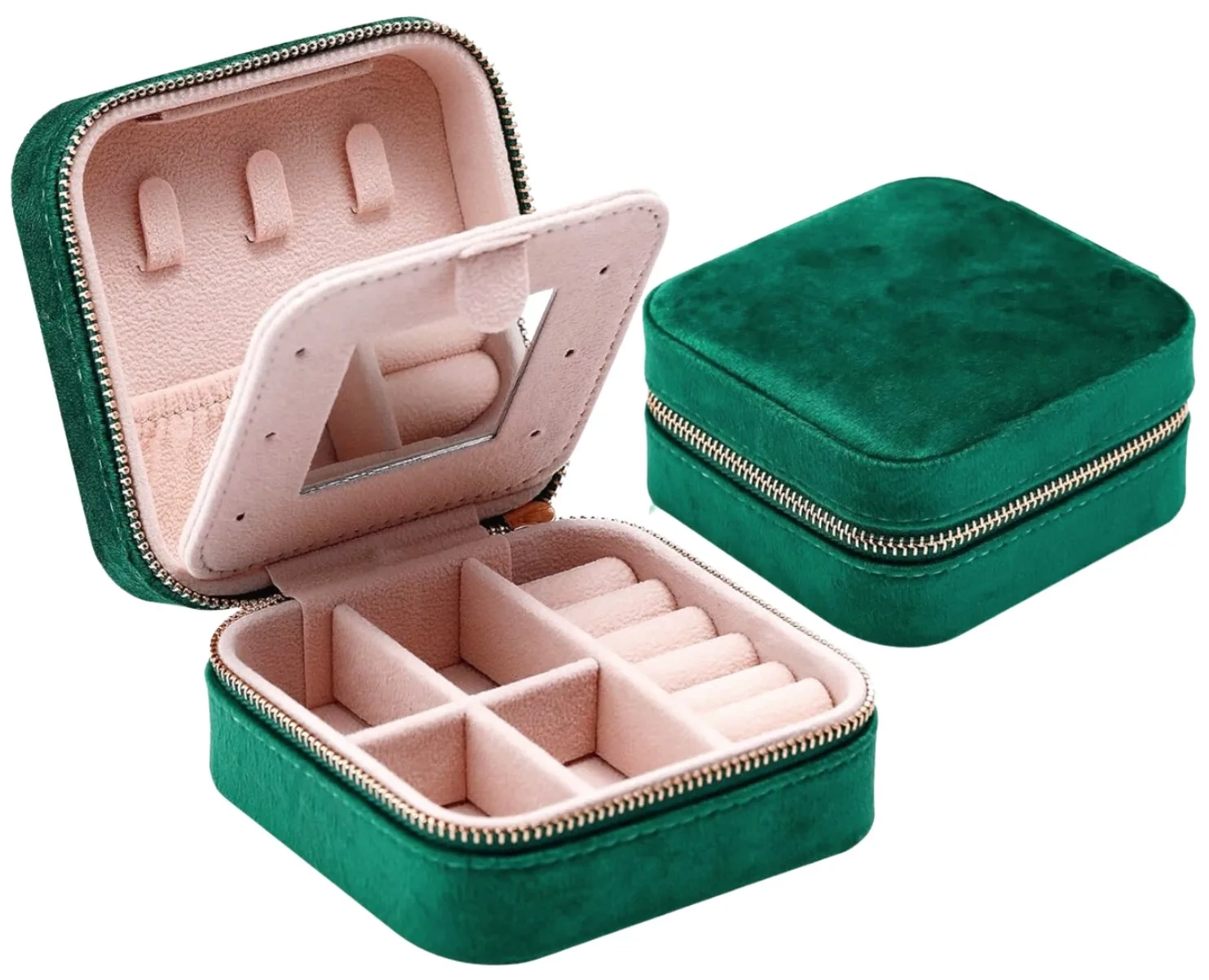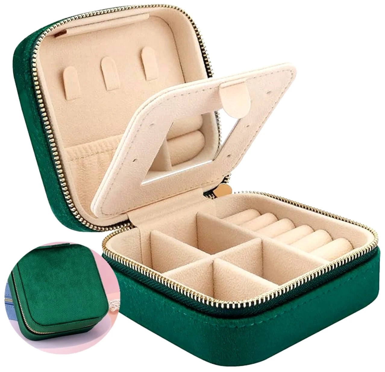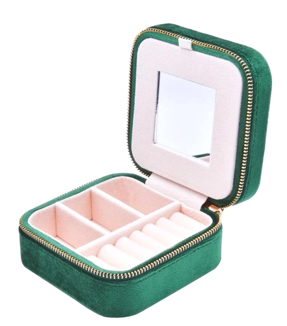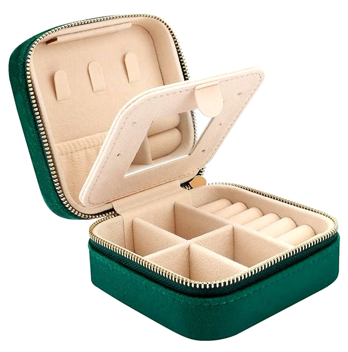 Cutia organizator de bijuterii casetă cu oglindă este acoperită cu o țesătură elegantă asemănătoare cu cea din piele întoarsă, într-o culoare verde la modă. Caracterul său unic este dat de un fermoar din metal auriu cu o etichetă aurie rotundă.