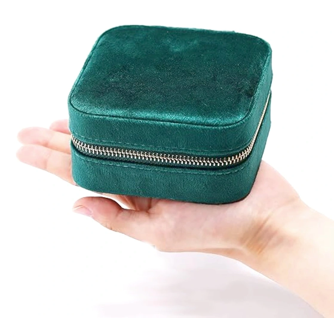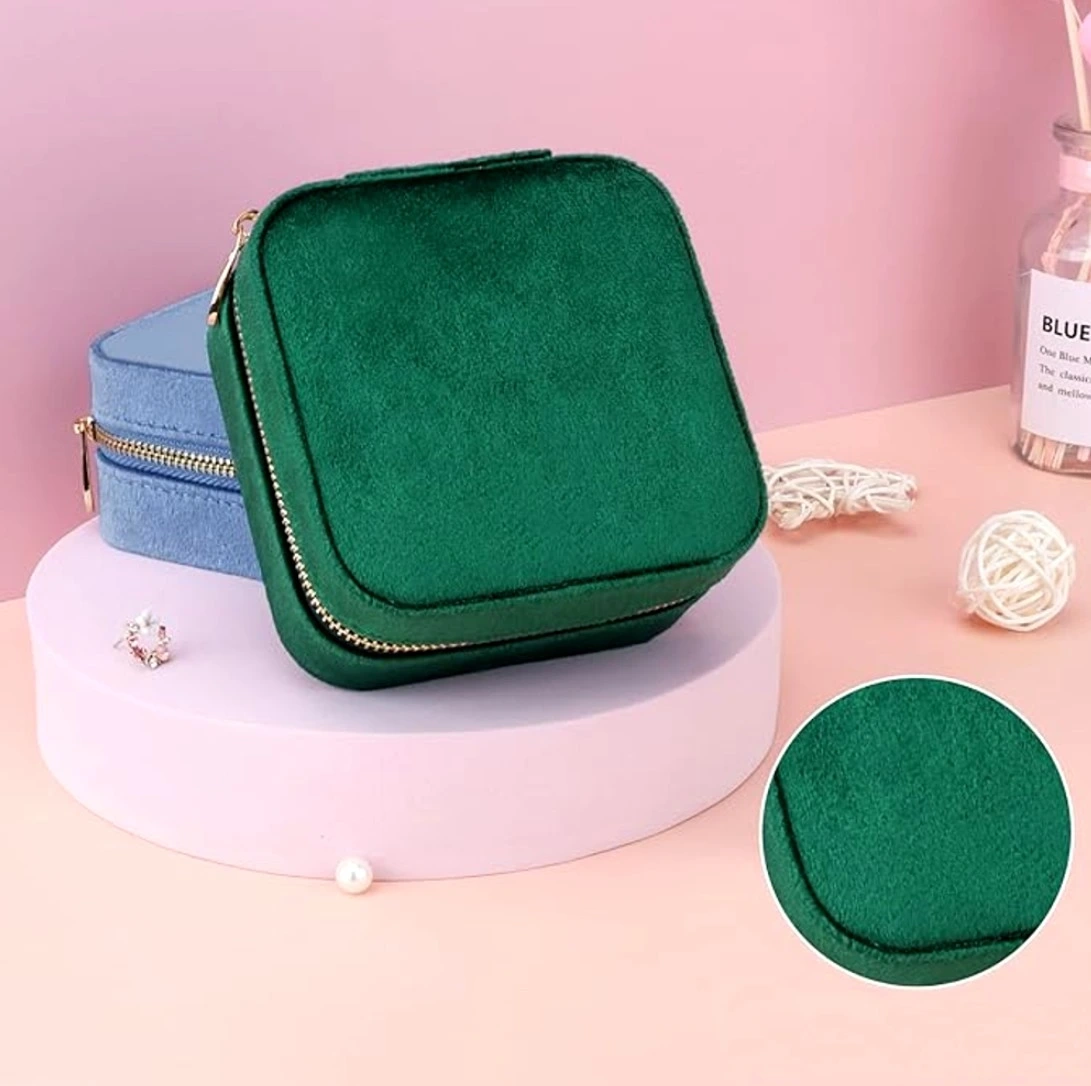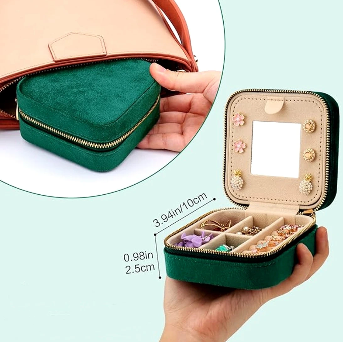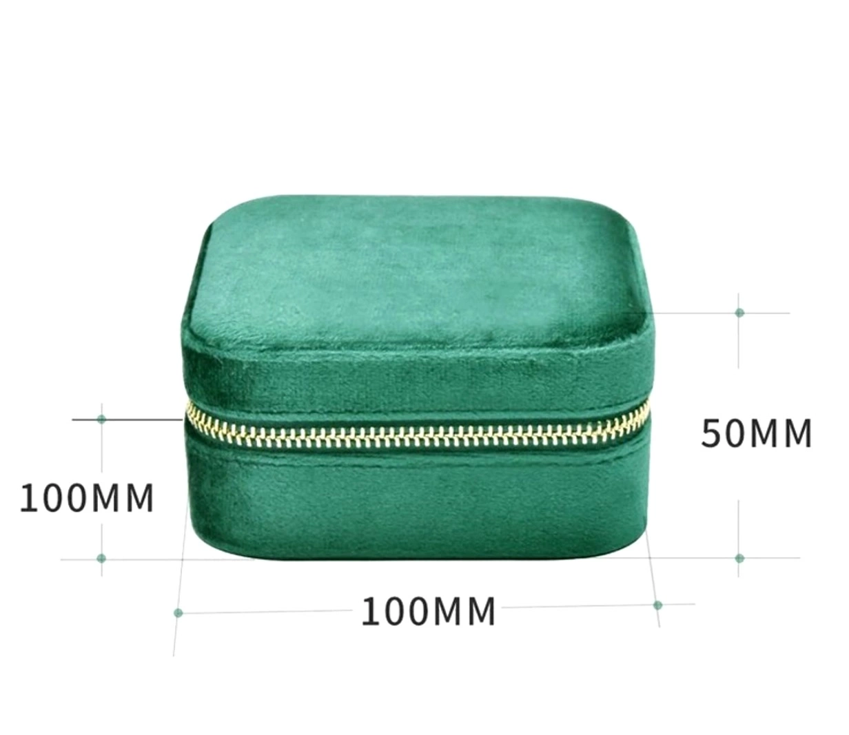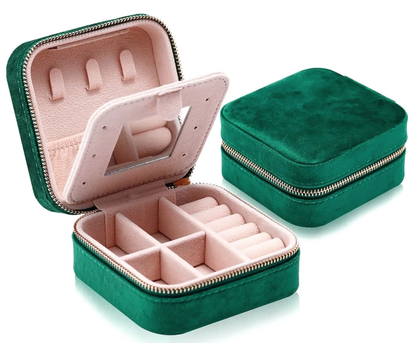 Cutia organizator de bijuterii casetă cu oglindă este acoperită cu o țesătură elegantă asemănătoare cu cea din piele întoarsă, într-o culoare verde la modă. Caracterul său unic este dat de un fermoar din metal auriu cu o etichetă aurie rotundă.
